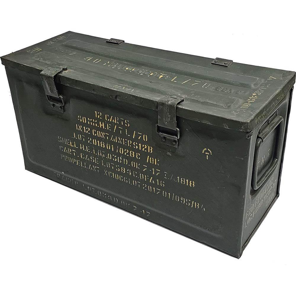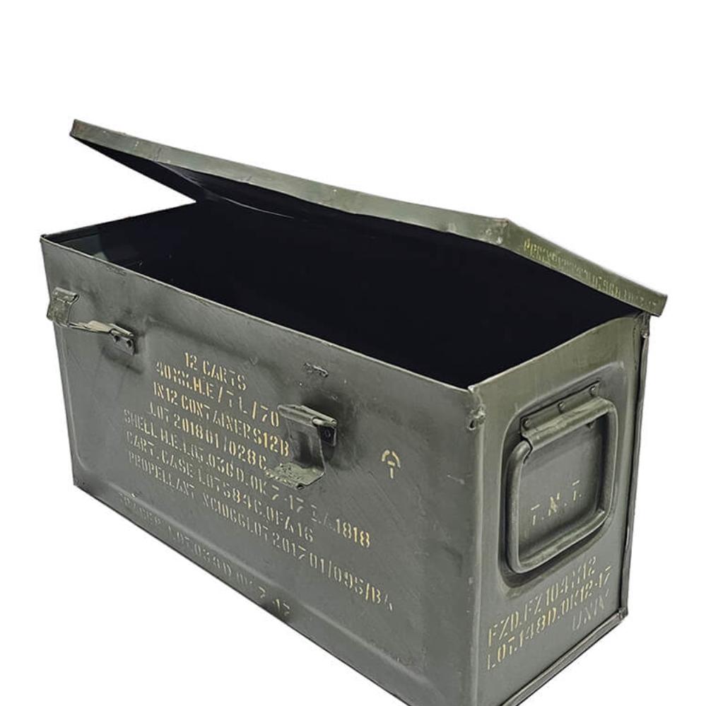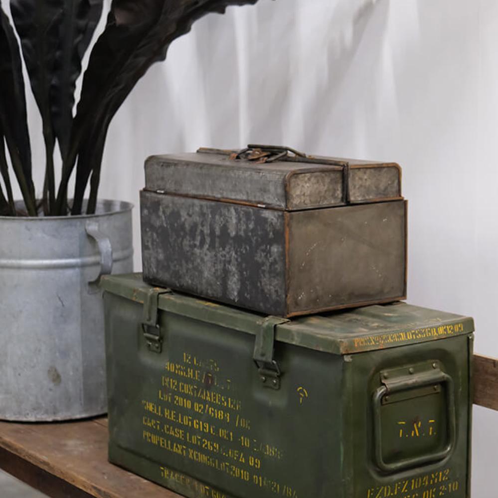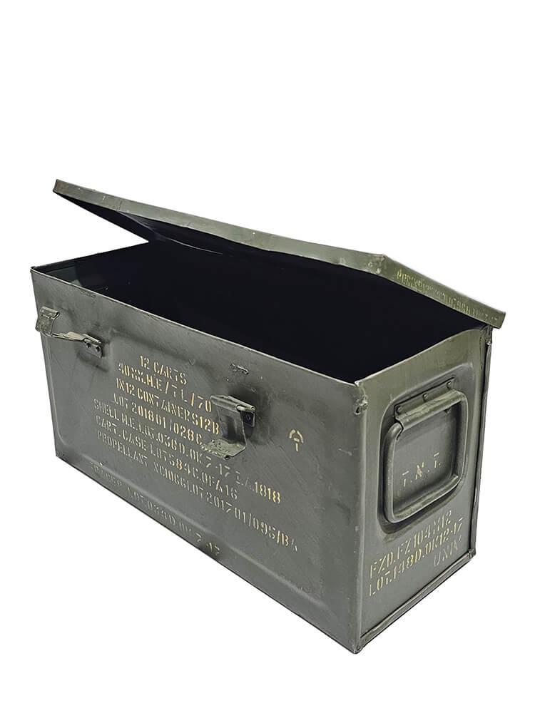 Rustikal, roh und mit einer Geschichte zu erzählen. Diese originale Militärkiste aus massivem, patiniertem Eisen hat einiges erlebt – und das sieht man auf die bestmögliche Weise. Die tiefgrüne Farbe, die charakteristischen gelben Markierungen und die robusten Verschlüsse verleihen ihr einen authentischen industriellen Charme. Nutzen Sie sie als rustikale Aufbewahrungslösung in einem Geschäft, als coolen Beistelltisch in einer Lounge oder als Blickfang in einer Bar oder einem Restaurant. Dank ihrer praktischen Größe lässt sie sich leicht platzieren, während das robuste Metall für Langlebigkeit sorgt. Ein cool Kasten mit viel Authentizität und Charakter.