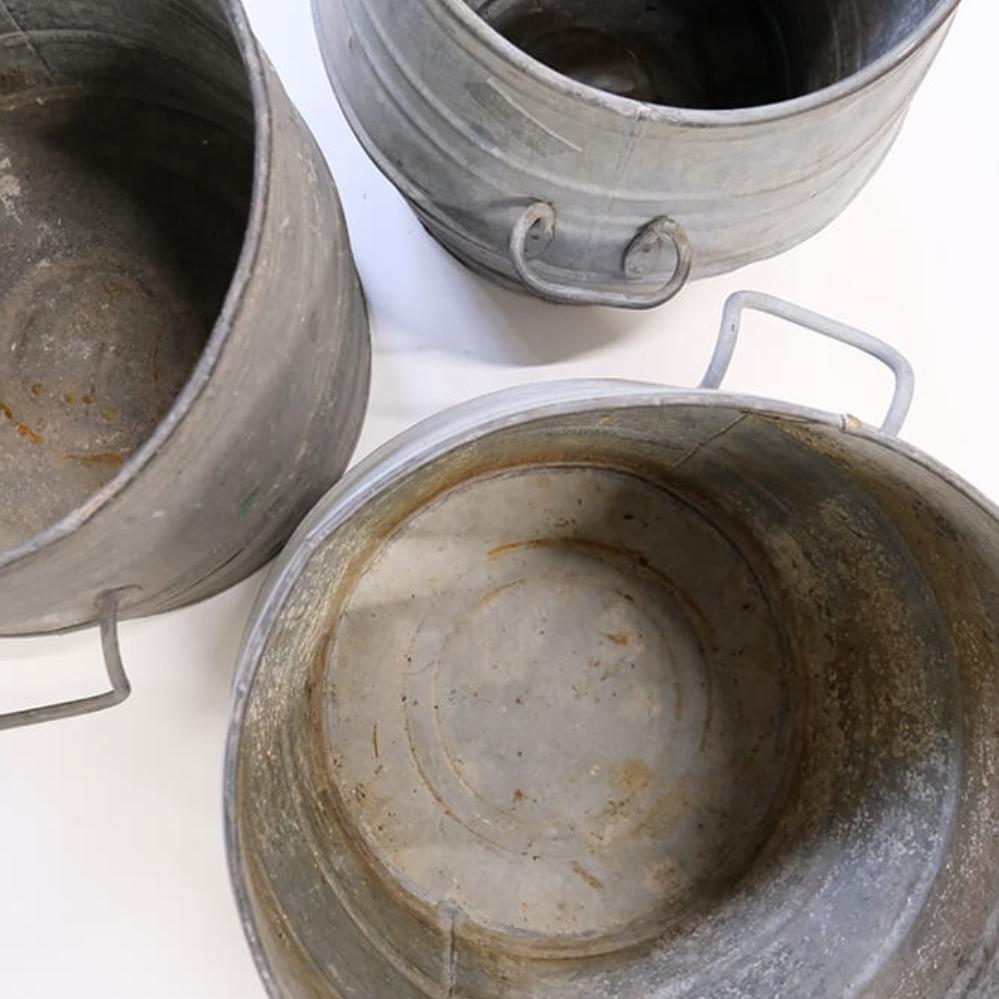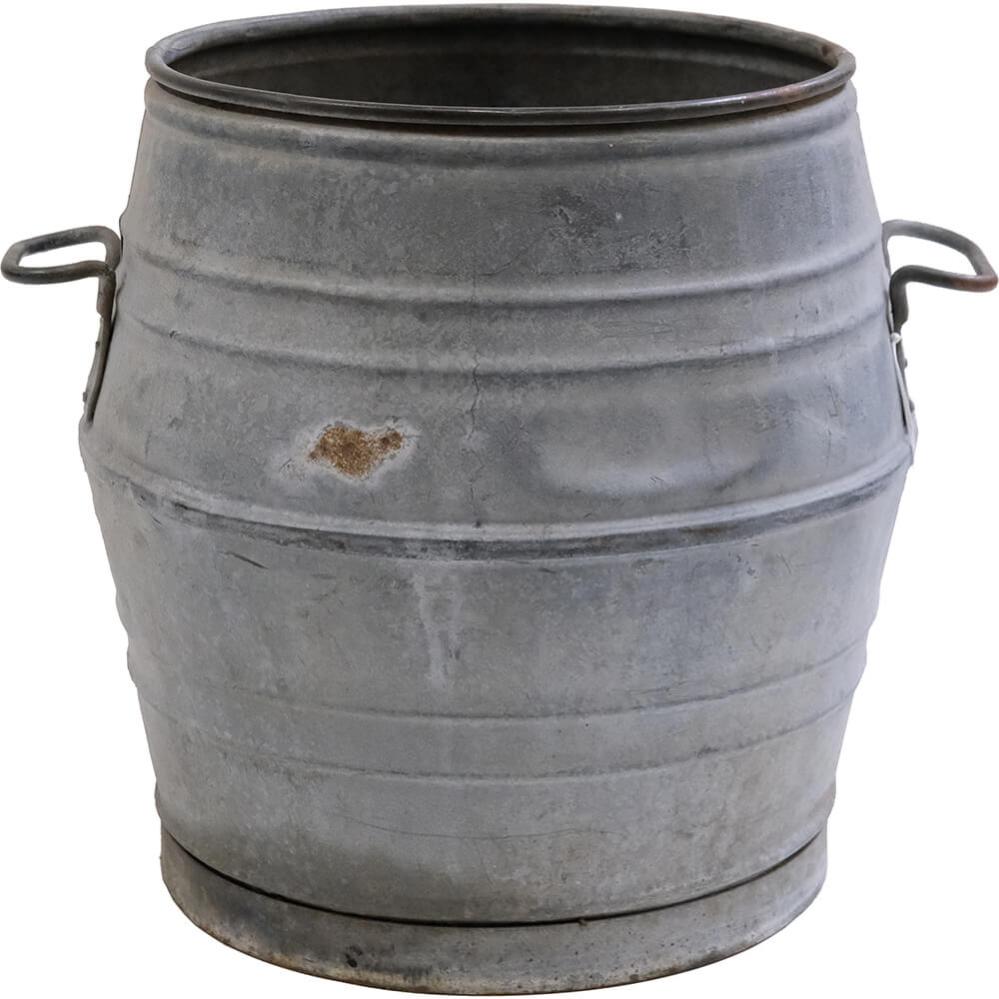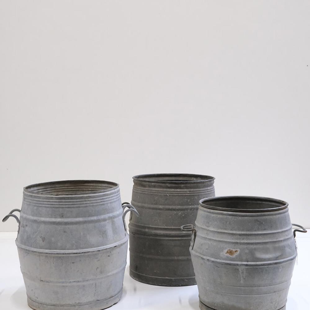 Diese alten Zinkfässer haben mit ihrer runden, leicht gewölbten Form und den praktischen Seitengriffen einen ganz besonderen Charme. Jedes Fass ist ein Unikat, mit Variationen in der Größe, Form und Patina, die ihm einen authentischen und rustikalen Ausdruck verleihen. Die Zinkfässer können sowohl im Innen- als auch im Außenbereich dekorativ eingesetzt werden. Befüllen Sie sie mit Pflanzen, nutzen Sie sie zur Aufbewahrung von Brennholz, Decken oder Spielzeug, oder lassen Sie sie frei als rohes, industrielles Statement stehen. Ihre Gebrauchsspuren erzählen Geschichten eines langen Lebens, und gerade diese kleinen Unterschiede machen jedes Fass zu einem Unikat.