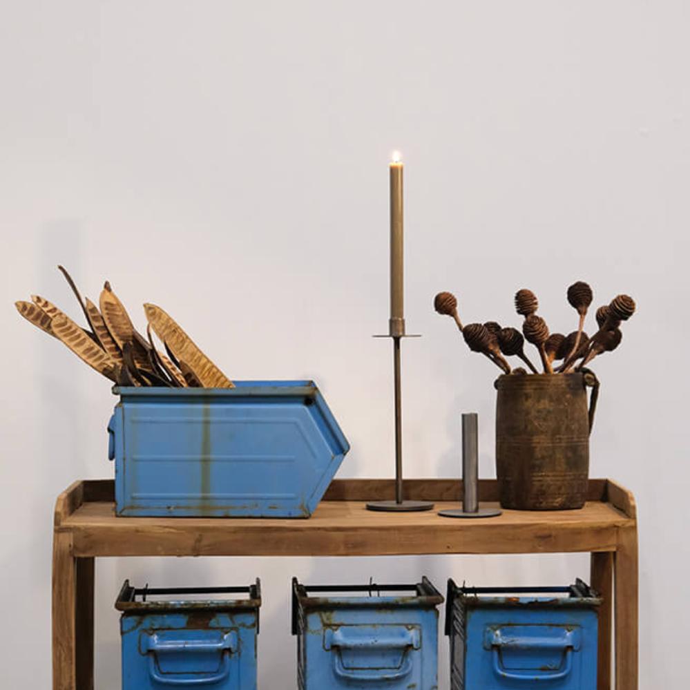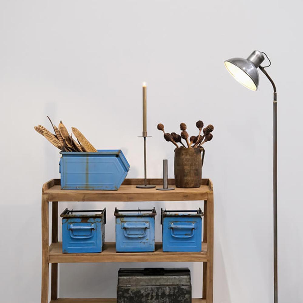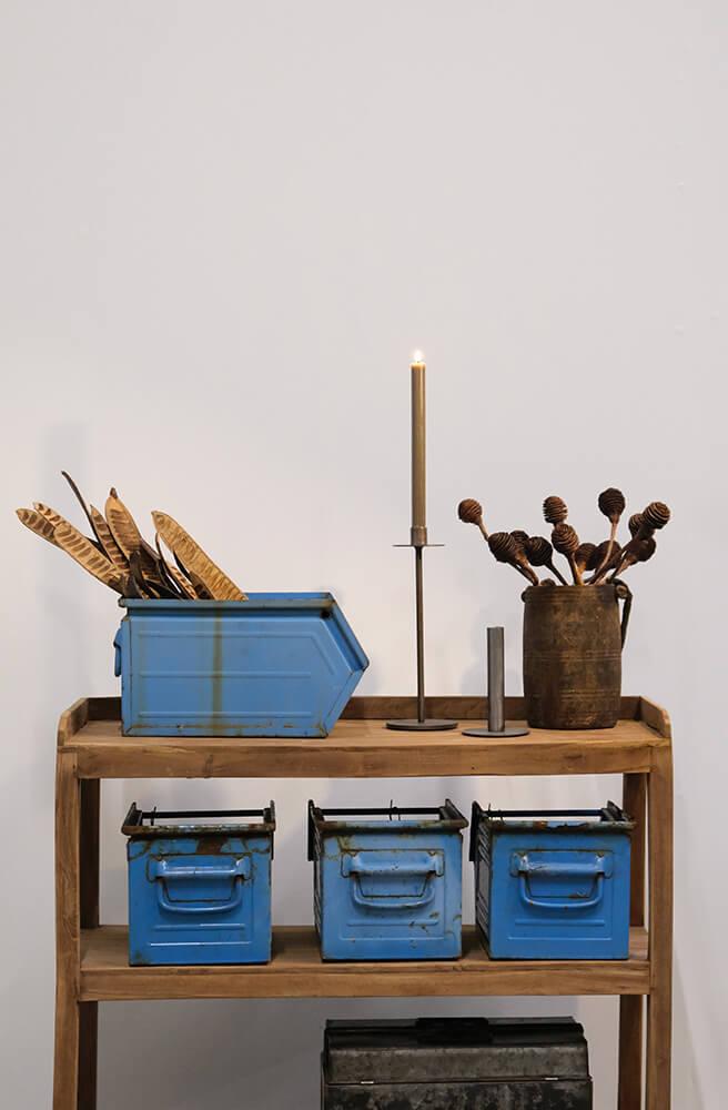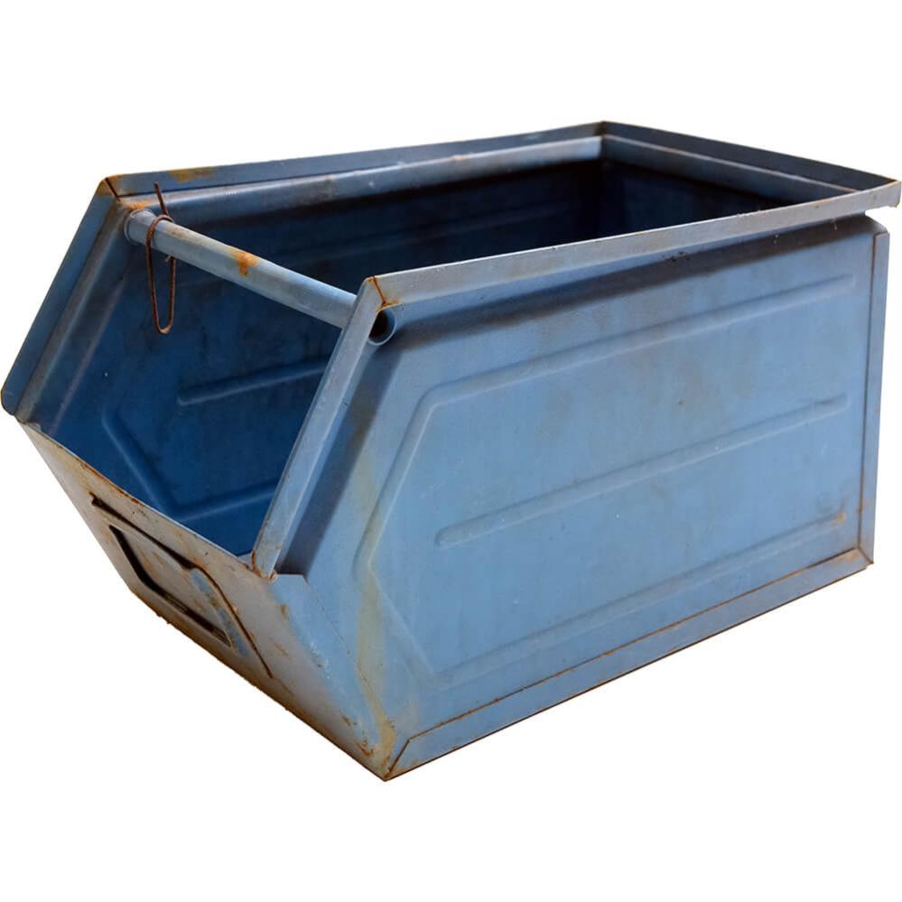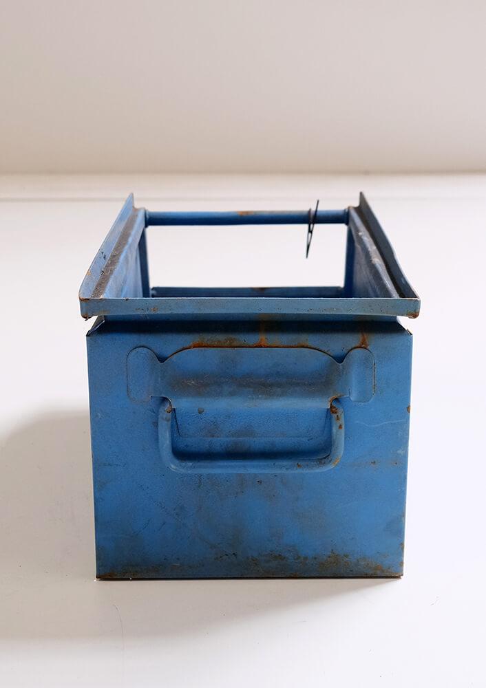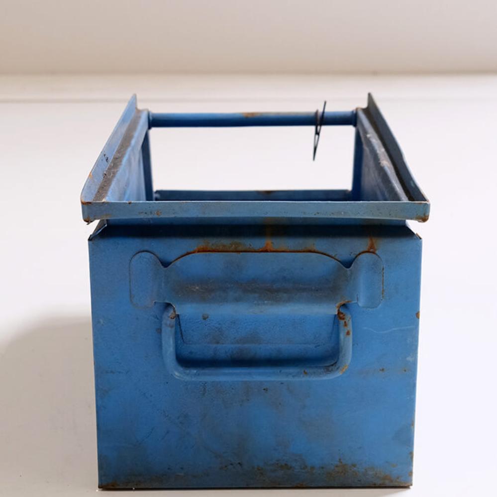 Dieser alte blaue Metallkasten strahlen Industriecharme und rohe Patina aus. Sie wurden früher in Werkstätten verwendet, und das sieht man auf die richtige Weise: kleine Gebrauchsspuren erzählen Geschichten von vielen Jahren der Nutzung. Die robusten Kasten sind nicht nur praktisch, sondern auch dekorativ. Verwenden Sie sie in der Küche für Gewürze und Flaschen, in der Werkstatt für Schrauben und Werkzeuge oder im Wohnzimmer für Zeitschriften und Kleinigkeiten. Auch in einem Geschäft oder Café eignen sie sich perfekt, um Waren auf coole und ungewöhnliche Weise zu präsentieren. Alle Kasten sind im Ausdruck einzigartig, und Farbnuancen sowie Patina können leicht variieren. Genau das verleiht ihnen ihren besonderen Charme. Eine schöne Kombination aus Funktionalität, Nostalgie und rohem Industrielook, die jeder Einrichtung Charakter verleiht.