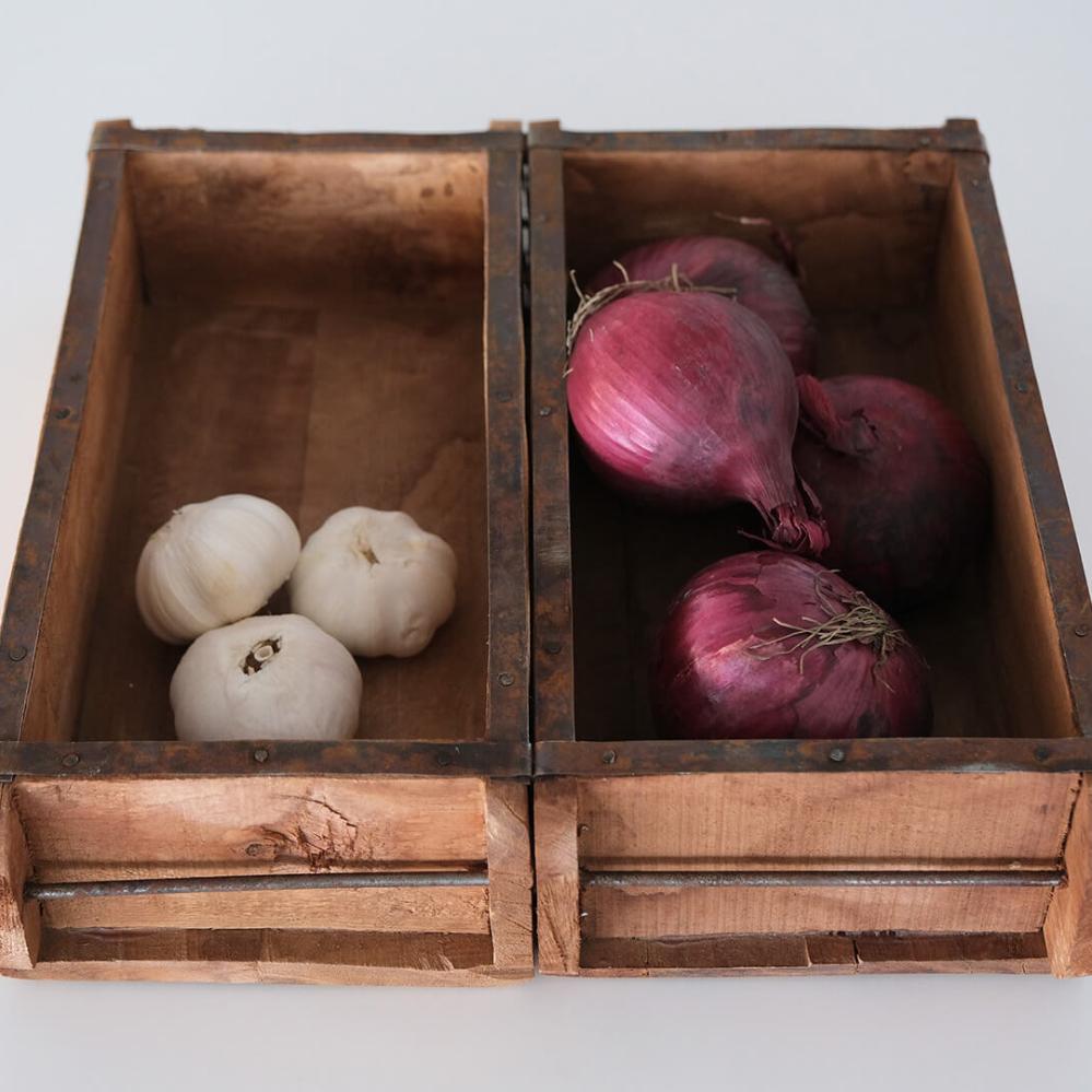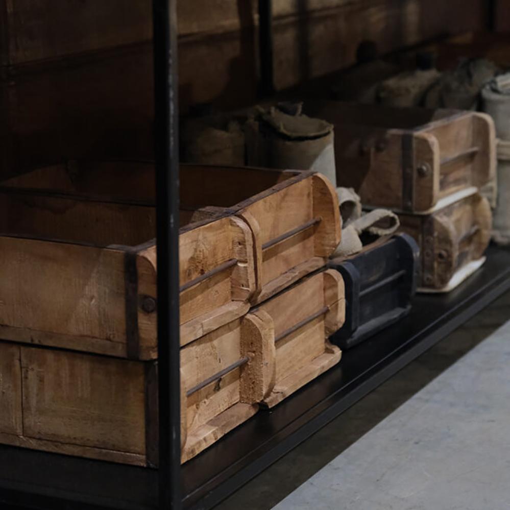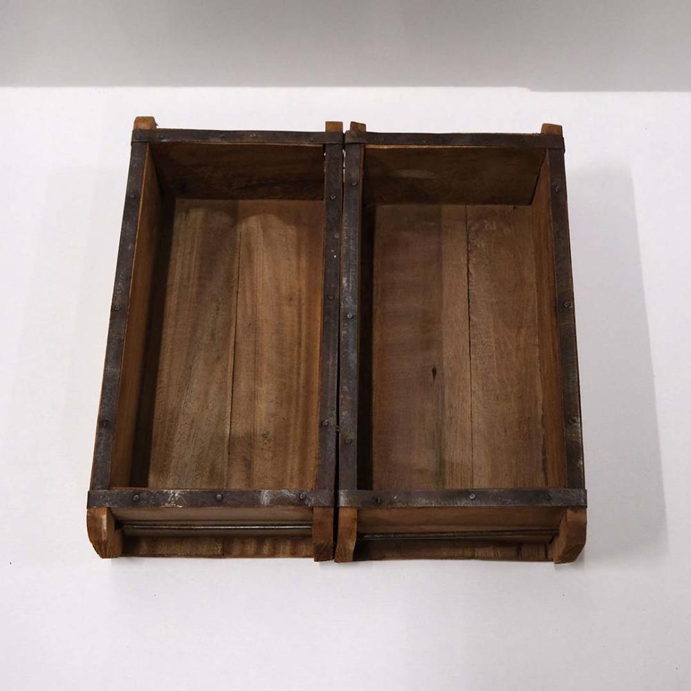 Doppelte Ziegelform, in der zwei Kasten aus Altholz zusammengefügt sind. Alle sind handgefertigt und daher sind keine zwei gleich. Verwenden Sie die Ziegelform als rustikale Aufbewahrung für Ihre Nippsachen, in der Küche für Öle oder Gewürze oder machen Sie eine schöne Dekoration darin. Sie können die Form auch an die Wand hängen und als Wandregal verwenden.