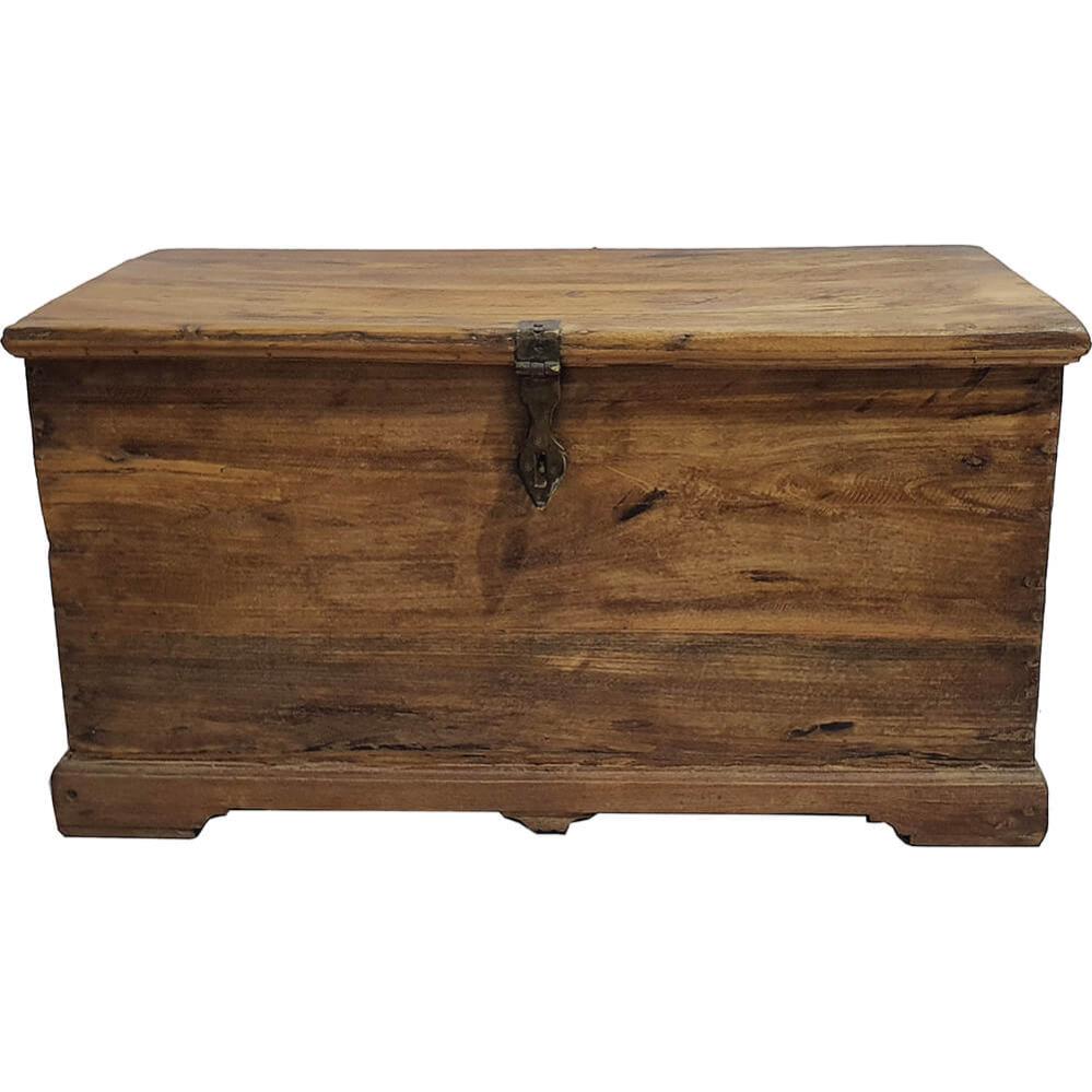 Diese alte Holzkiste strahlt Geschichte und Handwerkskunst aus. Mit ihrem schlichten Erscheinungsbild und der soliden Konstruktion ist sie ein funktionales Möbelstück, das sich dezent zurückhält und dennoch Wärme und Charakter in den Raum bringt. Praktische Metallgriffe an den Seiten und ein klassischer Verschluss an der Vorderseite ermöglichen es, den Deckel bei Bedarf zu verriegeln. Der geräumige Innenraum des Holzkiste eignet sich perfekt zur Aufbewahrung von Decken, Schuhen, Spielzeug oder Schätzen, und die flache Oberseite kann als zusätzliche Sitzgelegenheit oder als dekorative Ablagefläche genutzt werden. Ein rustikales und natürliches Element, das sowohl in modernen als auch in rustikalen Einrichtungen hervorragend zur Geltung kommt.