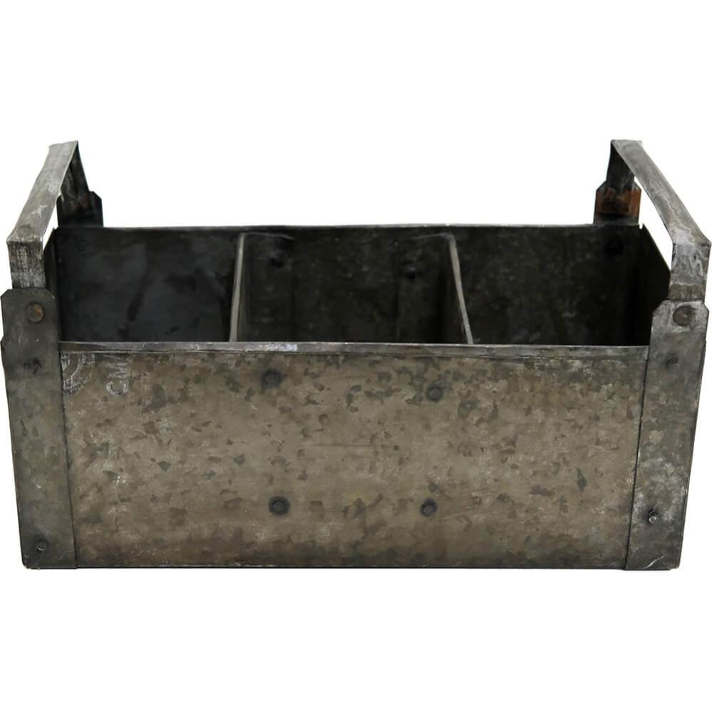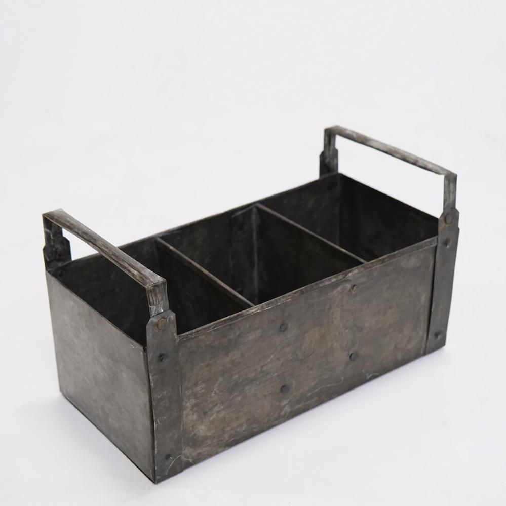 Schöner und rustikaler Zinkkasten mit 3 Einteilungen und 2 Griffen. Dieser kleine Kasten hat viele Verwendungszwecke. Verschaffen Sie sich einen Überblick über alle Nippsachen oder verwenden Sie sie für Werkzeug, Strickwaren, Kräuter, Öle oder im Kinderzimmer für Buntstifte und Blöcke. Wenn der Kasten in einem Raum überflüssig wird, können Sie ihn an einer anderen Stelle in Ihrem Dekor verwenden.
