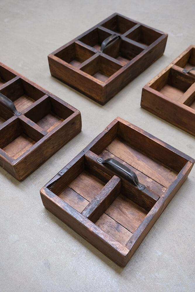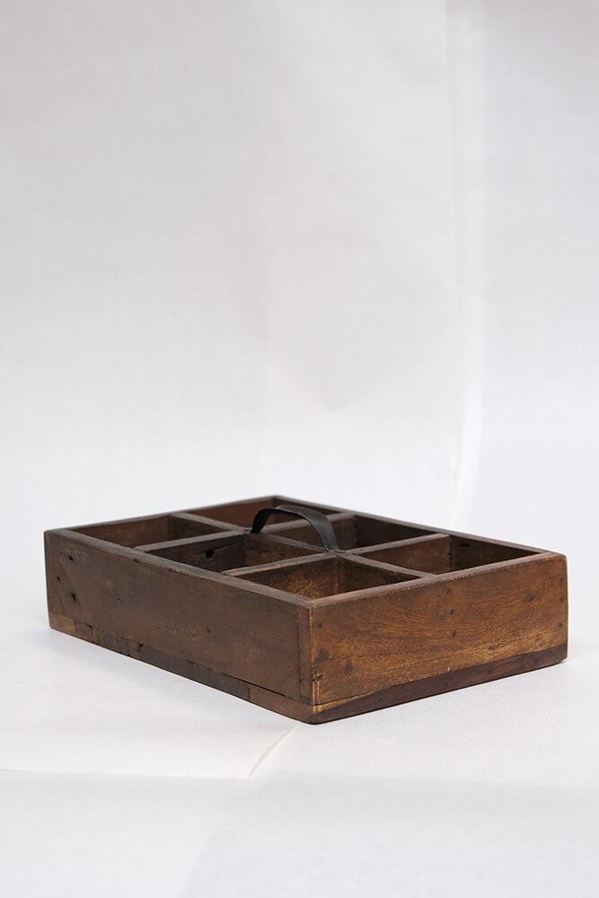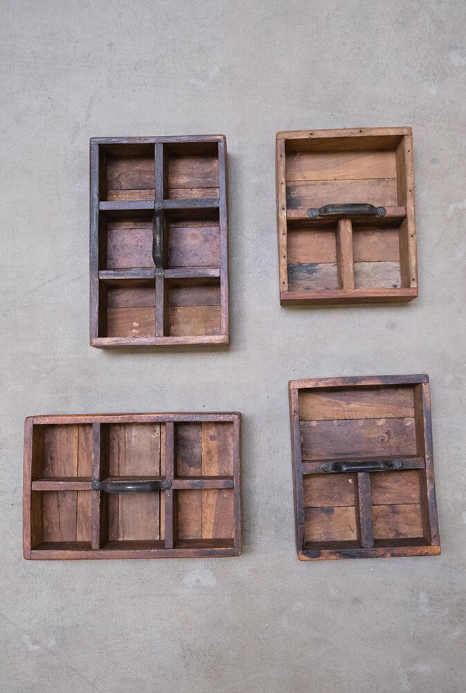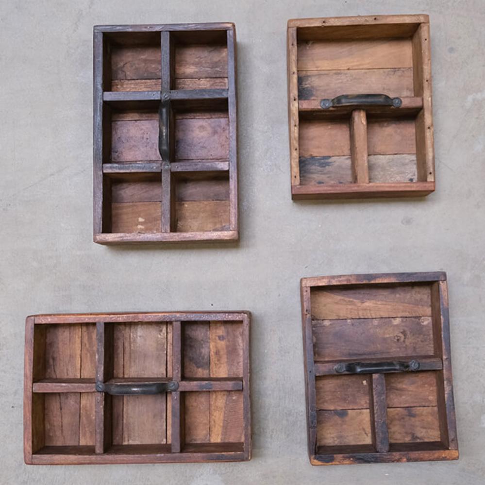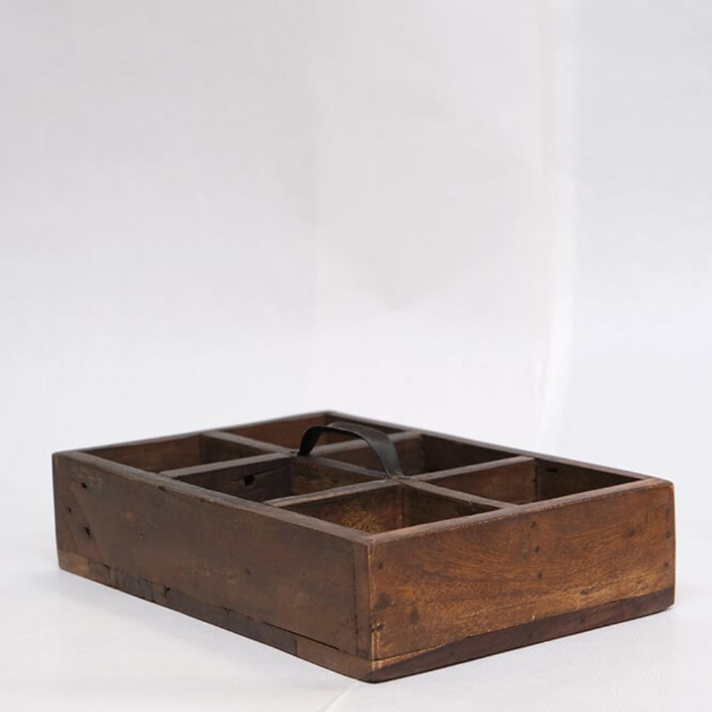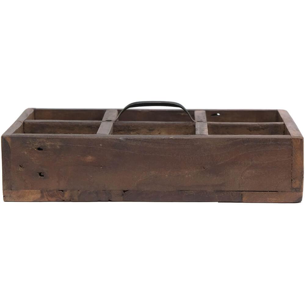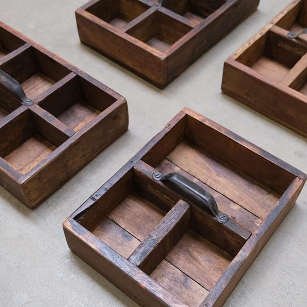 Diese Holzkisten mit Griffen bieten rustikale Aufbewahrung mit charaktervollem Charme. Sie bestehen aus Altholz und sind voller Kratzer, Farbnuancen und kleiner Unebenheiten, die nur echtes Handwerk und ein früheres Leben mit sich bringen können. Jeder Kasten ist mit einem robusten Metallgriff ausgestattet und in 3 oder 6 Fächer unterteilt, sodass kleine Dinge stilvoll organisiert werden können. Die Breite variiert zwischen 21 und 32 cm, und genau wie gute Freunde ist kein Kasten wie der andere. Das Unperfekte gehört zum Charme dazu. Verwenden Sie die Holzkasten in Ihrem Café oder Restaurant für Besteck, Servietten oder Gewürze. Oder zu Hause für Bastelmaterial, Öle oder als rustikale Dekoration auf Regalen und Tischen. Ein Aufbewahrungskasten, der Funktionalität und Charakter in jede Einrichtung bringt.