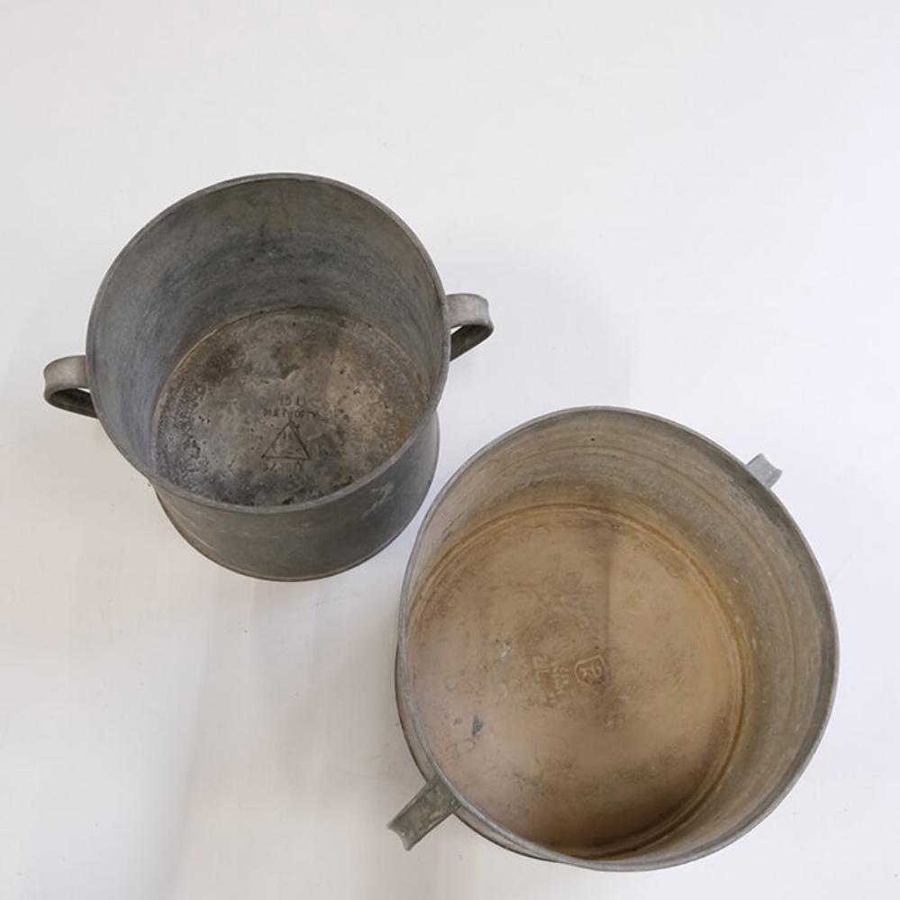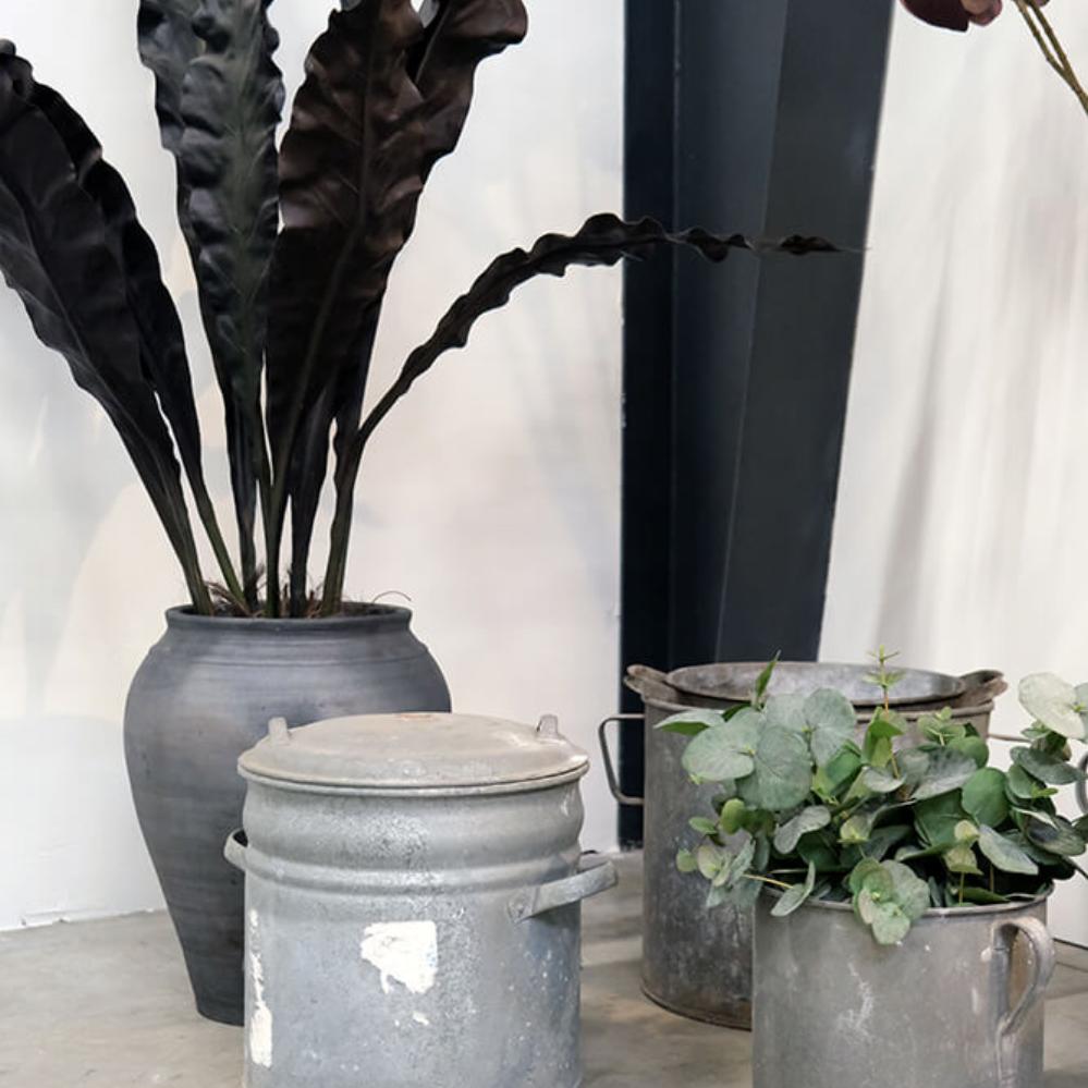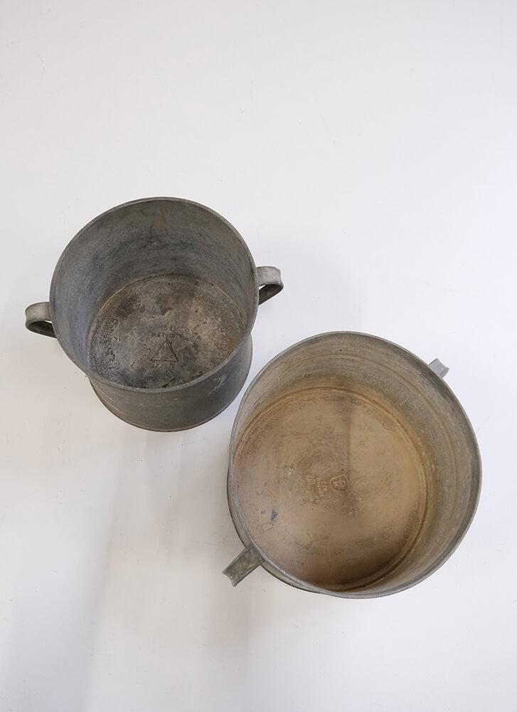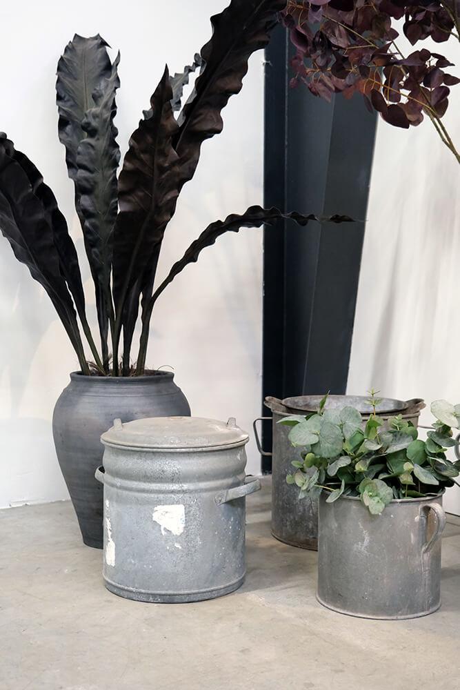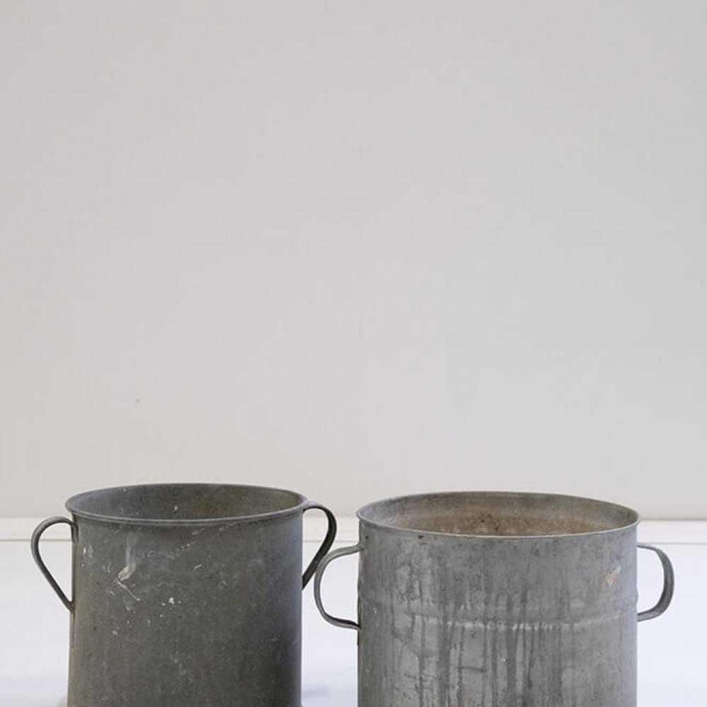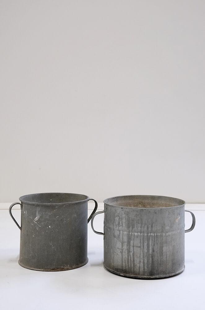 Charmante alte Zinkeimer mit praktischen seitlichen Henkeln, die das Tragen erleichtern. Die Eimer variieren leicht in der Höhe, Breite und Erscheinung, und gerade diese kleinen Unterschiede verleihen ihnen ihren besonderen Charakter. Die rauen Oberflächen mit schönen Gebrauchsspuren und Patina erzählen ihre eigene Geschichte von Zeit und Nutzung und machen die Eimer zu idealen Dekorationselementen. Verwenden Sie sie zum Beispiel als Pflanzgefäße, für Mülleimer, zur Aufbewahrung oder in der Ladeneinrichtung, wo sie eine authentische industrielle Stimmung schaffen.