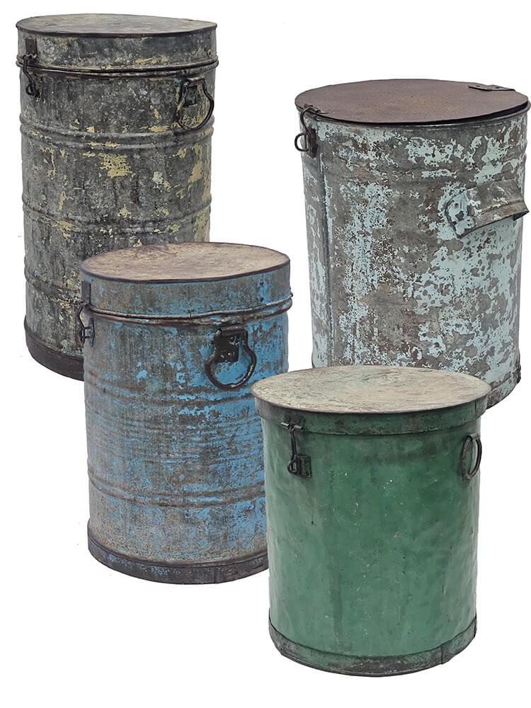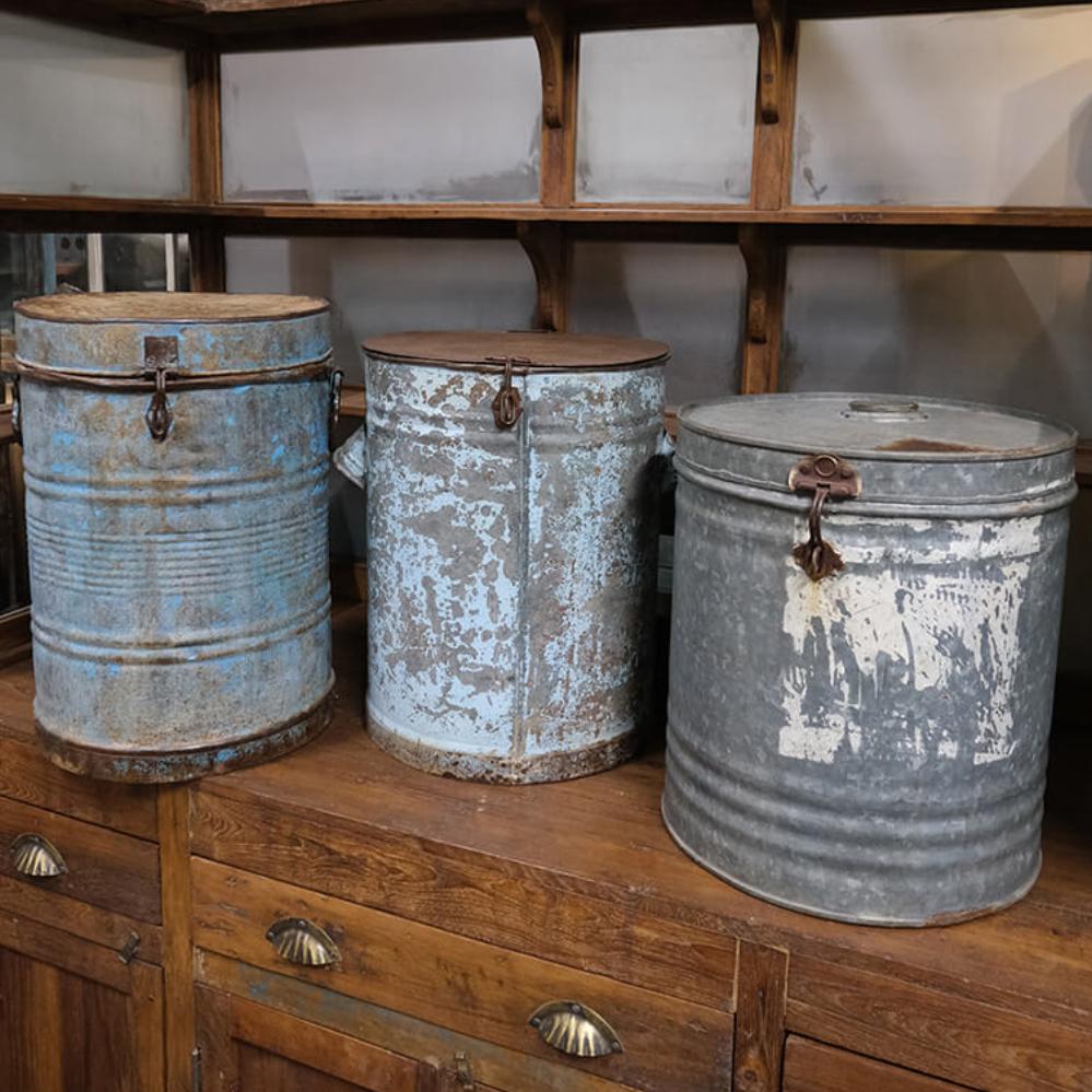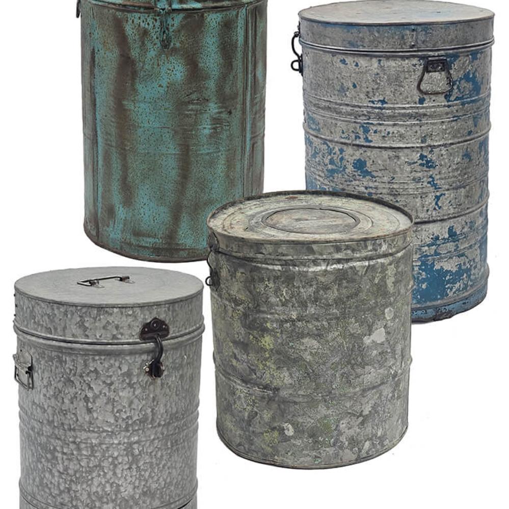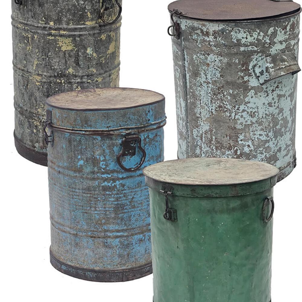 Altes Vintageeisenfass mit Deckel. Für die individuelle und einzigartige Einrichtung. Verwenden Sie das Fass beispielsweise als einzigartigen Mülleimer, Wäschekorb, Schirmhalter oder mit einem Kunststoffeinsatz als Topfabdeckung für eine große Pflanze oder einen Baum. Da es sich um alte Fässer handelt, sind alle unterschiedlich in der Farbe und Größe. Die Fässer sind nicht wasserdicht, und daher empfehlen wir, dass Sie einen Kunststoff-/Glaseinsatz verwenden, wenn sie für Pflanzen verwendet werden sollen.