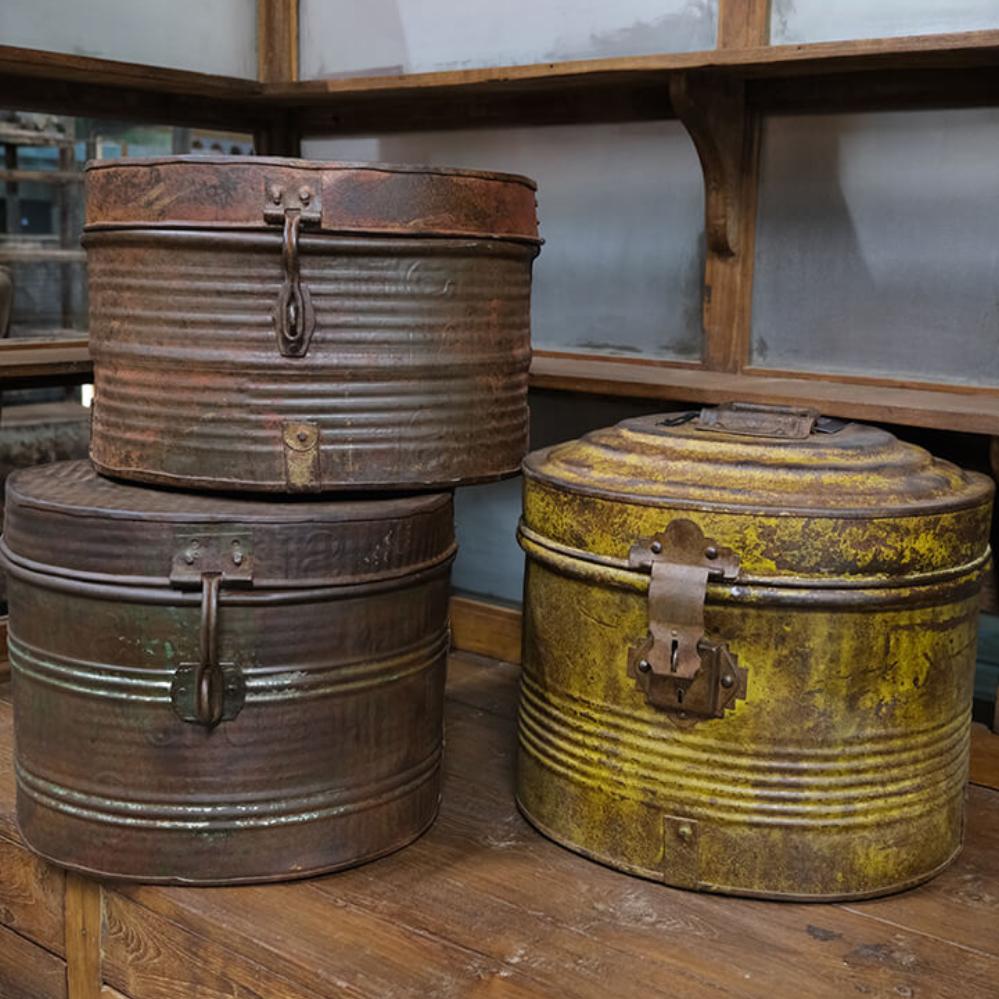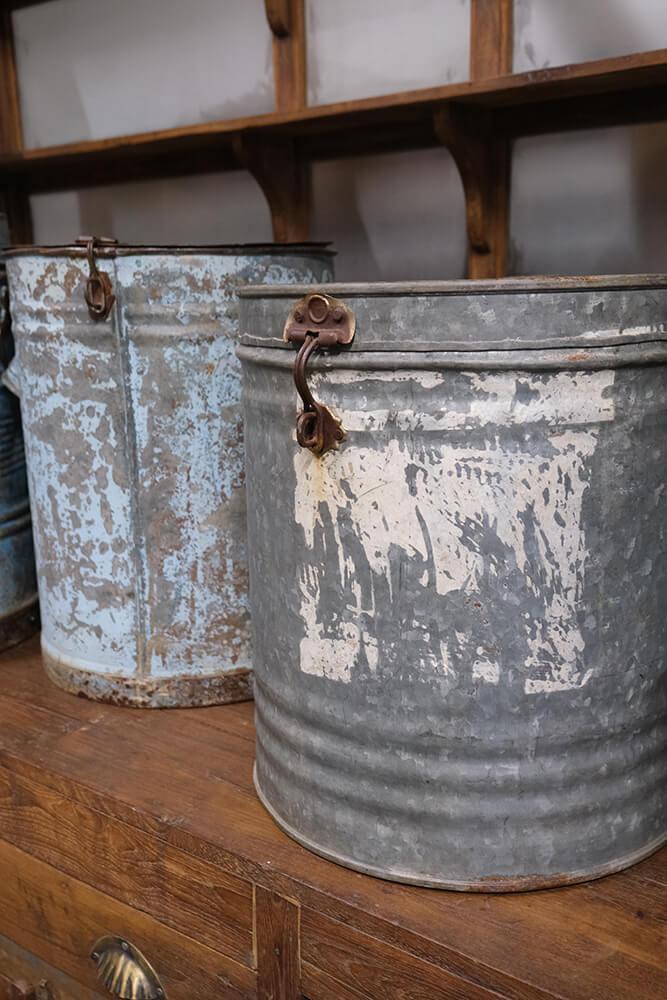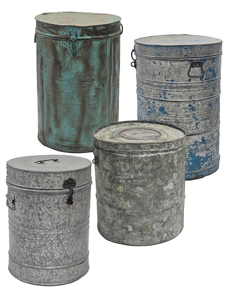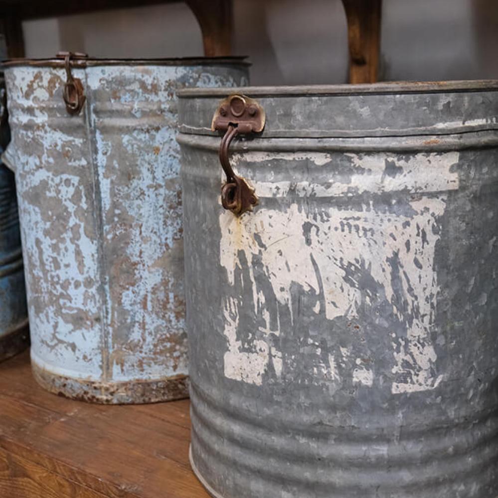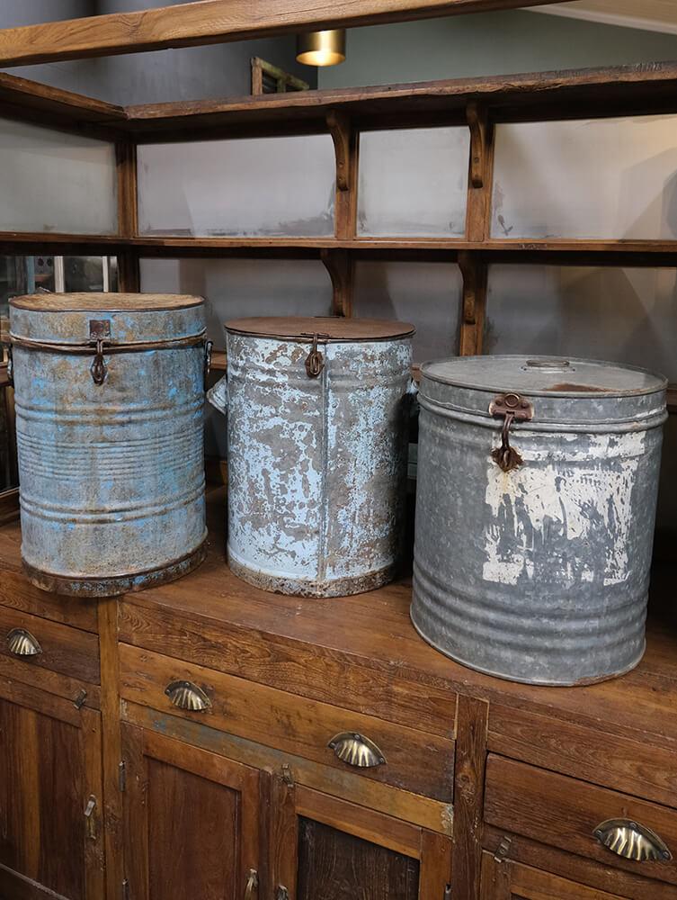 Altes Vintageeisenfass mit Deckel. Für die individuelle und einzigartige Einrichtung. Verwenden Sie das Fass beispielsweise als einzigartigen Mülleimer, Wäschekorb, Schirmhalter oder mit einem Kunststoffeinsatz als Topfabdeckung für eine große Pflanze oder einen Baum. Da es sich um alte Fässer handelt, sind alle unterschiedlich in der Farbe und Größe. Die Fässer sind nicht wasserdicht, und daher empfehlen wir, dass Sie einen Kunststoff-/Glaseinsatz verwenden, wenn sie für Pflanzen verwendet werden sollen.