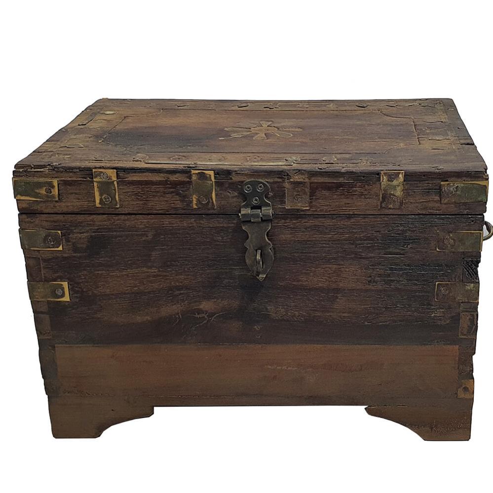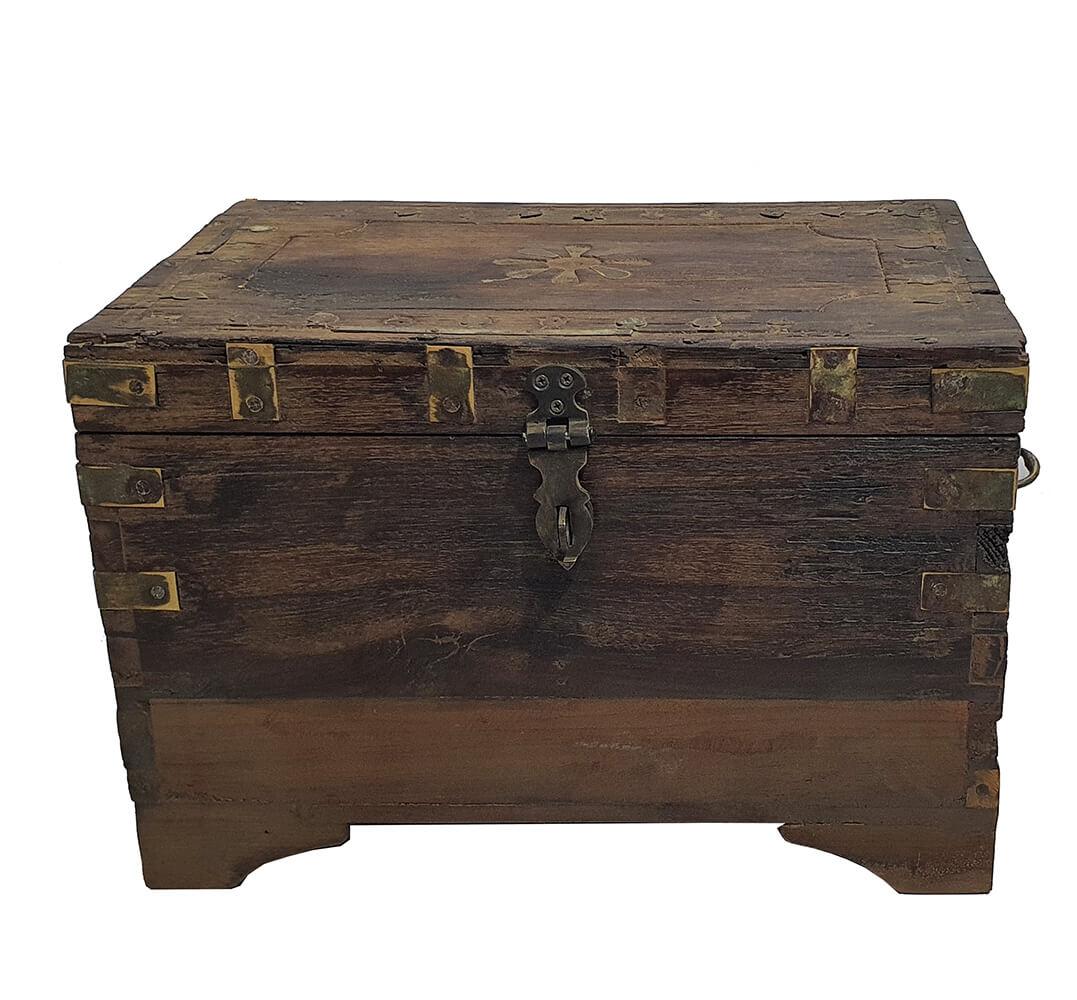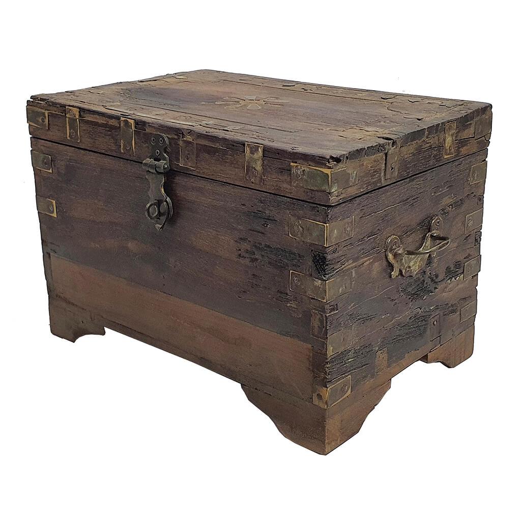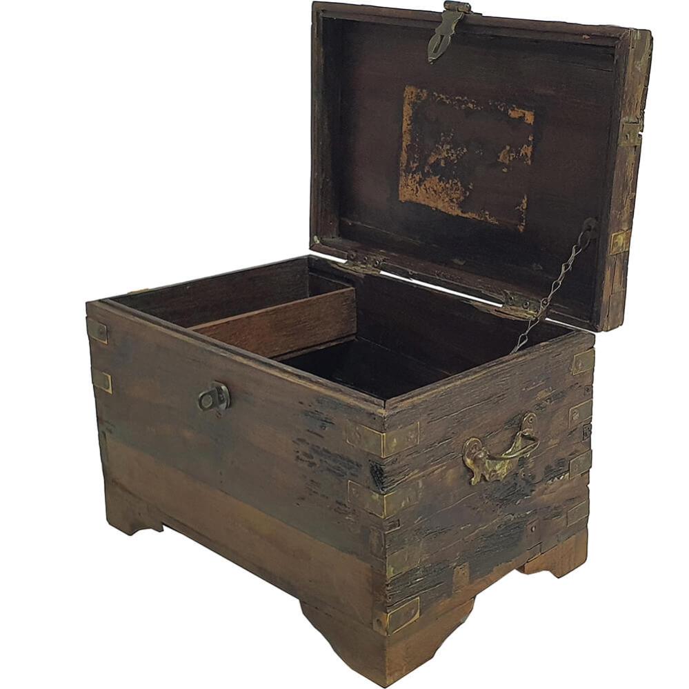 Diese charmante Holzkiste strahlt Geschichte und solides Handwerk aus. Sie ist aus dunklem Holz gefertigt und zeigt eine deutliche Patina aus vielen Jahren der Nutzung. Messingbeschläge verstärken die Ecken und verleihen der Kiste sowohl einen robusten als auch dekorativen Ausdruck, während die seitlichen Griffe das Umstellen erleichtern. Im Inneren bietet die Kiste eine praktische Fächeraufteilung mit einem kleineren Fach, ideal zur Aufbewahrung von Kleinteilen, die sonst leicht im Boden verschwinden. Der Deckel wird mit einem klassischen Verschluss und einer Kette gesichert, dadurch wird auch sichergestellt, dass er geöffnet bleiben kann, ohne sich unerwartet zu schließen. Eine authentische und funktionale Aufbewahrungslösung für alles von Decken und Spielen bis hin zu Ihren geheimsten Schätzen.