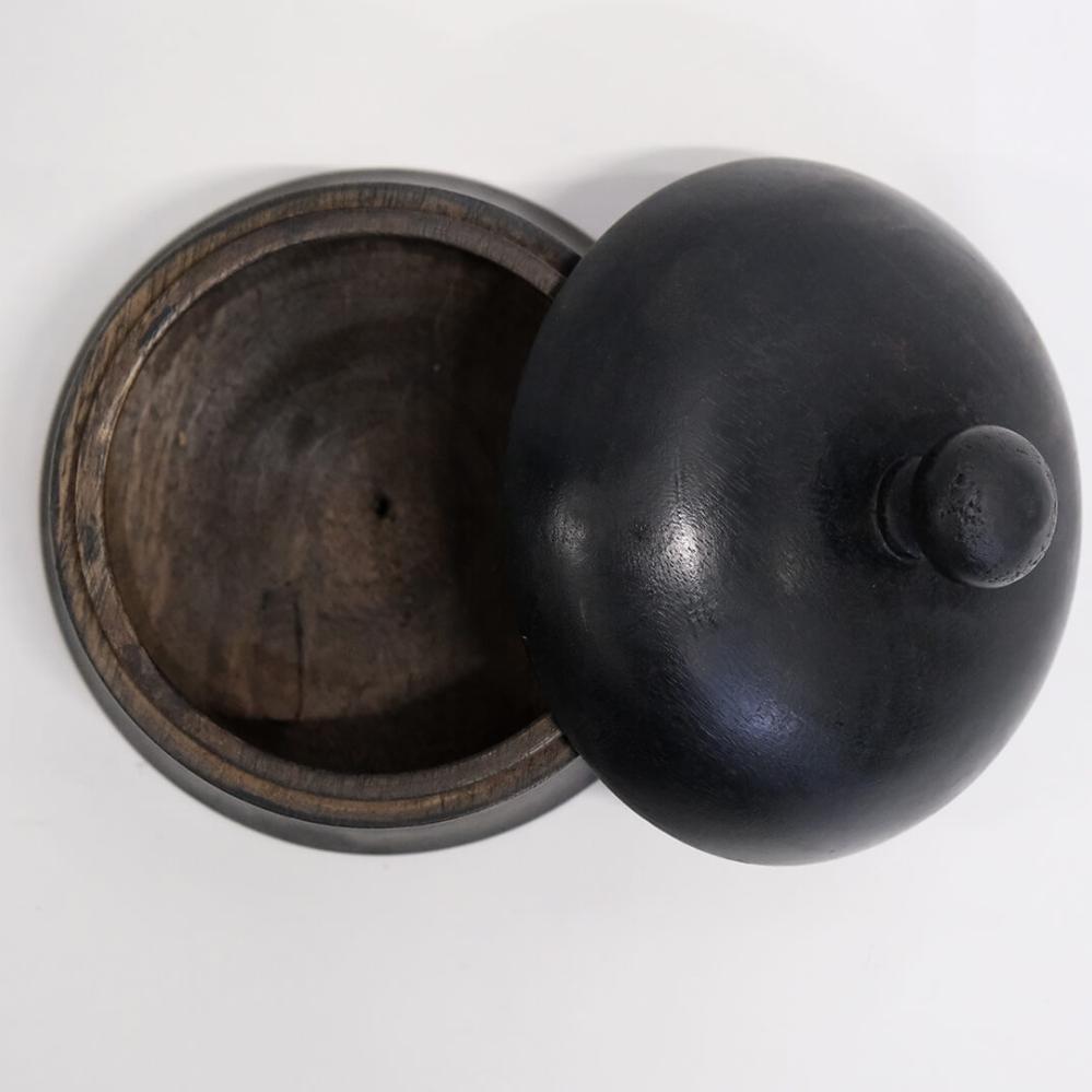 Schöne schwarz lackierte Dose aus Holz mit feinem Deckel. Die Dose ist dekorativ und bietet eine schöne Aufbewahrungmöglichkeit für viele Zwecke an. Sie schmückt mit ihrer weichen und leicht runden Form jede Inneneinrichtung.