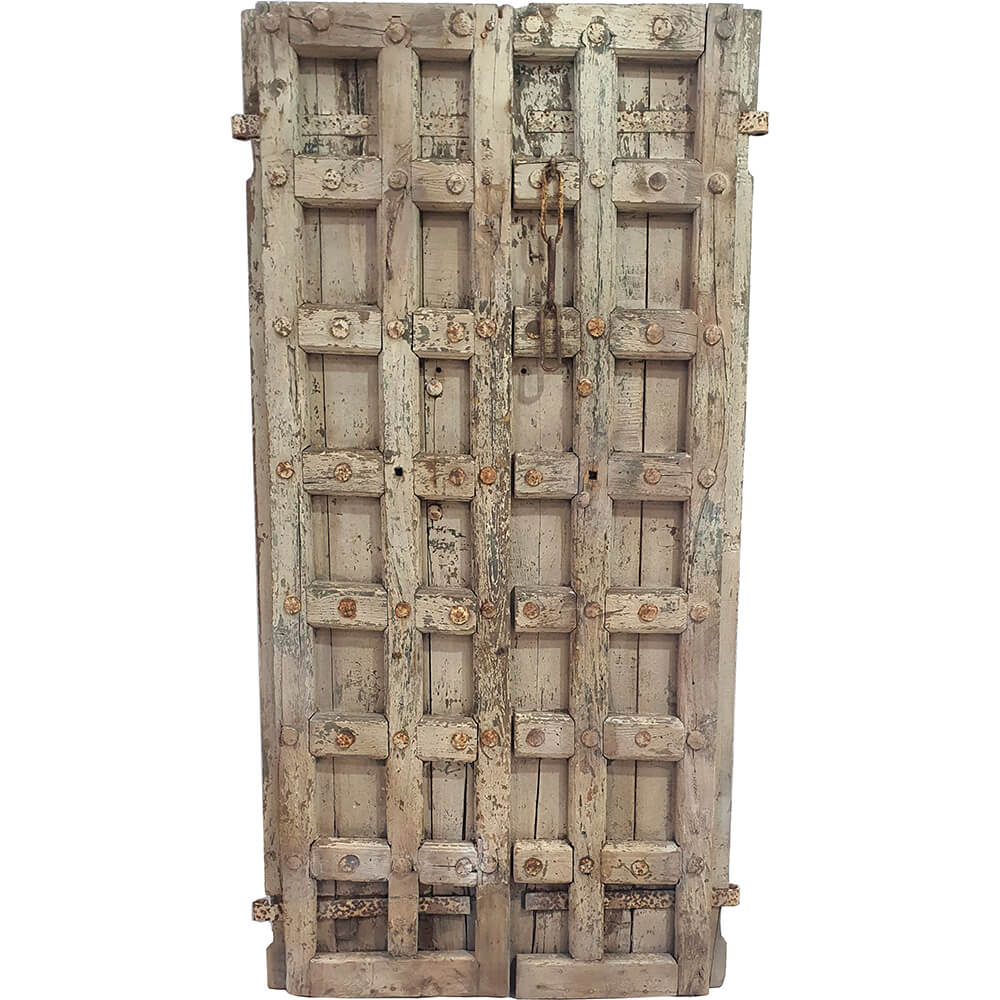 Diese alte Holztür ist ein schönes Beispiel für solide Handwerkskunst und echte Patina. Sie besteht aus kräftigen Holzbrettern und ist mit einer markanten Rahmen- und Felderaufteilung gestaltet, die der Tür einen beinahe grafischen Ausdruck verleiht. Die vielen sichtbaren Holzdübel und Beschläge unterstreichen den handwerklichen Charakter und erzählen von einer Zeit, in der Funktion und Haltbarkeit untrennbar verbunden waren. Die Oberfläche zeigt einen abgenutzten, gedämpften Farbton mit abgeblätterter Farbe, Rissen und Spuren vieler Jahre der Nutzung, was der Tür viel Charakter und Geschichte verleiht. Das originale Schloss und die Metalldetails verstärken den authentischen Ausdruck zusätzlich. Die Tür eignet sich hervorragend als markantes dekoratives Element in der Einrichtung, zum Beispiel als Wanddekoration, Schiebetür oder als kreativer Raumteiler.