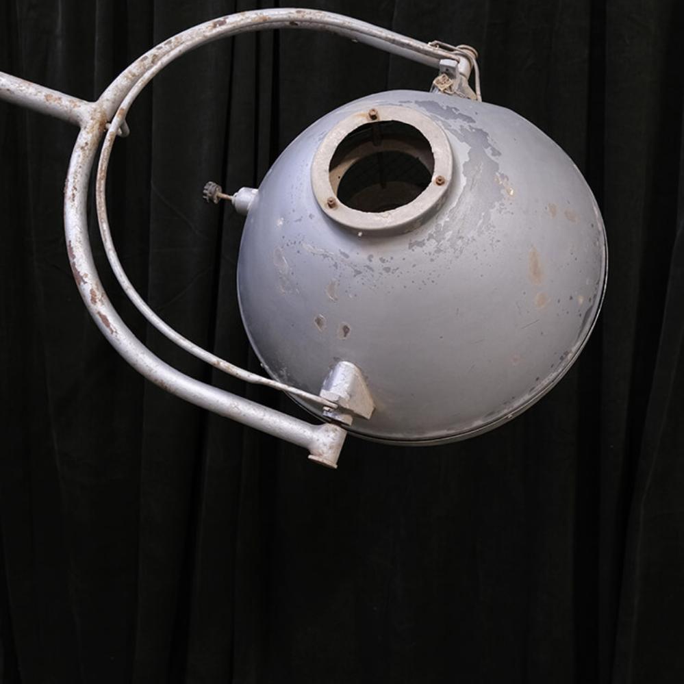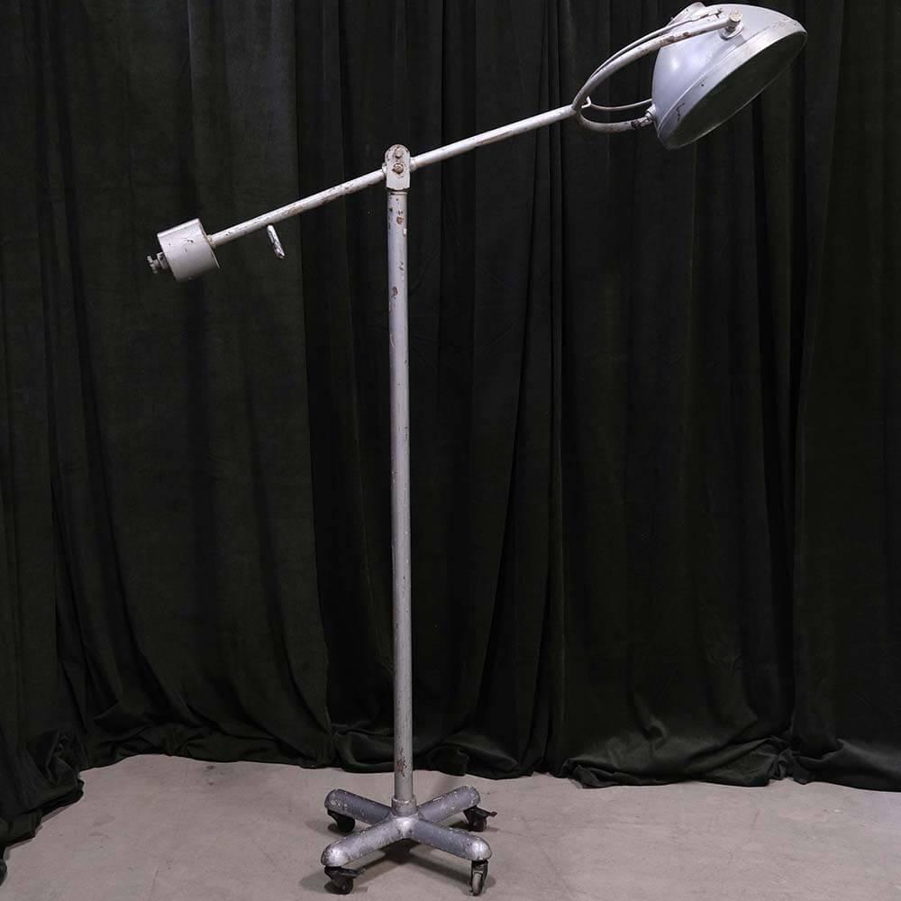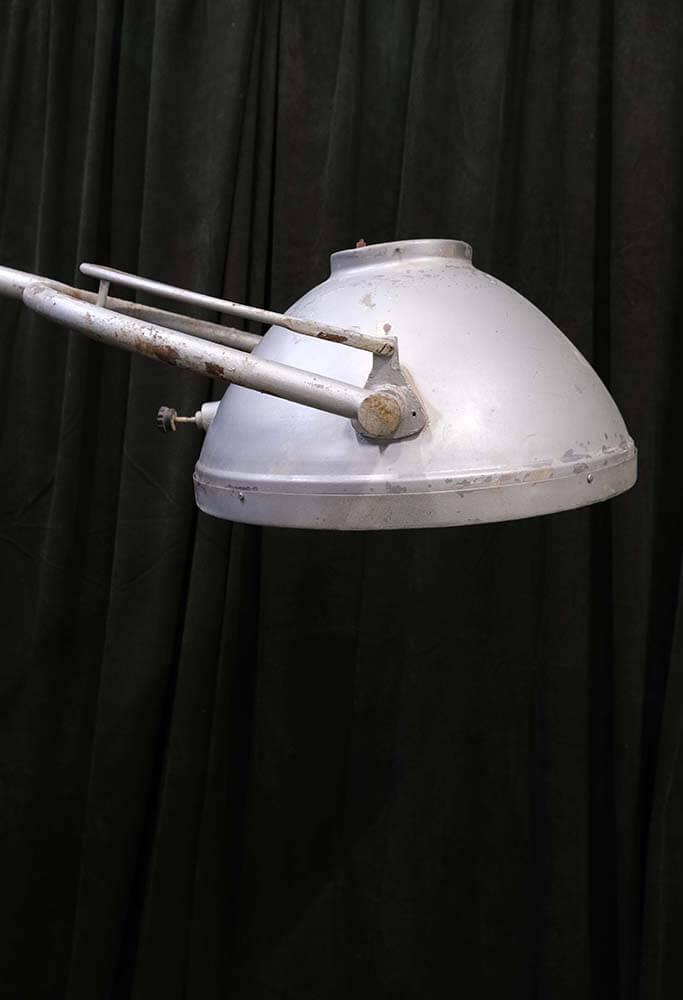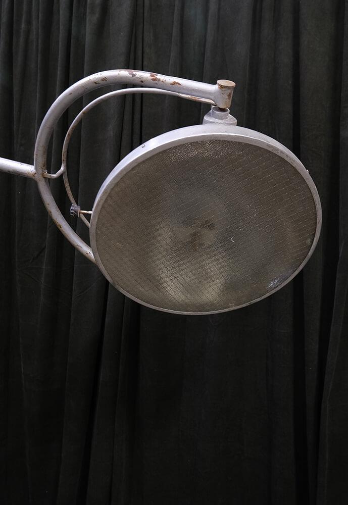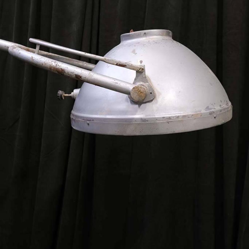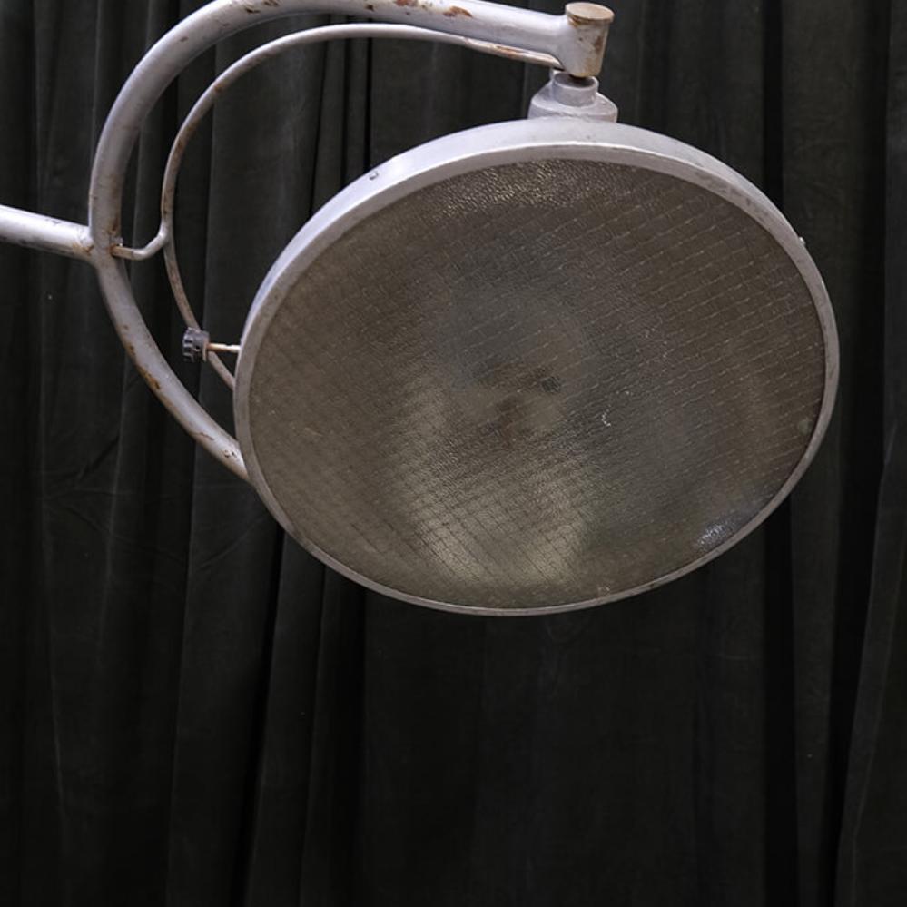 Bringen Sie ein Stück Geschichte in Ihre Einrichtung mit dieser alten Operationslampe, einem perfekten Beispiel für industrielles Vintage-Design. Die Lampe verfügt über einen stabilen Fuß mit Rollen, der das Verschieben erleichtert. Ohne Verkabelung ist die Lampe für dekorative Zwecke gedacht und macht sich hervorragend als Blickfang in einer Ecke Ihres Zuhauses oder Geschäfts. Die robuste Konstruktion und die Patina unterstreichen ihren zeitlosen Charme.