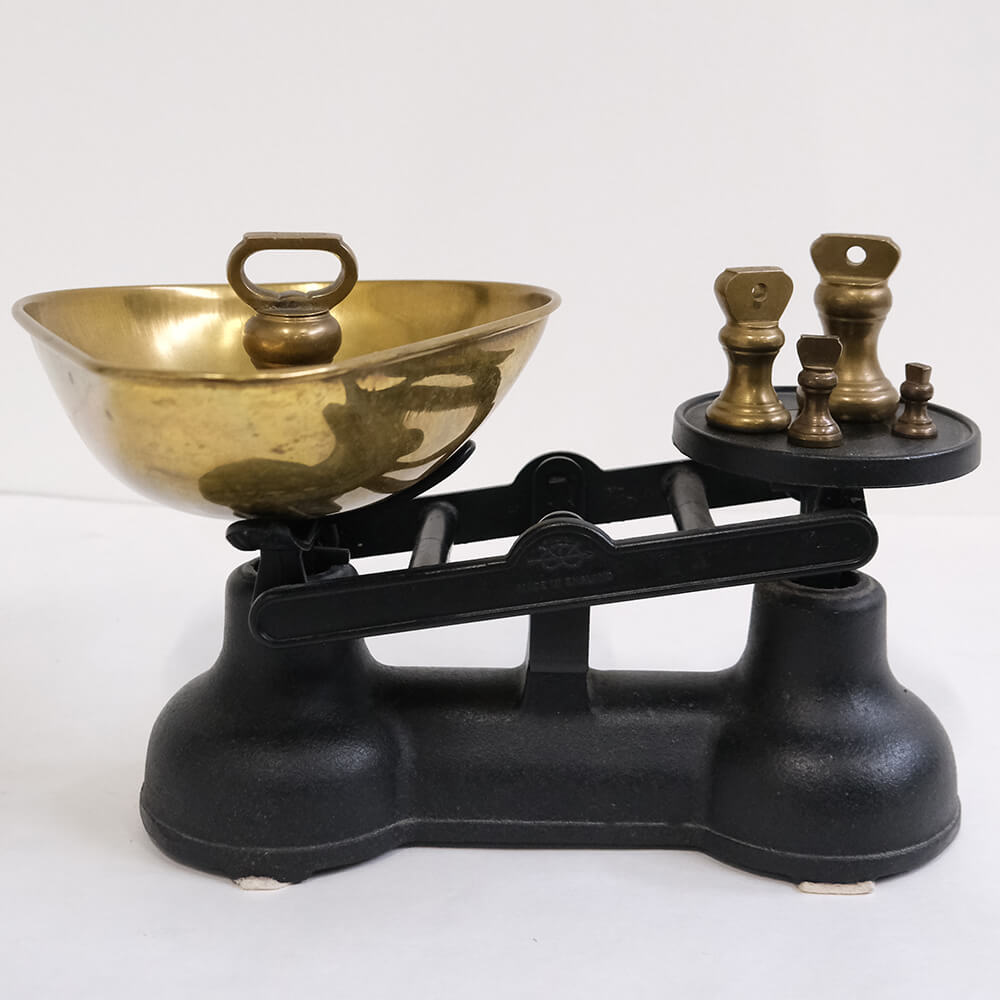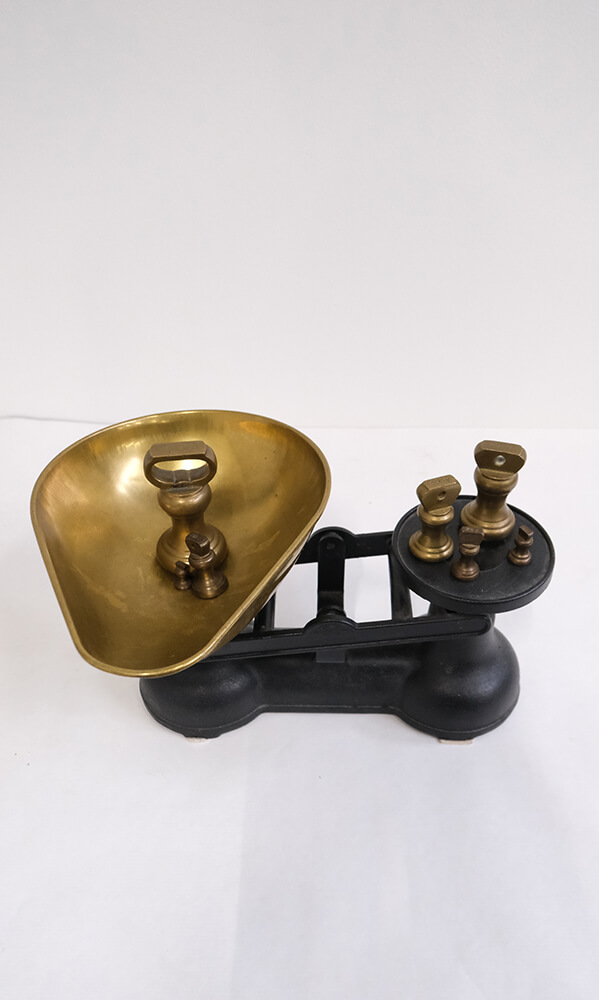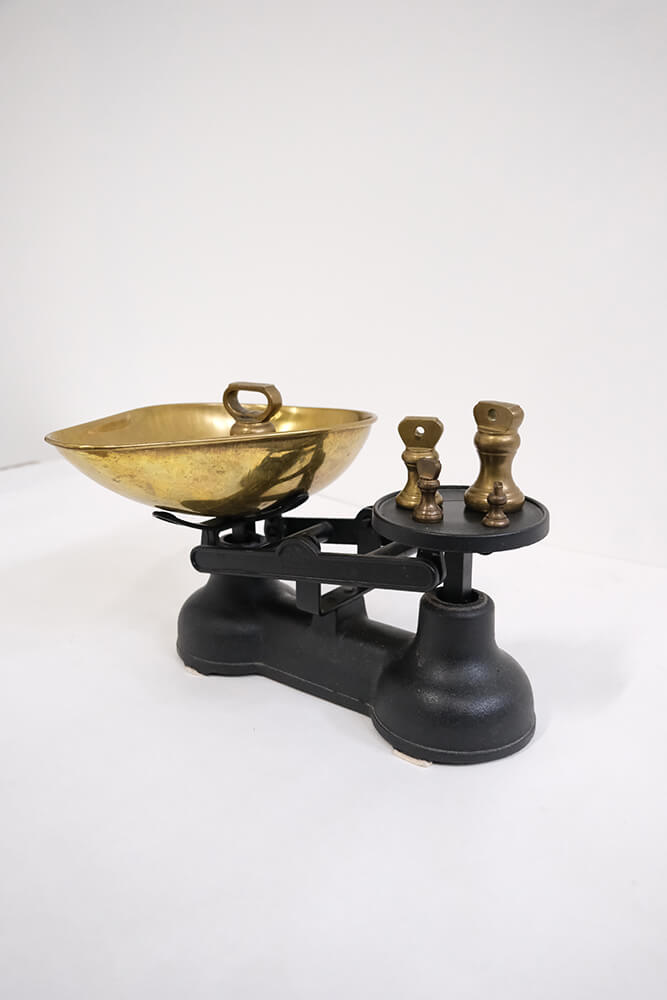 Diese dekorative, alte Tischwaage bringt Retro-Flair in den Raum. Die schön patinierte Schale und der dunkle Eisenfuß machen diese Waage zu einer interessanten Dekoration, die einen Vintage- oder Industrie-Einrichtungsstil ergänzt.