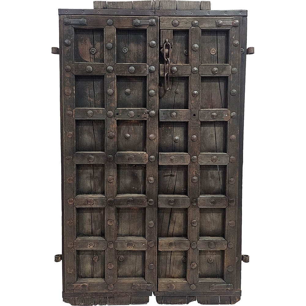 Diese alte Holztür ist ein Stück Architektur mit Seele, Patina und einem Hauch von Geheimnis. Mit ihrer massiven Konstruktion, den groben Eisenbeschlägen und den wunderschönen Spuren früherer Farbschichten hat sie irgendwo auf der Welt ihren Dienst getan, während der Alltag und Geschichten an ihr vorbeizogen. Das Holz ist mit Würde gealtert und zeugt von jahrzehntelangem Gebrauch. Hier treffen Charme und Charakter in bester Weise aufeinander. Die Tür kann dekorativ an eine Wand gelehnt, als Raumteiler, Kopfteil oder, wenn Sie sich trauen, wieder als echte Tür verwendet werden. Ein wahres Unikat.