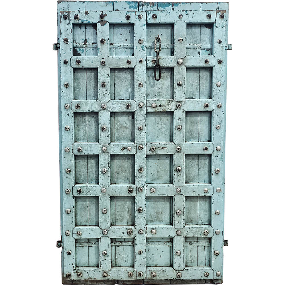 Diese alte Holztür strahlt Geschichte und Charakter aus, mit ihrer einzigartigen Patina und soliden Konstruktion. Die türkise Oberfläche erzählt die Geschichte der Zeit, in der Farbschichten und Abnutzung eine faszinierende Tiefe und Textur geschaffen haben. Die sichtbaren Nieten und dekorativen Beschläge betonen den rohen, industriellen Look. Diese Tür ist perfekt als stimmungsvolles Element in einem Geschäft, Restaurant oder zuhause. Vielleicht als Wanddekoration oder einzigartige Raumtrennung. Ein Muss für alle, die authentische Materialien mit viel Seele und Geschichte lieben.