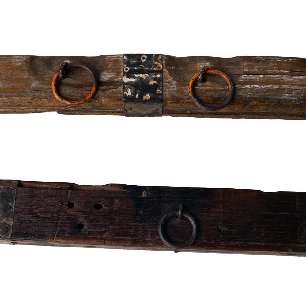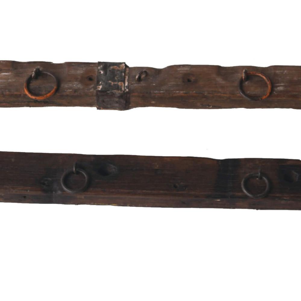 Alter, rustikaler Holzbalken mit Eisenringen