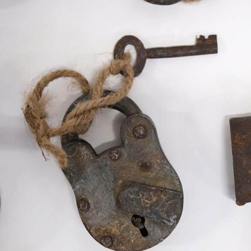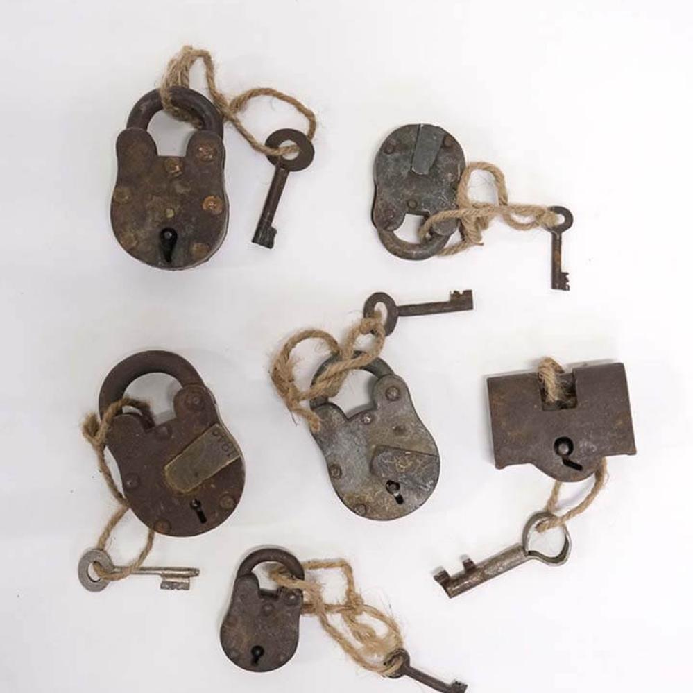 Einzigartiges altes Schloss aus Eisen mit Schlüssel. Viel Seele, Charme und Charakter für einen rohen und industriellen Look. Alle sind unterschiedlich. Ein lustiges und einzigartiges Accessoire.