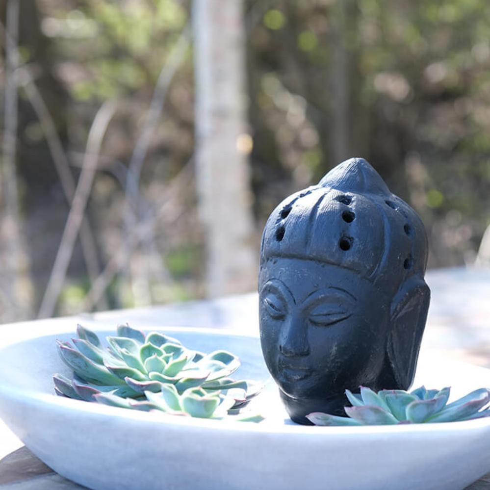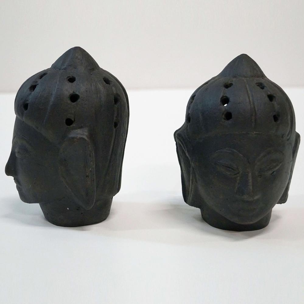 Feiner, kleiner, detaillierter und ausdrucksstarker Buddha-Kopf aus Ton. Der Kopf des Buddha ist dunkel mit Patina. Setzen Sie den Buddha-Kopf mit anderen schönen dekorativen Nippsachen zusammen und schaffen Sie eine persönliche Atmosphäre im Innenraum.