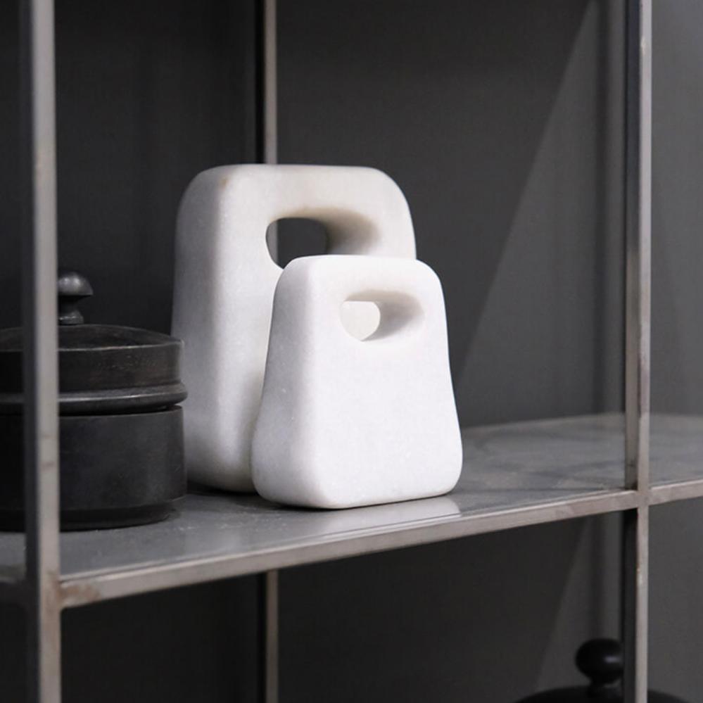 Wunderschöne Skulptur aus weißem Marmor mit einer einfachen Öffnung oben, die diesem Produkt einen modernen und skulpturalen Ausdruck verleiht. Marmor ist ein Naturmaterial, daher ist jede Skulptur ein Unikat mit eigener Farbe und Struktur. Das schlichte Design macht sie zu einer stilvollen Dekoration, die sowohl in klassische als auch in moderne Einrichtungen passt. Sie kann als ästhetisches Statement allein stehen, Teil eines Arrangements mit anderen Dekorationen sein oder praktisch als Buchstütze verwendet werden. Die Skulptur ist auch in einer größeren Variante erhältlich, sodass Sie ein harmonisches Set schaffen können, das Ihrer Einrichtung noch mehr Charakter verleiht.