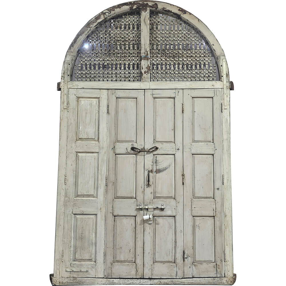 Diese große alte Holztür mit Rundbogen ist ein beeindruckendes und charakterstarkes Element voller Geschichte und Patina. Der runde obere Teil verleiht der Tür einen weichen, architektonischen Ausdruck, der sofort ins Auge fällt und dem Raum eine besondere Atmosphäre verleiht. Die helle, abgenutzte Oberfläche zeigt deutliche Spuren der Zeit mit abgeblätterter Farbe, kleinen Rissen und natürlichen Farbvariationen, wie sie nur echtes altes Holz aufweist. Der obere Bereich ist mit einem feinen Holzgitter ausgeführt, das dem ansonsten massiven Erscheinungsbild Leichtigkeit und Detailreichtum verleiht. Die kräftigen Füllungen, originalen Beschläge und Schließmechanismen unterstreichen die authentische Herkunft und die solide Handwerkskunst der Tür. Die Tür eignet sich hervorragend als dekoratives Statement in größeren Räumen, als Raumteiler, Fassadenelement oder Wanddekoration, sowohl in privaten Wohnräumen als auch in Geschäften oder Restaurants. Ein einzigartiges Stück für alle, die Wiederverwendung, Geschichte und architektonische Elemente mit Seele schätzen