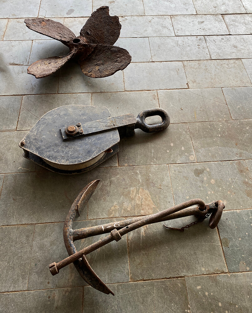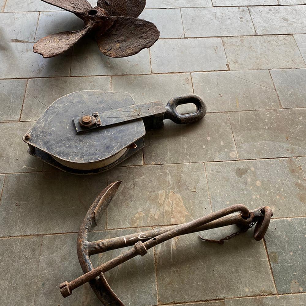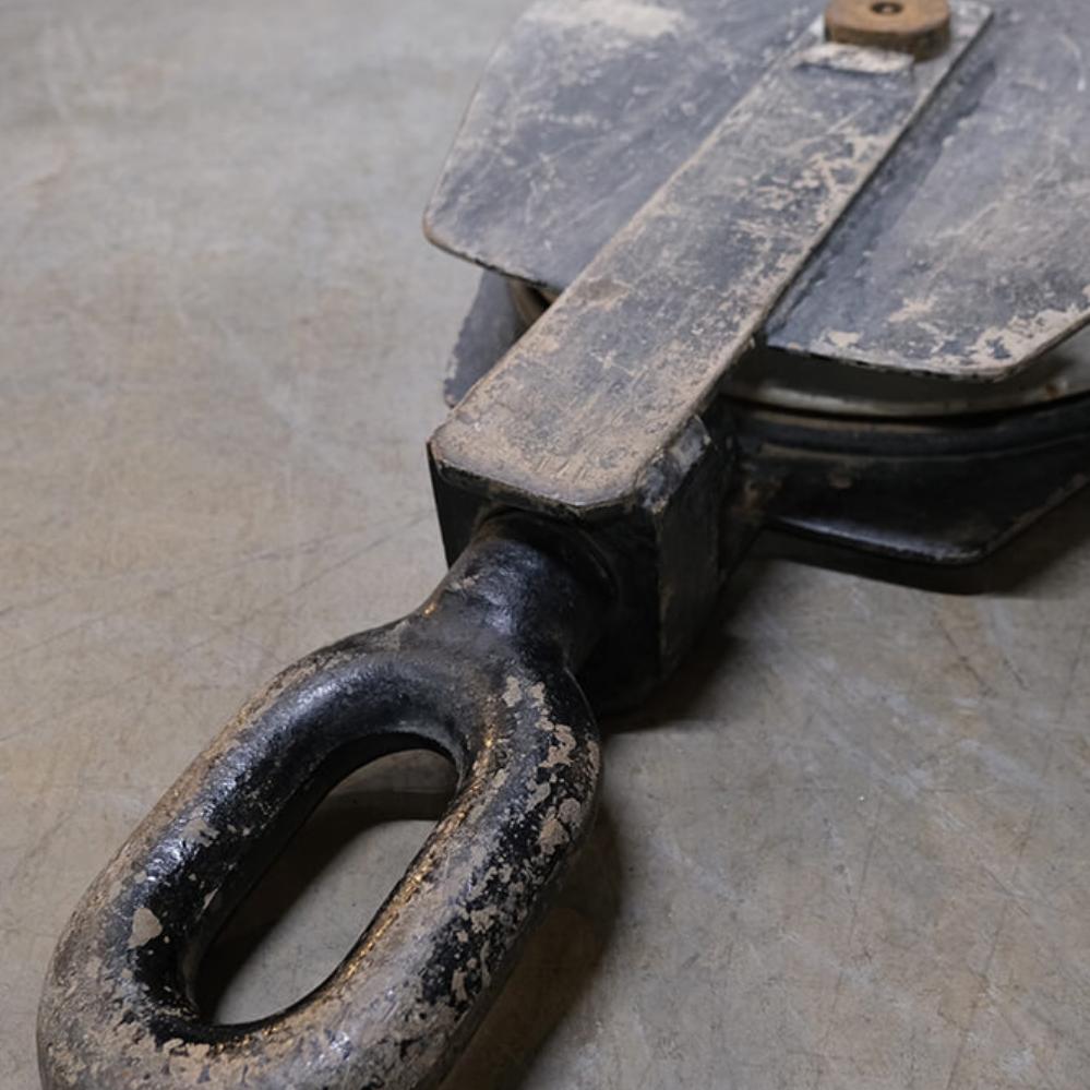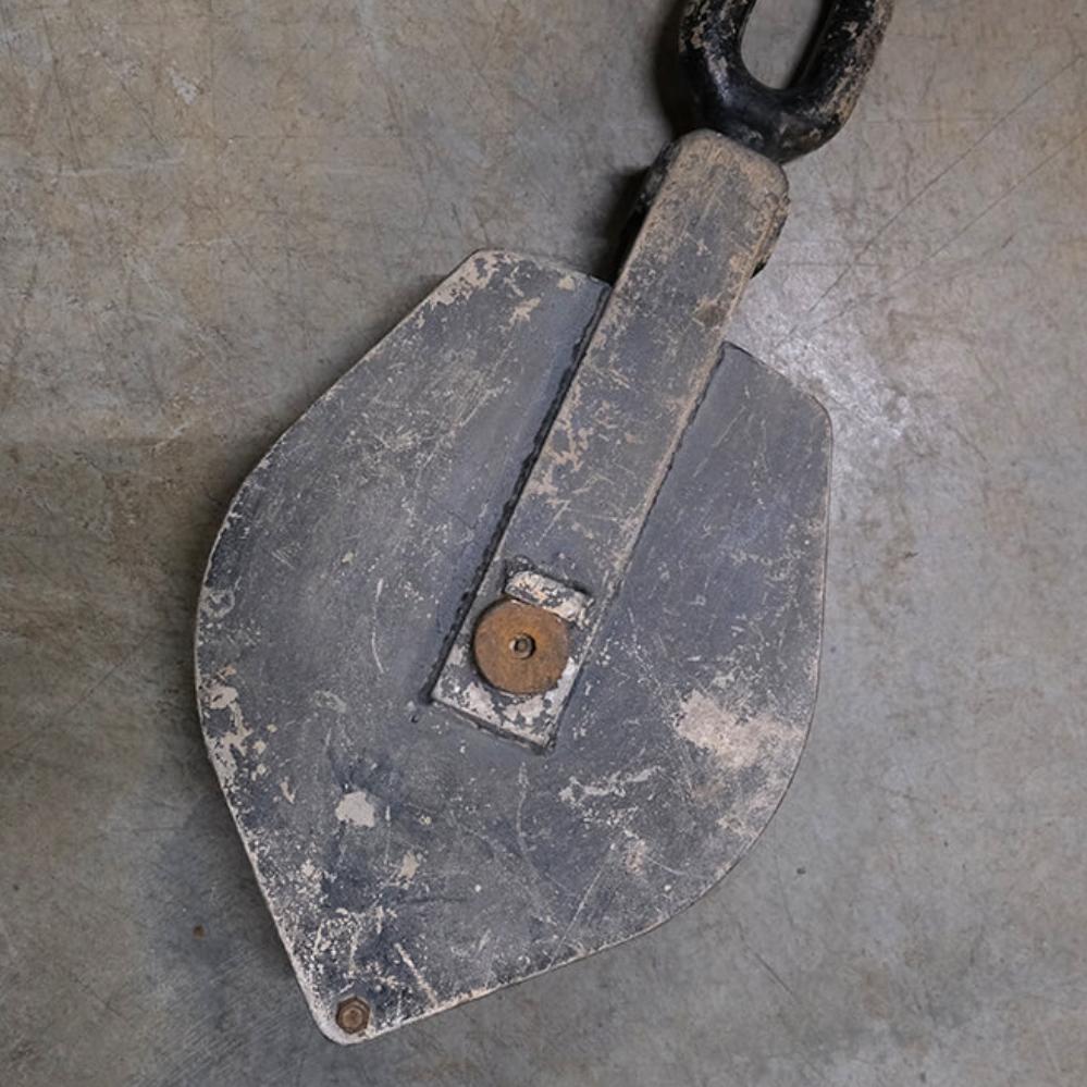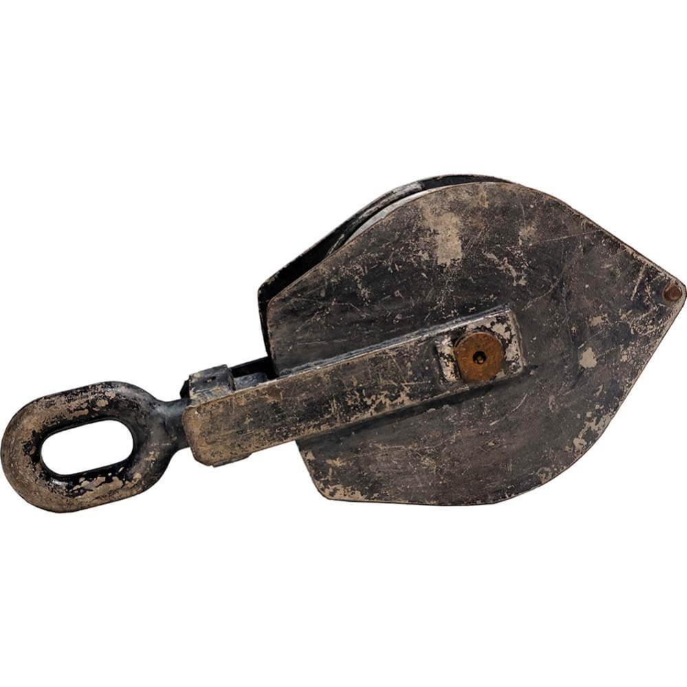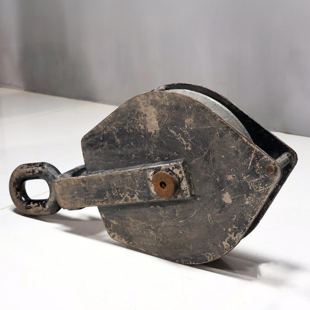 Diese große, alte Schiffsrolle aus Eisen hat ein solides, robustes Design, das deutliche Spuren seiner früheren maritimen Funktion zeigt. Der große, schwere patinierte Eisenrahmen erzählt eine Geschichte von Abnutzung und Stärke. Die Räder in der Rolle konnten erhebliche Lasten bewältigen, was sie für schwere Hebeaufgaben auf Schiffen oder in industriellen Umgebungen geeignet machte. Sie hat ein strapazierfähiges Aussehen mit originalen Rost- und Farbschichten, die ihr einen authentischen Vintage-Look verleihen.