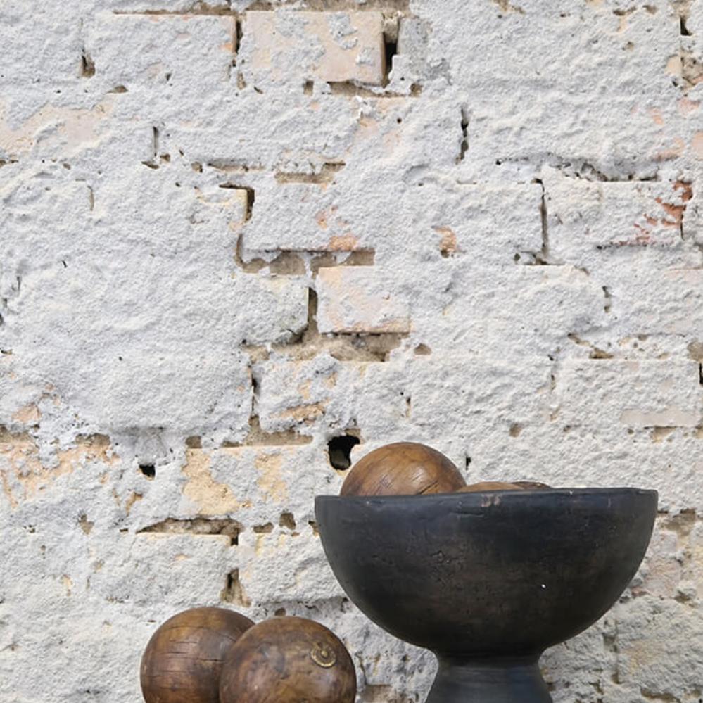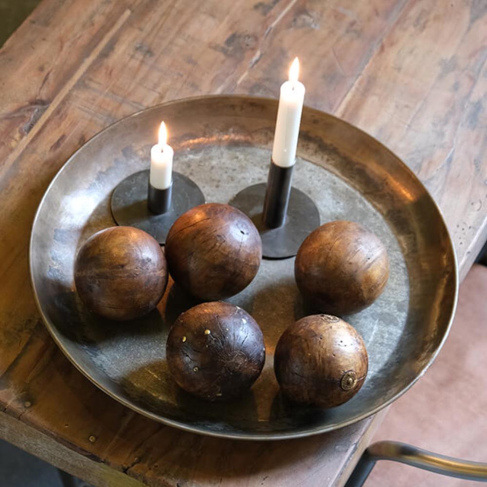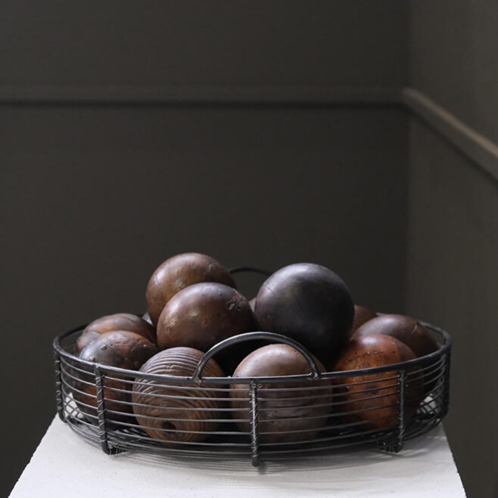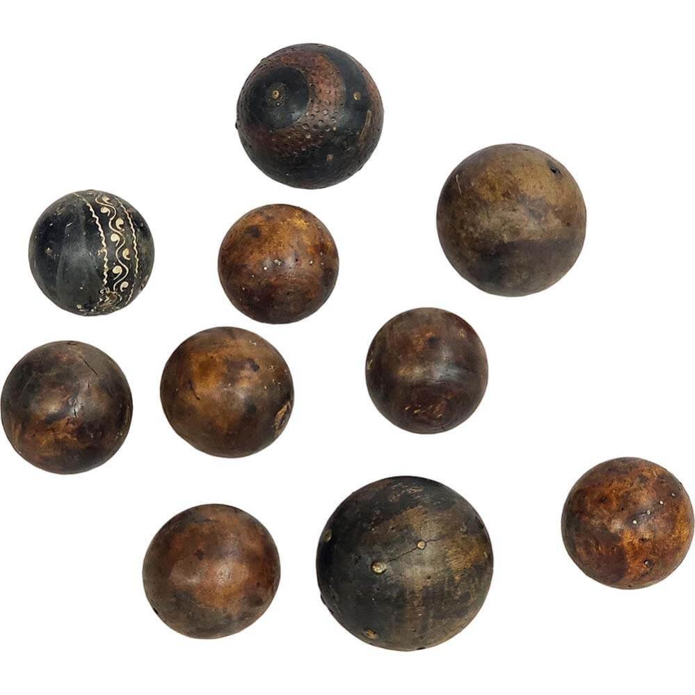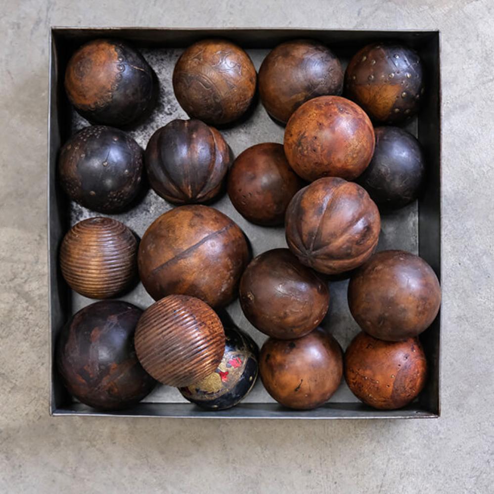 Diese rustikalen Holzkugeln sind absolut atemberaubend. Mit einem Durchmesser von 8-12 cm bringt jede Kugel ihre eigene, einzigartige Note auf den Tisch—im wahrsten Sinne des Wortes! Einige sind mit Schnitzereien verziert, andere haben eine schöne Patina, und die Farbtöne reichen von tiefem Dunkelbraun bis zu helleren, warmen Nuancen. Die Holzkugeln haben bereits ein aufregendes Leben hinter sich, vielleicht als Teil eines alten indischen Spiels oder als Dekoration in einem indischen Zuhause. Jetzt sind sie bereit, ihr nächstes Kapitel in Ihrem Raum zu erzählen. Verwenden Sie sie als cooles Detail auf dem Esstisch, in einer Vitrine oder als Teil einer dekorativen Anordnung im Eingangsbereich. Sie werden sicherlich Neugier wecken und dem Raum eine raue, authentische Ausstrahlung verleihen.