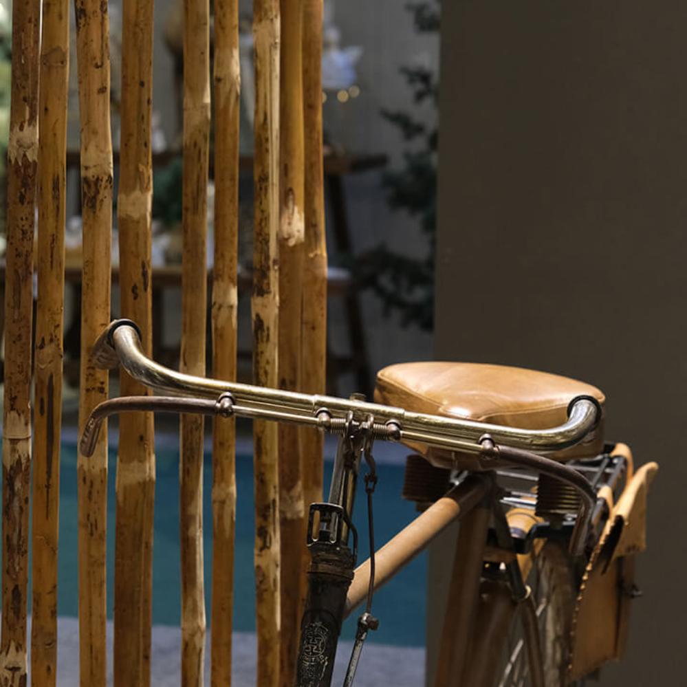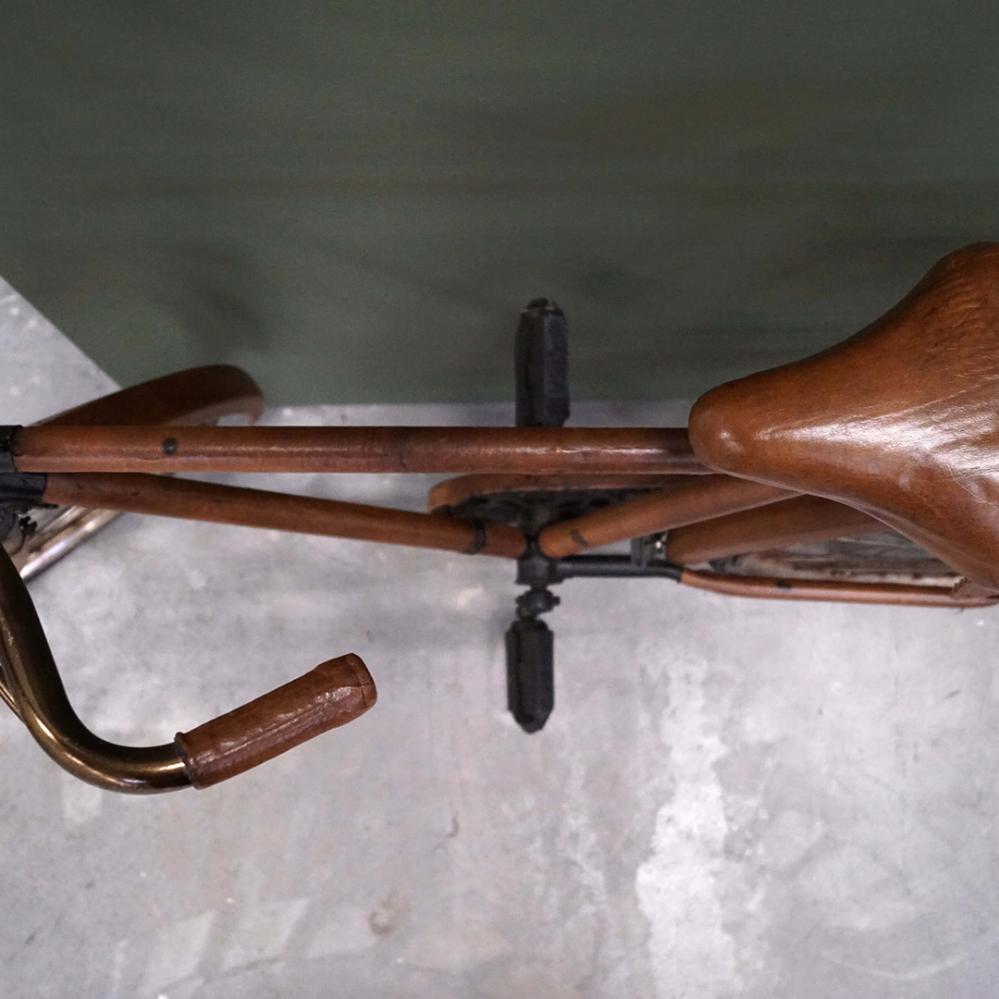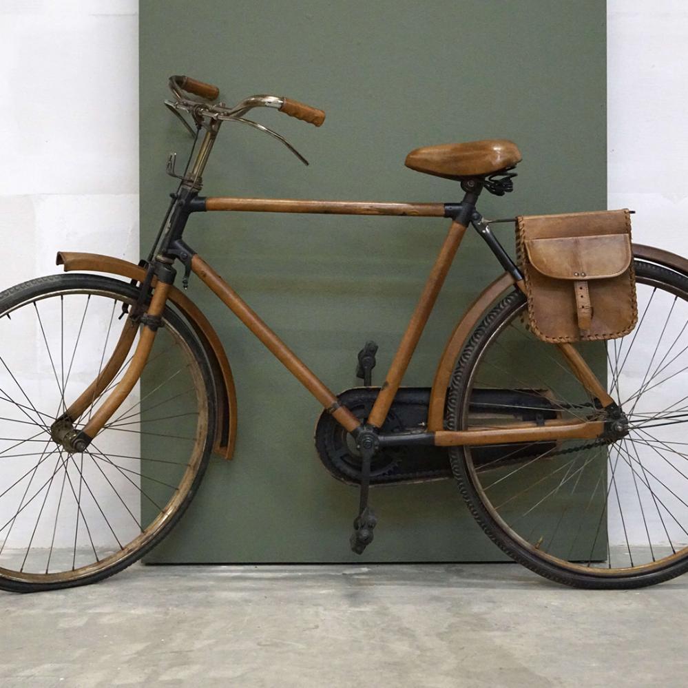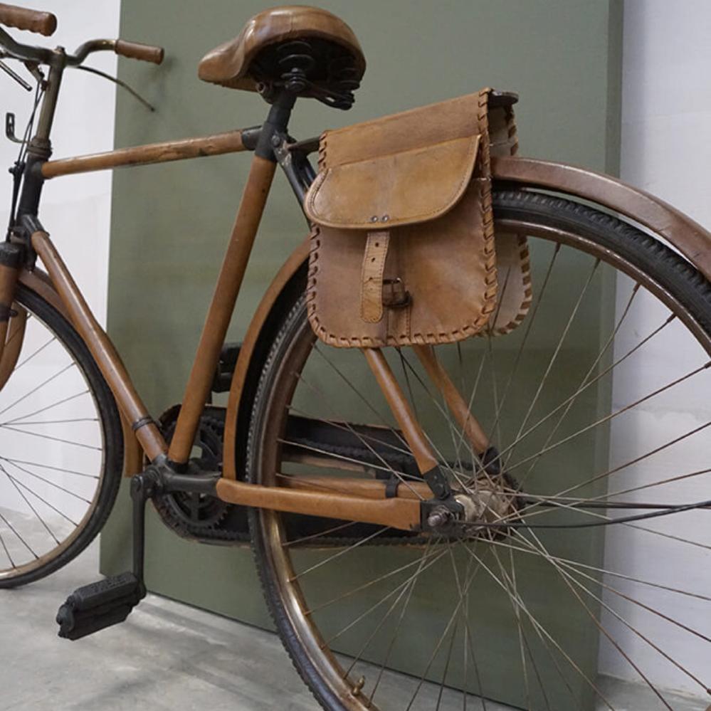 Rustikales, altes Fahrrad mit neuem Leben. Das Fahrrad wurde mit exklusivem Büffelleder bezogen und verfügt über viele feine Details. Das Fahrrad verfügt unter anderem über eine Fahrradtasche und damit wurde dem Fahrrad ein exklusiver Raw-Look verliehen. Mit diesem Lederfahrrad können Sie einen exklusiven Look im Innenraum kreieren - auf den Boden stellen oder an die Wand hängen.