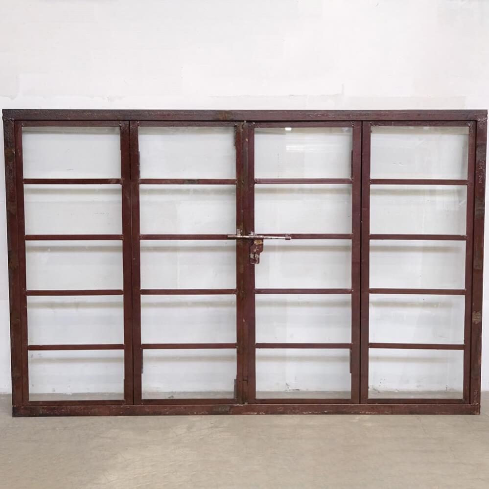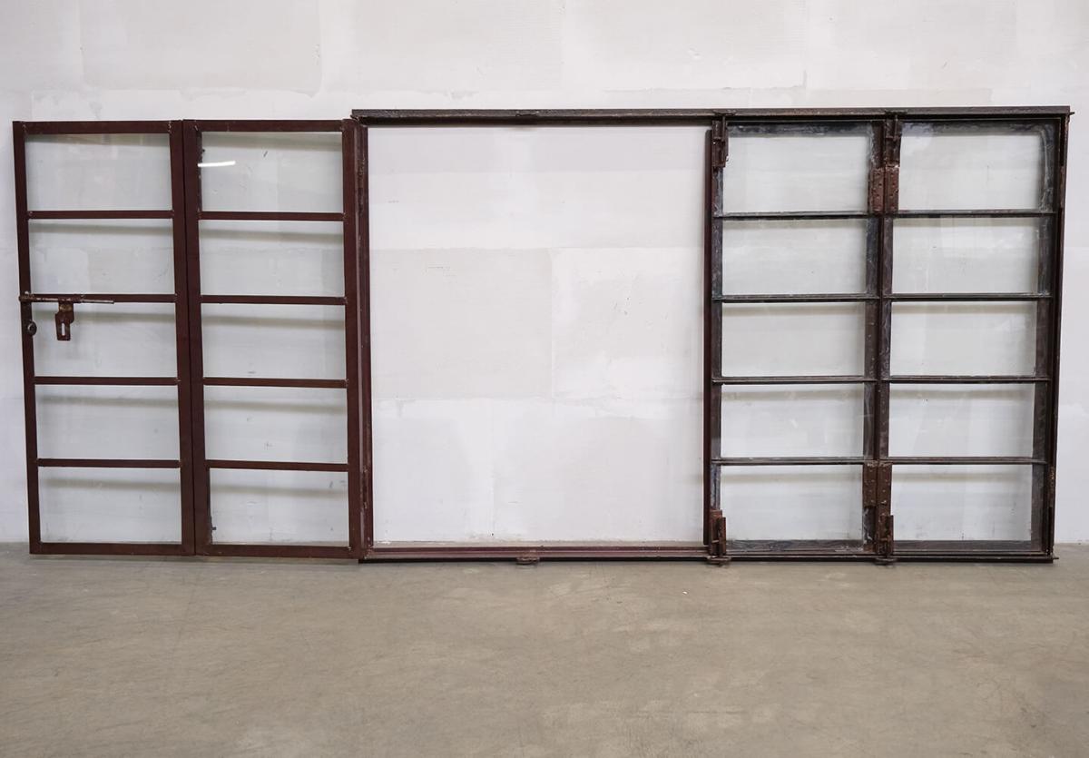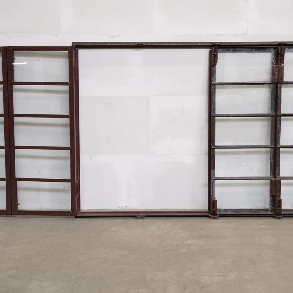 Charmanter und einzigartiger Raumteiler. Der Fensterrahmen ist in vier klappbare Abschnitte unterteilt, die sich einfach zur Seite klappen lassen und so eine eindrucksvolle und großzügige Öffnung schaffen. Der Rahmen stammt aus einer alten Fabrik und besteht aus Eisen, das im Laufe der Zeit eine rustikale und schöne Patina entwickelt hat, die dem Rahmen ein authentisches Vintage-Feeling verleiht. Um seinen Charakter zu bewahren und hervorzuheben, wurde der Rahmen klar lackiert, was ihm ein schönes und schützendes Finish verleiht.