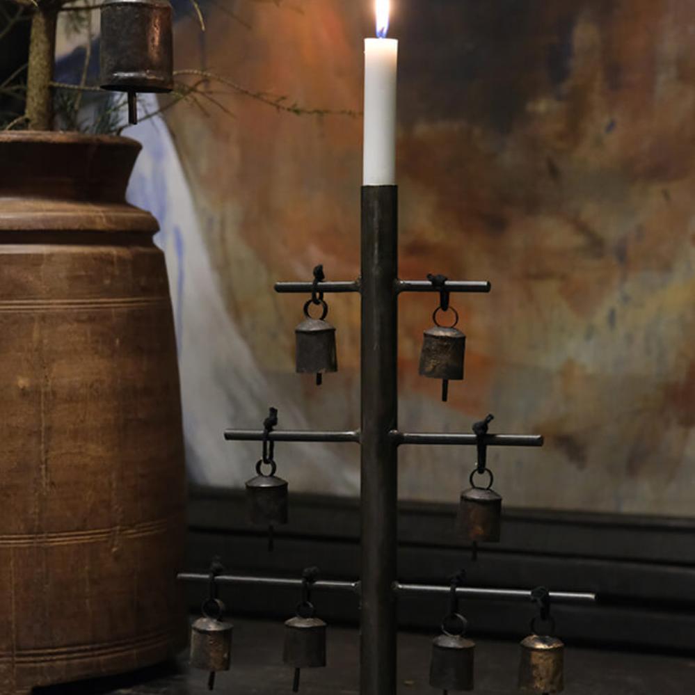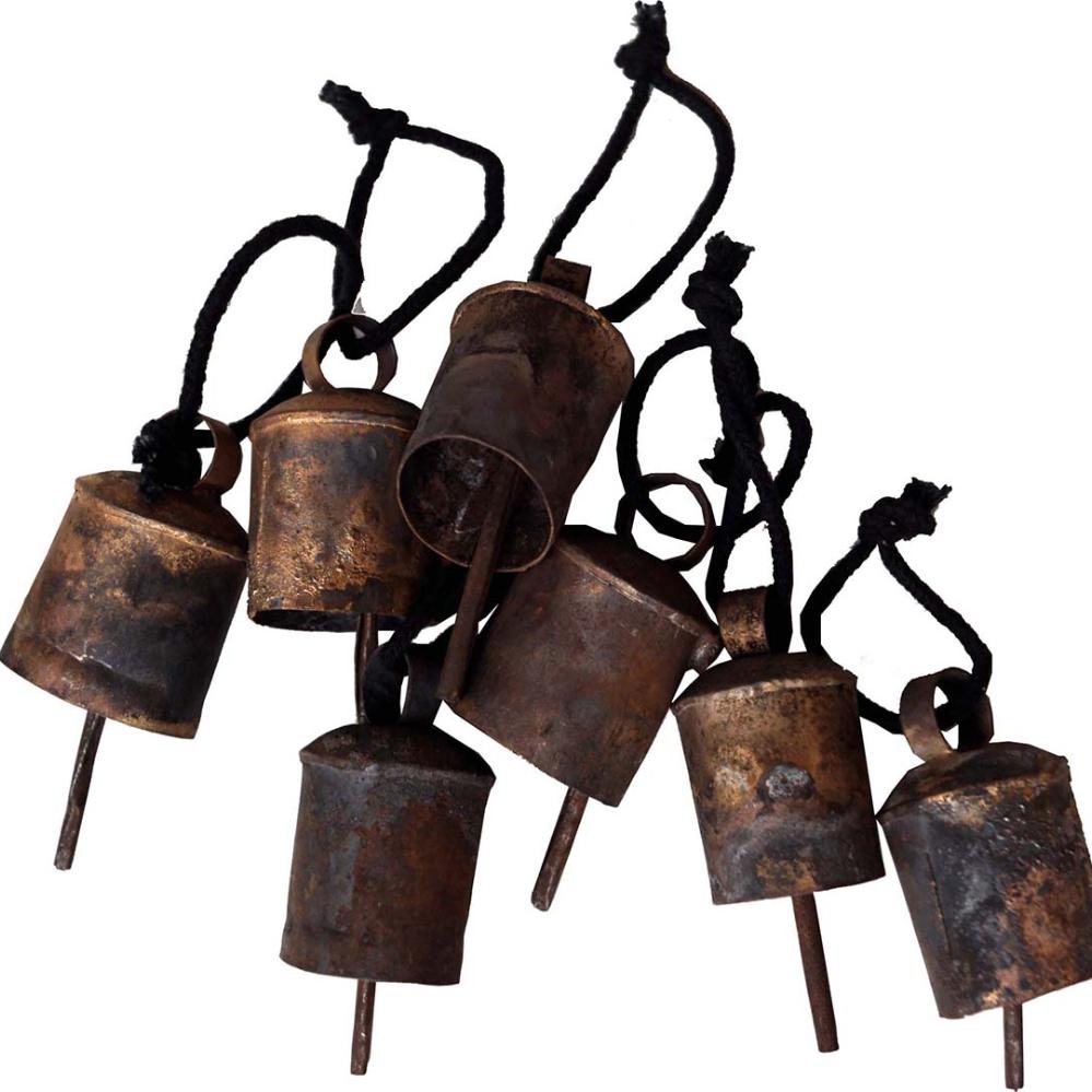 Rustikale alte Glöckchen aus Eisen und mit schwarzer Juteschnur. Die Glocken werden in Indien verwendet, um an den Halsbändern der Ziegen zu hängen. Wir haben einfach eine kleine schwarze Juteschnur hinzugefügt, damit weitere Anwendungsmöglichkeiten in Ihrem Interieur entstehen. Zu Weihnachten schmücken die schönen Glöckchen den Weihnachtsbaum oder eine Vase mit Tannenzweigen.
