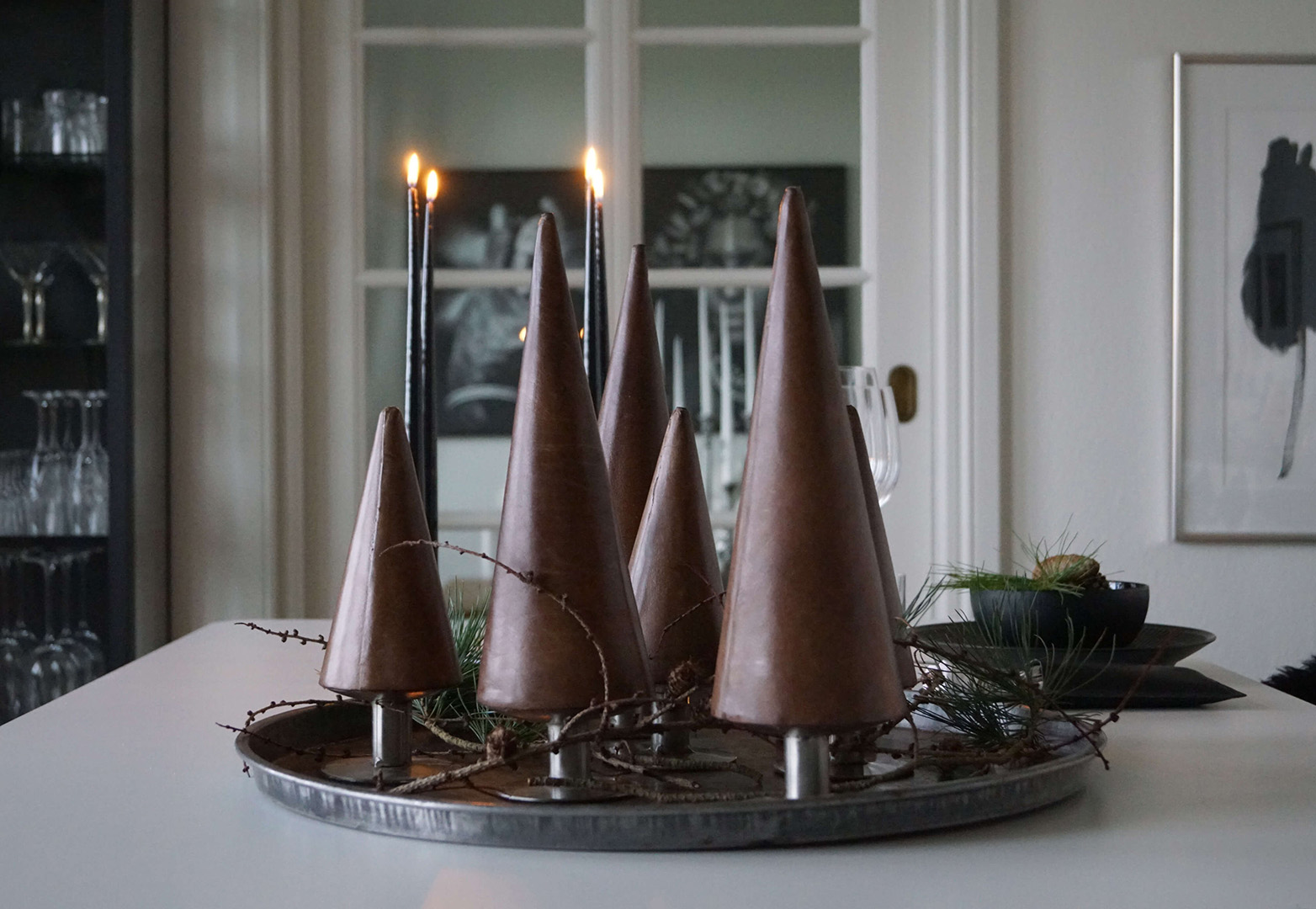Ein außergewöhnlicher und dekorativer Weihnachtsbaum in schlichtem Design, und mit braunem Leder bezogen. Der Baum steht auf einem soliden Eisenfuß, der für Stabilität sorgt und einen rauen Kontrast zur warmen Lederoberfläche bildet. Perfekt als stilvolle Weihnachtsdekoration, die sowohl allein als auch in Kombination mit Materialien wie Holz, Glas und Metall wirkt. Ein kleines Statement-Piece, das Weihnachtsstimmung auf moderne Weise vermittelt.