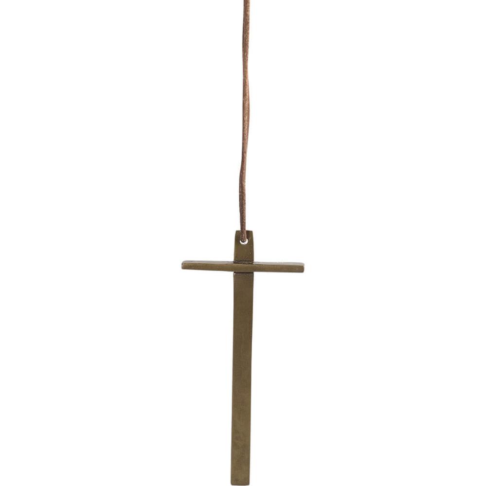 Ein stilvolles Kreuz aus Eisen, lackiert in einem warmen Antik-Messing-Farbton, der zugleich ein edles und rohes Erscheinungsbild verleiht. Das Kreuz ist mit einer Lederschnur versehen, die das schlichte Design unterstreicht und das Aufhängen erleichtert. Verwenden Sie es als dekoratives Detail an der Wand oder als kleines Display auf einem Tisch. Ein zeitloses Symbol, das Ihrer Einrichtung Atmosphäre und Charakter verleiht.