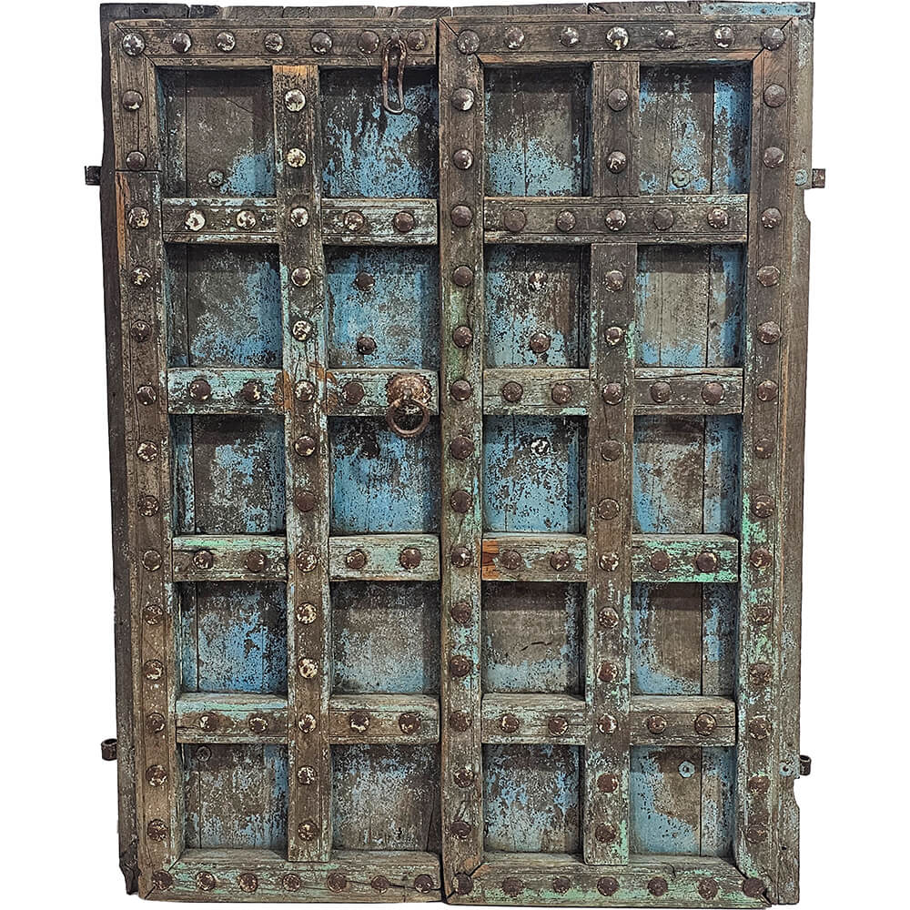 Diese rustikale Tür ist voller Charakter und roher Details. Die abblätternde blaue Farbe sorgt für einen lebendigen, patinierten Ausdruck, bei dem die Holzoberfläche und die Spuren der Zeit deutlich hervortreten. Die vielen kräftigen Eisenbeschläge und Nieten unterstreichen die solide Konstruktion der Tür und verleihen ihr einen markanten, beinahe industriellen Look. Das Farbspiel variiert harmonisch zwischen Blau, Grau und dunklen Holztönen und macht die Tür zu einem natürlichen Blickfang im Raum. Sie eignet sich hervorragend als dekoratives Element an der Wand oder für eine kreative Wiederverwendung in Ihrem Zuhause, Geschäft oder Café. Eine Tür mit viel Persönlichkeit, die der Einrichtung Wärme, Charakter und Geschichte verleiht und leicht zum ersten Hingucker wird.