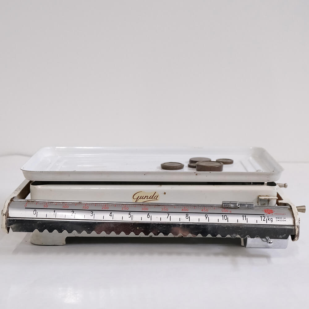 Alte Küchenwaage von der schwedischen Marke Gunda mit emaillierter weißer Schale, Chromdetails und einer gut lesbaren Skala bis 12 kg. Ein schönes und funktionales Designstück, das einen Hauch Nostalgie in Ihre Küche oder Einrichtung bringt. Perfekt als dekoratives Detail auf einem Regal, Tisch oder in einem Laden mit Vintage-Atmosphäre.