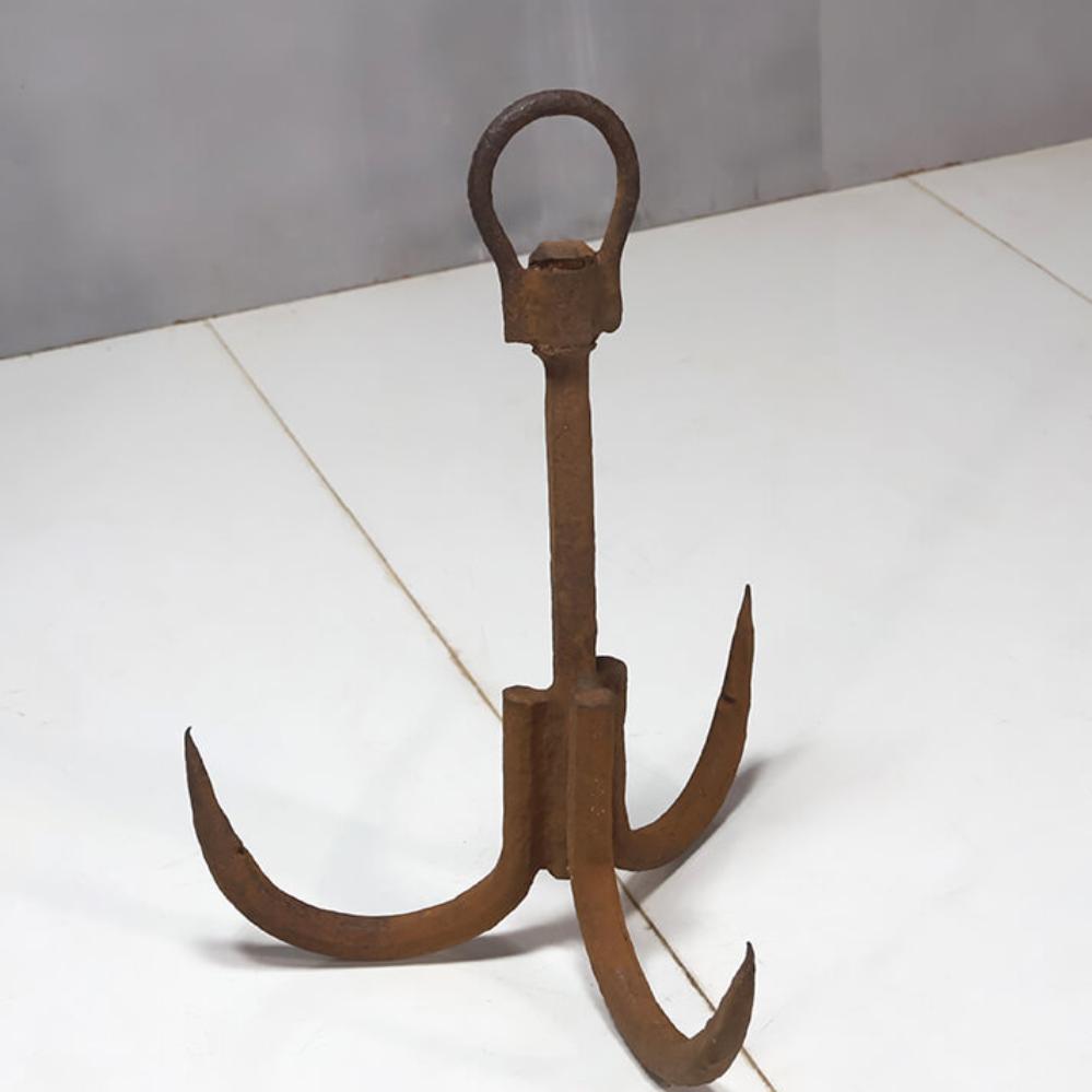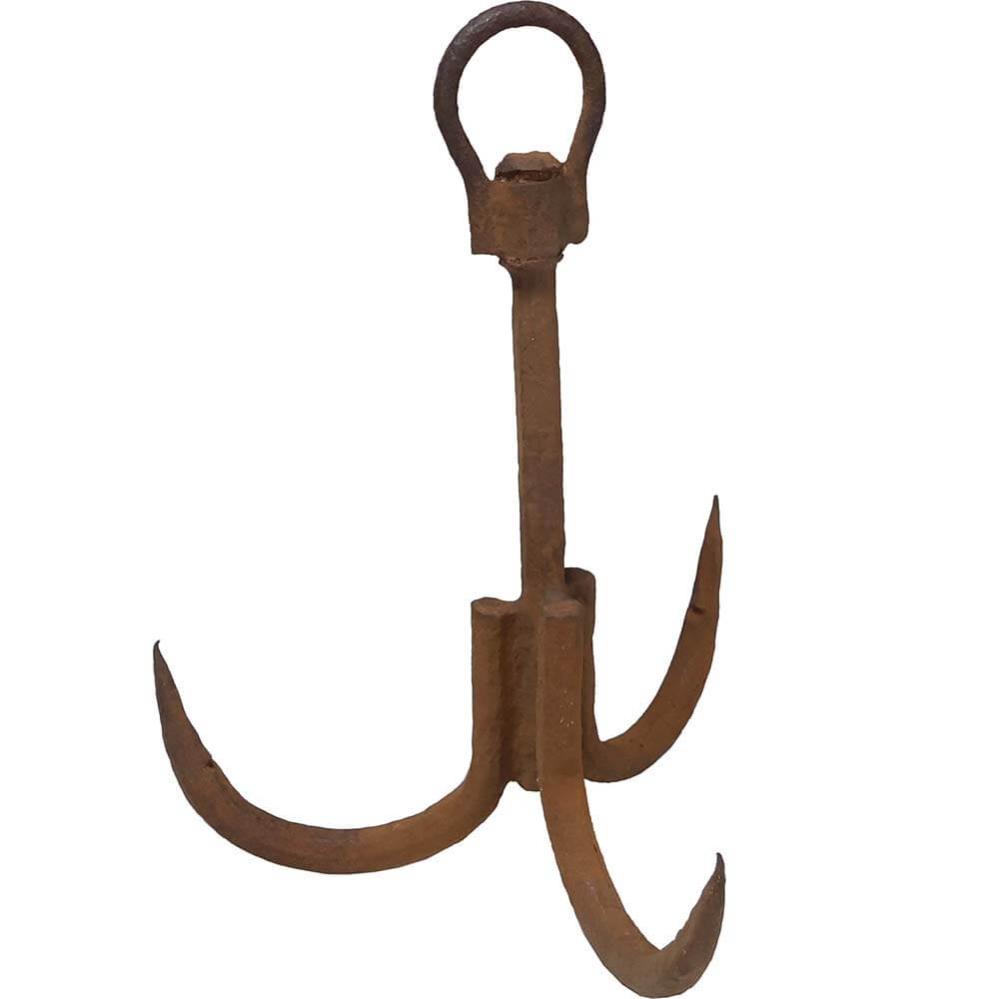 Dieser rostbraune Schiffsanker hat eine robuste, maskuline Ausstrahlung mit drei kräftigen Haken, die scharf nach oben zeigen. Das rustikale und abgenutzte Aussehen zeugt von vielen Jahren harter Arbeit auf See und macht ihn zu einem dekorativen Stück für eine maritime oder industriell inspirierte Einrichtung.
