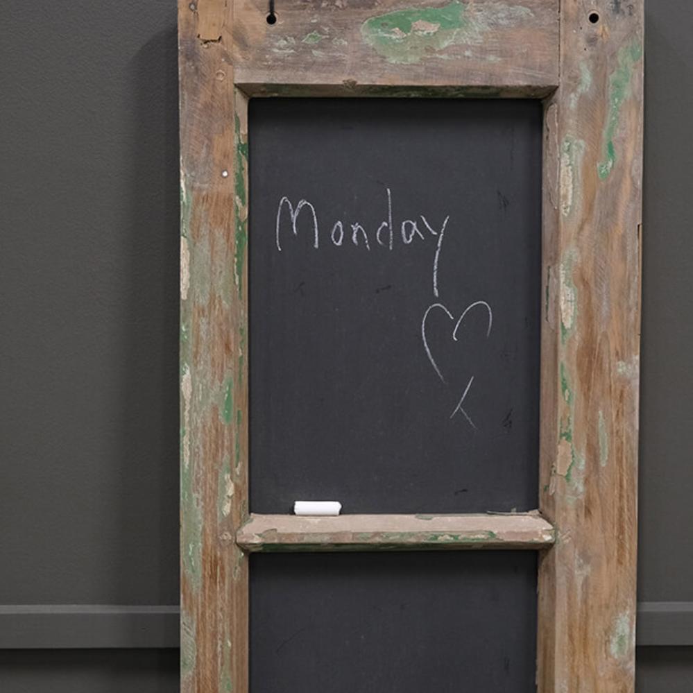 Diese charmante Tafel wurde aus einem alten Fensterrahmen gefertigt, der ein neues Leben erhalten hat. Der rohe Holzrahmen mit Spuren von Patina und alter Farbe verleiht der Tafel einen reizvollen Vintage-Look, der jedem Raum Charakter verleiht. Die vier separaten Tafelfelder bieten viel Platz, um Notizen zu schreiben, Listen zu erstellen oder kleine Nachrichten zu hinterlassen – perfekt für Cafés, Geschäfte oder das Zuhause, wo die Tafel sowohl praktisch als auch dekorativ genutzt werden kann. Dank ihres schlanken, vertikalen Designs lässt sich die Tafel problemlos an der Wand anbringen, ohne viel Platz einzunehmen. Eine stilvolle Möglichkeit, recycelte Materialien in Ihre Einrichtung zu integrieren.