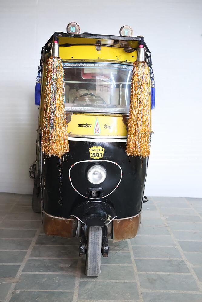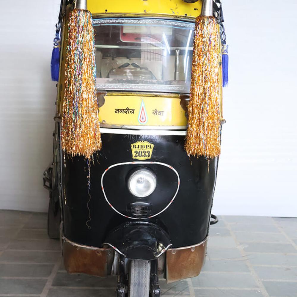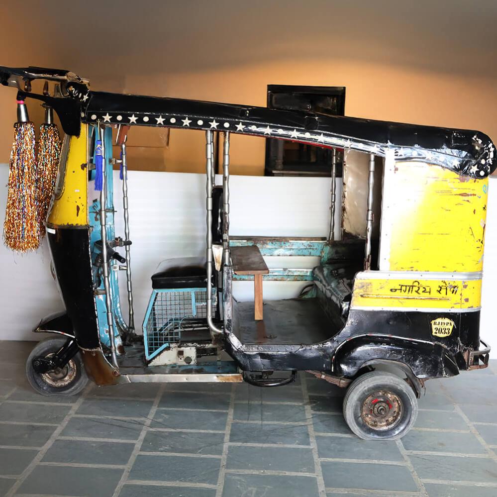 Es heißt ein Tuk-Tuk – und so klingt es auch. Es ist einen Dreiradwagen, der in vielen asiatischen Ländern, einschließlich Indien, als Taxi verwendet wird. Mit Wind im Haar und unter Lebensgefahr flitzen Sie im Slalom zwischen Autos, Lastwagen, Motorrädern, Fahrrädern, losen Kühen und Hunden auf den stark befahrenen Straßen in Indien. Dieses unverwechselbare Fahrzeug ist für viele Reisende in Asien ein besonderes Erlebnis. Das Tuk-Tuk wird auch Rickshaw genannt. Wir haben dieses gebrauchte Tuk-Tuk gefunden, den Motor ausgebaut und jetzt kann es Ihnen gehören. Es hat einen wunderbar farbenfrohen und humorvollen Ausdruck - erfordert viel Platz, verleiht aber im Gegenzug eine Einzigartigkeit und ist ein Hingucker in Ihrem Geschäft.