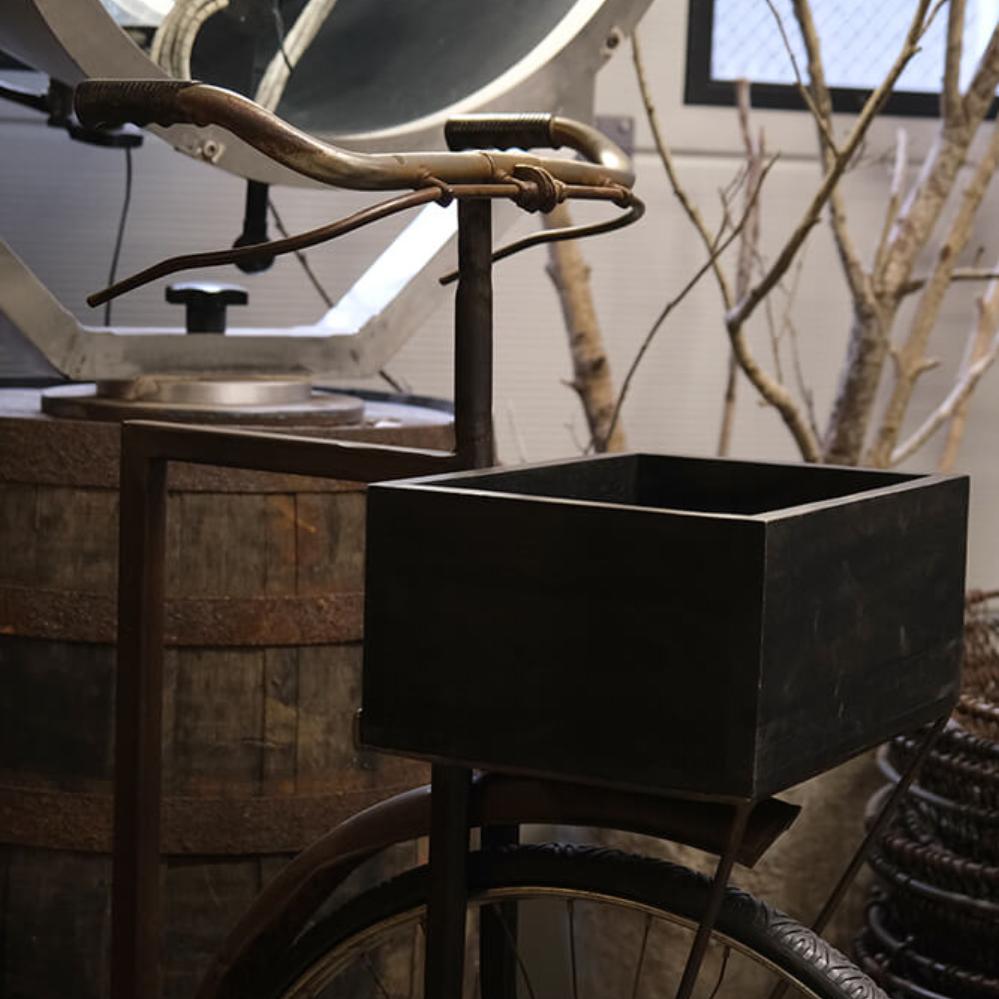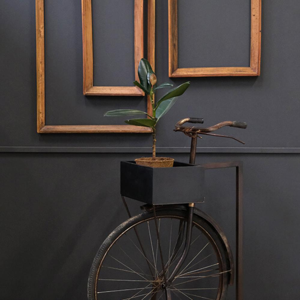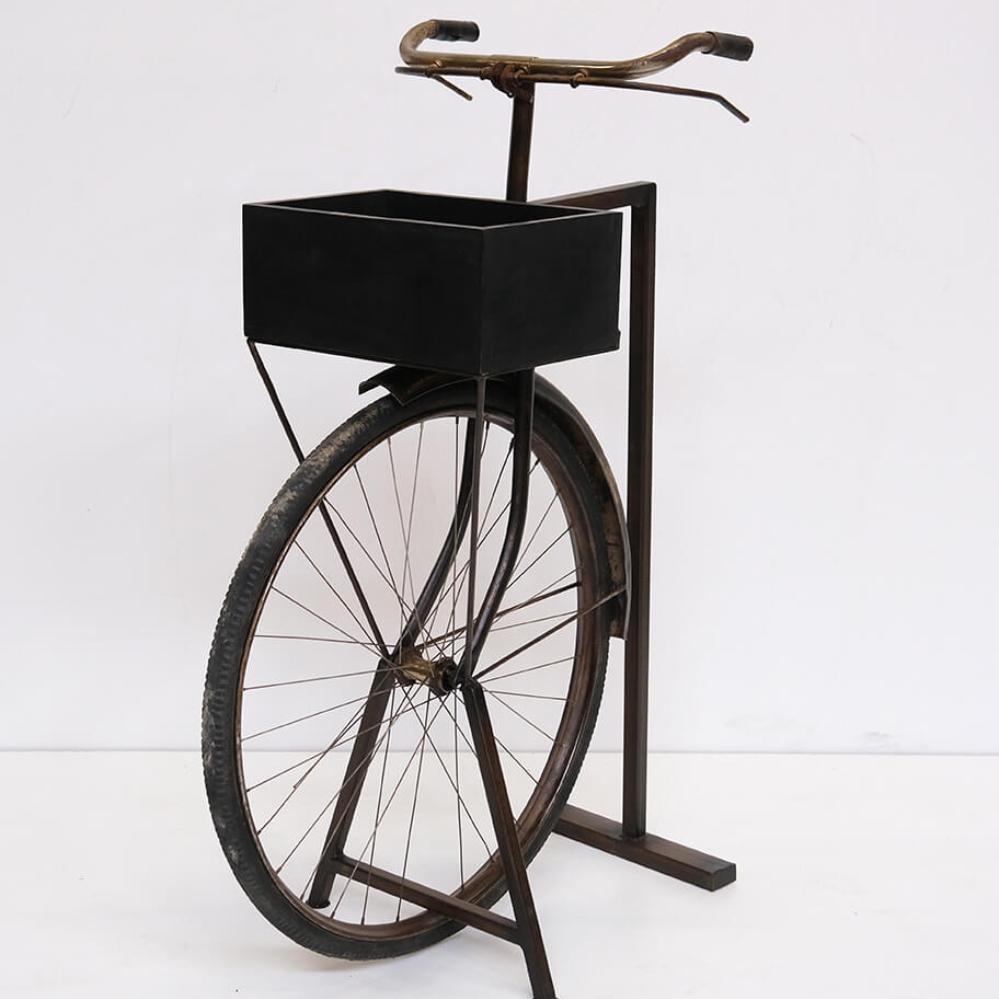 Schöner und lustiger Blickfang, der aus der Front eines alten Fahrrads hergestellt wurde. Das alte, unbewegliche Fahrrad hat eine wundervolle Patina und wurde in einen Bodenständer mit einer schwarz lackierten Kiste vorne verwandelt, die beispielsweise in einem Restaurant für Speisekarten, in Ihrem Geschäft für Prospekten oder bei einer Veranstaltung für Wasserflaschen verwendet werden kann. Sie können ihn natürlich auch einfach als Blickfang verwenden, so wie er ist, oder mit grünen Pflanzen dekorieren.