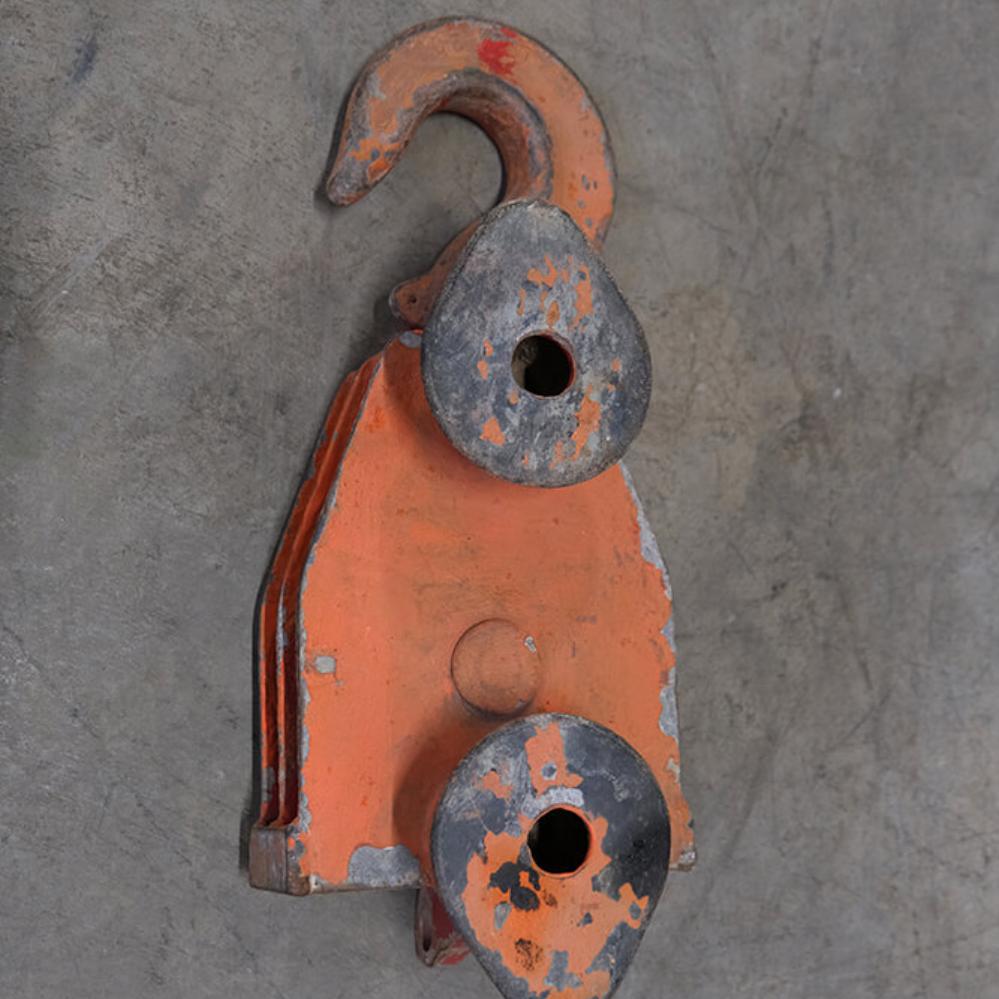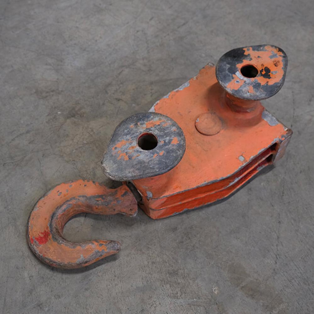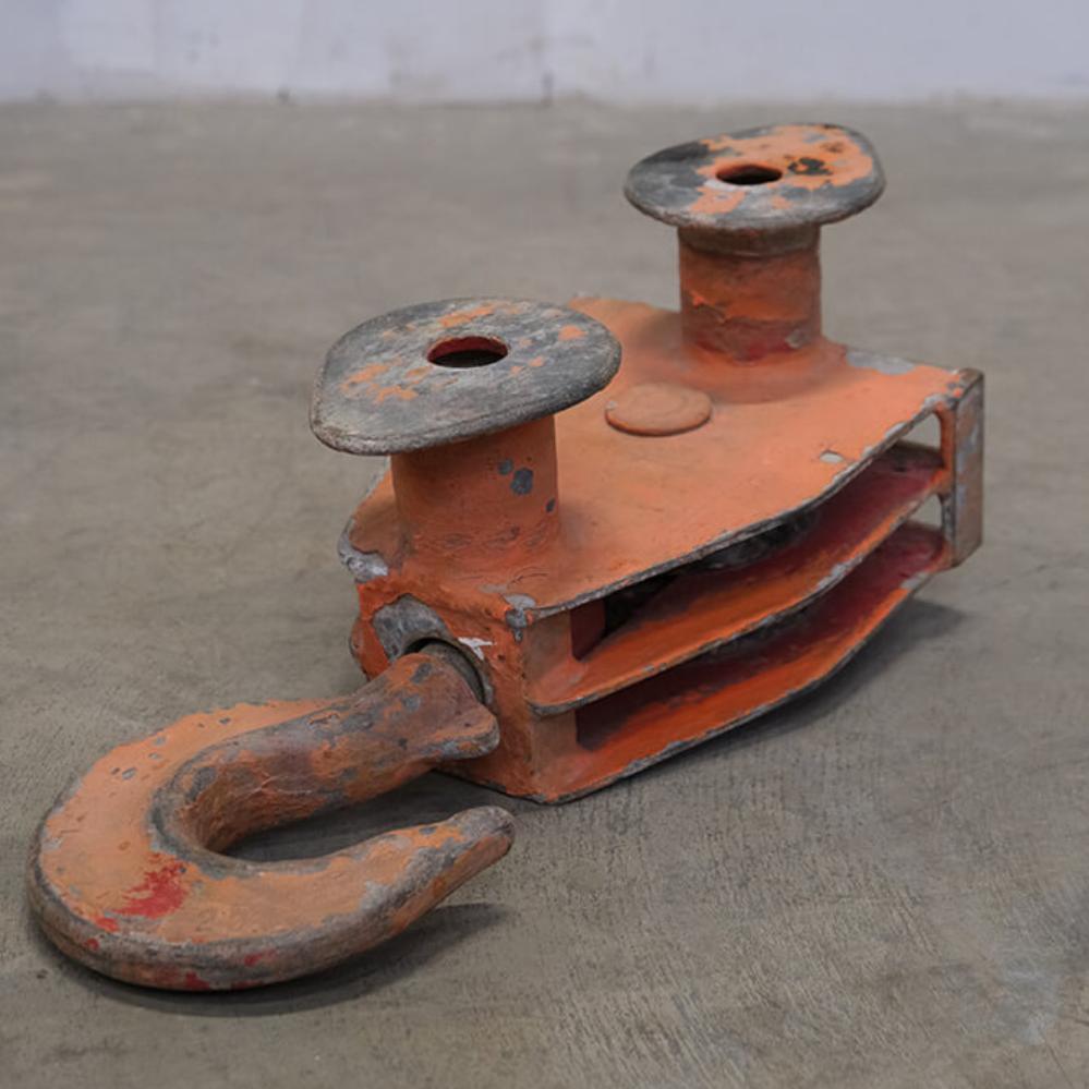 Diese Vintage-Schiffsrolle ist mit Doppelrädern und einem charakteristischen Haken ausgestattet. Ihre Oberfläche zeigt Spuren jahrelanger Nutzung auf dem offenen Meer, mit einer charmanten Abnutzung und einer rot-orangefarbenen Oberfläche. Perfekt als Gesprächsstarter in einer rustikalen oder industriellen Einrichtung.