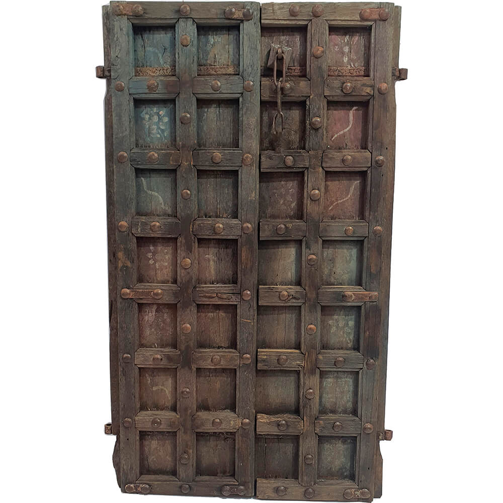 Diese alte Holztür ist voller Charakter und schöner Details. Sie besteht aus kräftigen Holzfüllungen mit vielen originalen Eisennägeln, die der Tür einen soliden und authentischen Ausdruck verleihen. Die Oberfläche zeigt eine schöne Patina mit Spuren der Zeit, Abnutzung und gedämpften Farbtönen, die jedes Detail lebendig wirken lassen. Das originale Schloss und die Eisenbeschläge unterstreichen die Geschichte der Tür und machen sie ideal als dekoratives Element in der Einrichtung, sei es als Wanddekoration, Raumteiler oder markanter Blickfang.