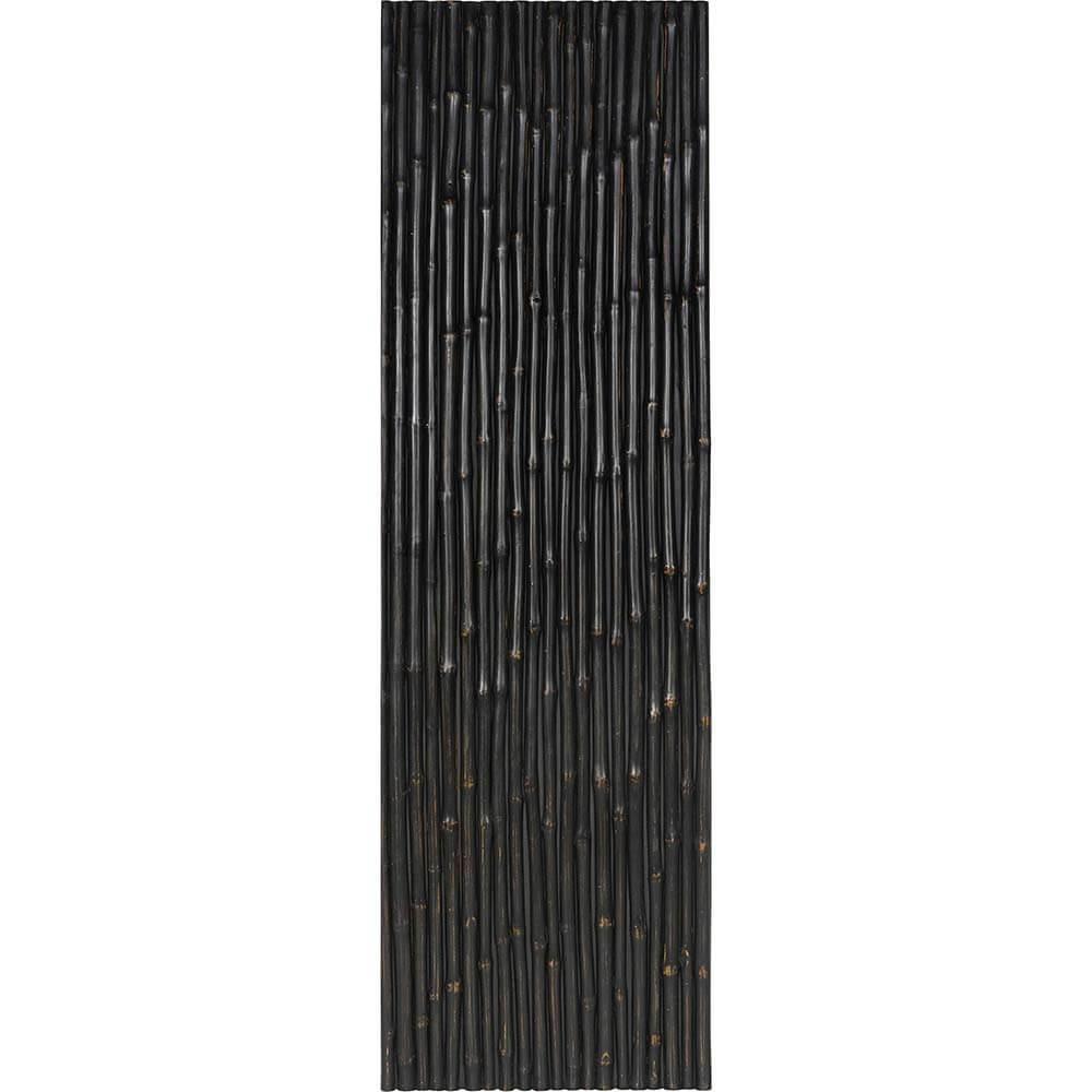 Diese Wandplatte ist mit schwarzen Bambusrohren verkleidet, was ihr ein grafischeres und dramatischeres Aussehen verleiht. Die dunklen Bambusrohre sind halbiert und eng aneinander gesetzt, wodurch eine stilvolle Struktur mit einem modernen Touch entsteht. Trotz der Farbe bleibt die natürliche Textur und Unregelmäßigkeit des Bambus sichtbar, was ein interessantes Spiel aus Licht und Schatten erzeugt. Diese Wandplatte ist perfekt für eine Einrichtung, die minimalistische, aber dennoch exotische und raffinierte Tiefe sucht. Die schwarze Farbe macht sie sowohl für moderne als auch industrielle Umgebungen geeignet, wo sie als Rückwand oder dekoratives Paneel dienen kann.