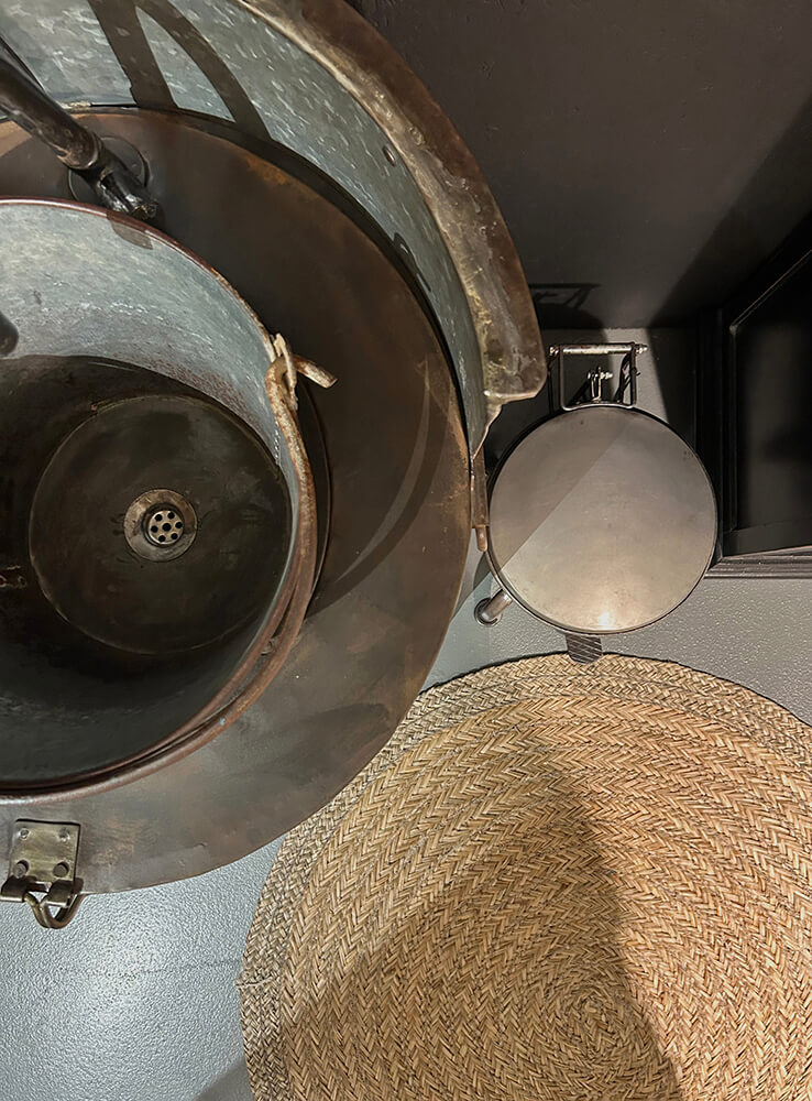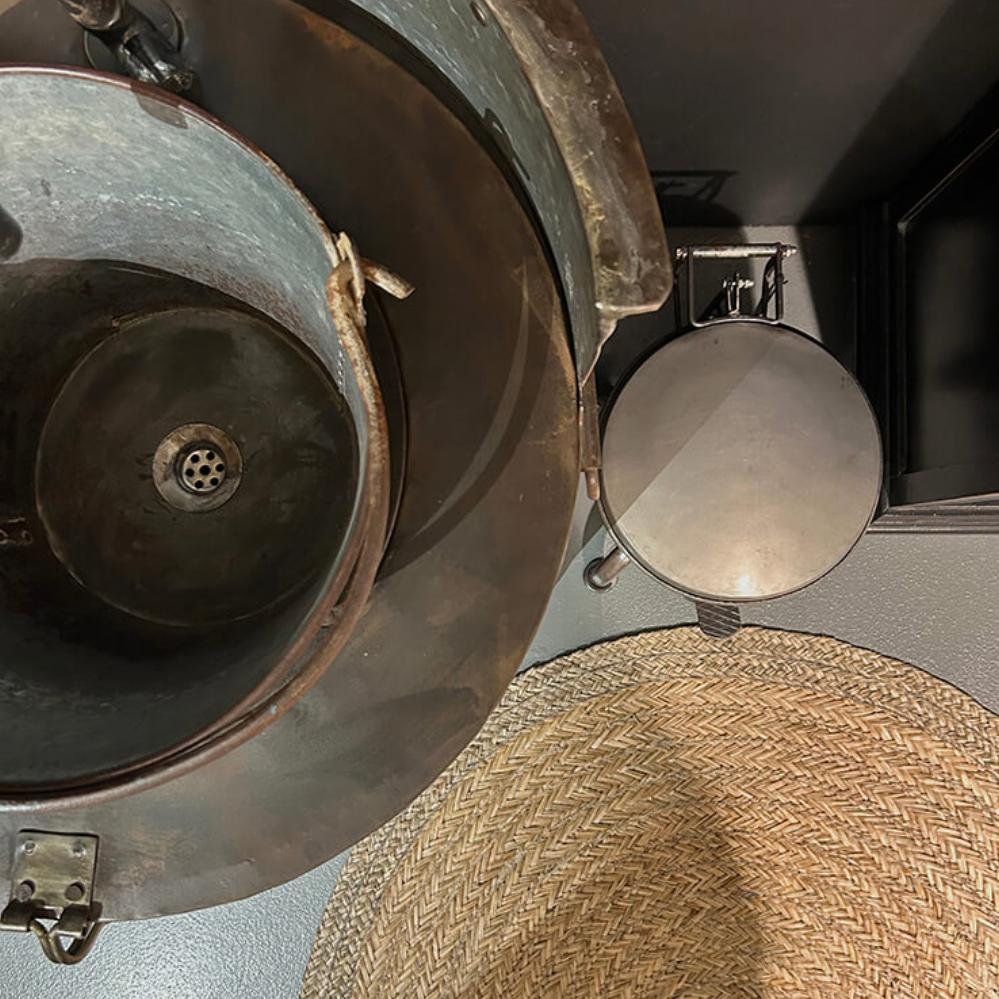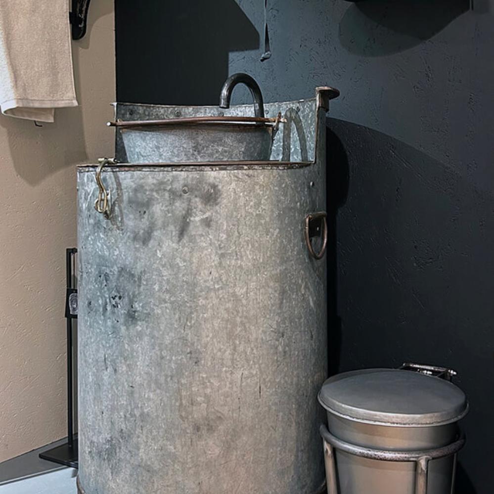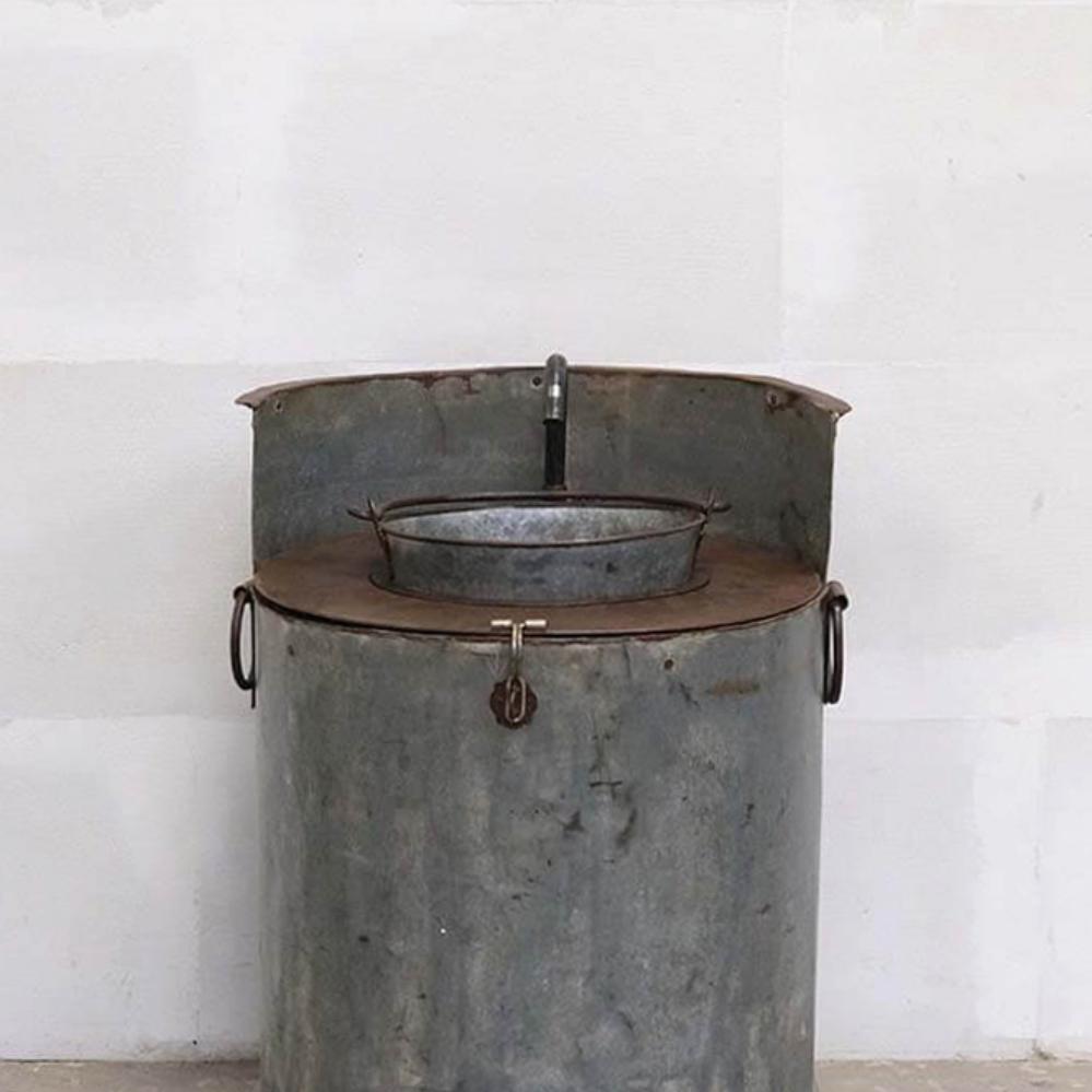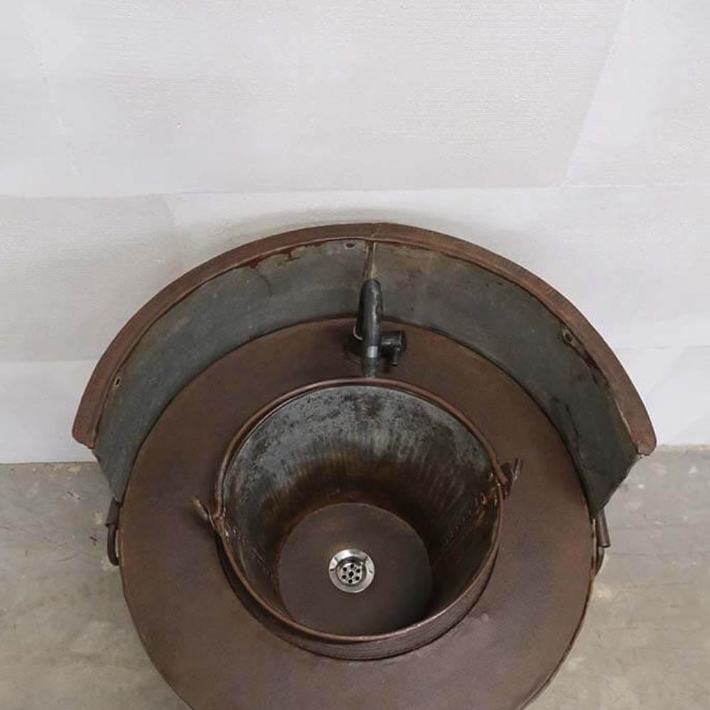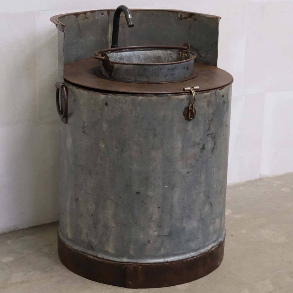 Wunderschönes patiniertes Waschbecken, das in ein großes altes Eisenfass integriert ist, das ihm ein rohes Aussehen verleiht. Das Waschbecken selbst ist ein alter Zinkeimer mit einem Abflusssieb unten. Das Waschbecken ist für den Außenbereich geeignet, da das Wasser direkt herausfließt. Der Eimer lässt sich aufnehmen und entleeren. Inklusive Wasserschlauch für Wasseranschluss.