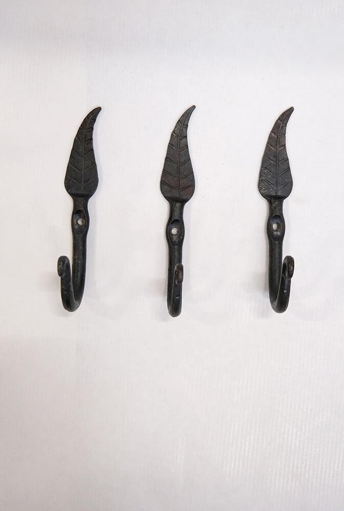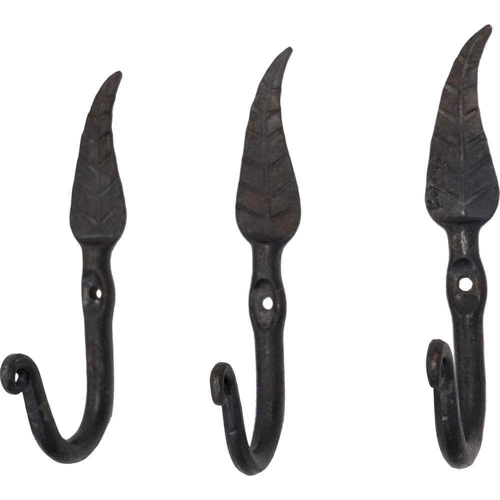 Dieser Eisenhaken ist mit einem einfachen Blattmotiv an der Oberseite verziert, was ihm einen natürlichen und organischen Ausdruck verleiht. Das fein gearbeitete Blatt ist mit eingravierten Adern detailliert. Der Haken besteht aus solidem Eisen mit einer dunklen Patina, die ihm ein raues und rustikales Aussehen verleiht. Mit seinem geschwungenen Haken darunter ist er sowohl dekorativ als auch praktisch zum Aufhängen von Jacken, Schlüsseln oder Handtüchern. Der Eisenhaken ist perfekt, um einen Hauch von Natur in Ihren Flur, Ihre Küche oder Ihr Badezimmer zu bringen.