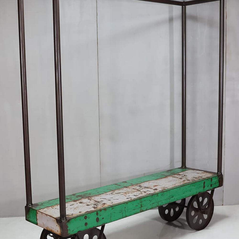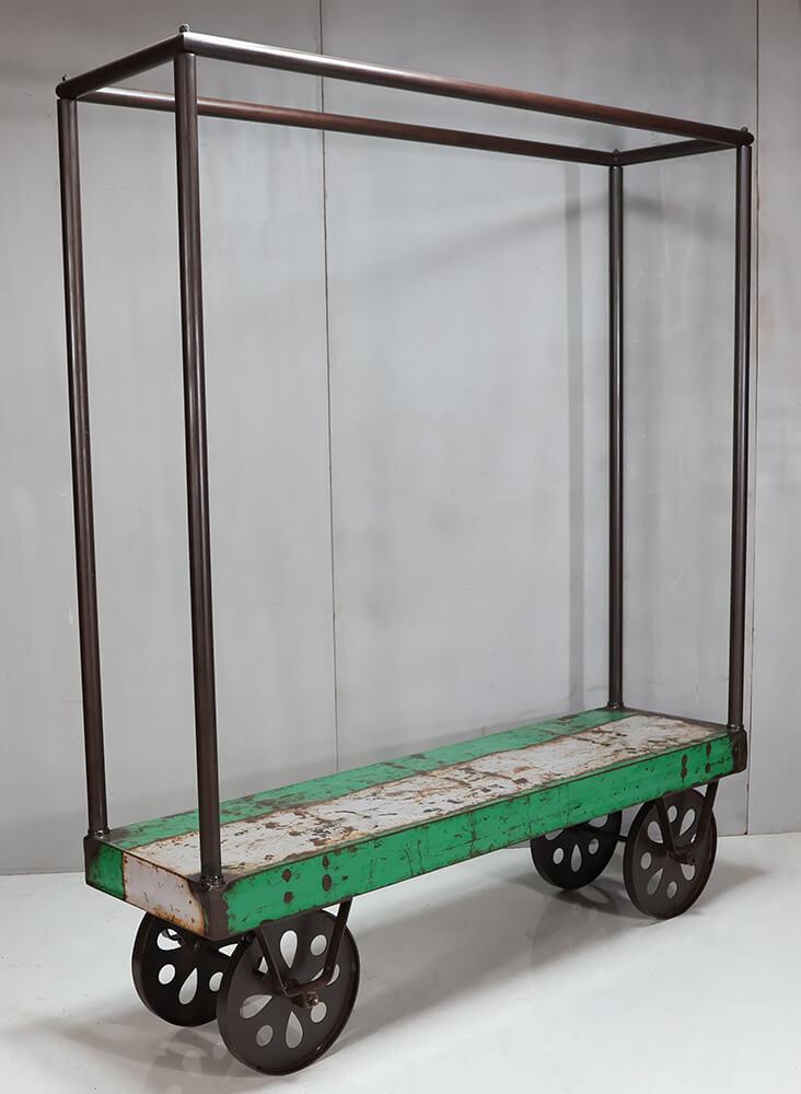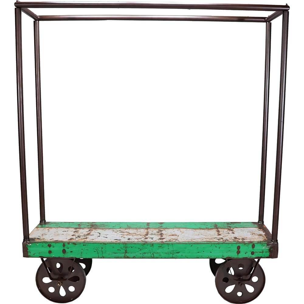 Dieser rohe und tolle industrielle Kleiderständer im rustikalen Fabrikstil ist ein echter Blickfang. Gefertigt aus Eisen mit Klarlack, betont er seinen authentischen, patinierten Look. Die Platte mit grünen und weißen Nuancen trägt deutliche Spuren ihrer Geschichte, die dem Kleiderständer viel Persönlichkeit verleiht. Die großen, markanten Eisenräder unterstreichen den industriellen Charakter und machen ihn einfach beweglich. Perfekt für ein Geschäft, ein Showroom oder als markantes Element in der Raumgestaltung. Eine außergewöhnliche Lösung für alle, die Möbel mit Charakter und Charme lieben.