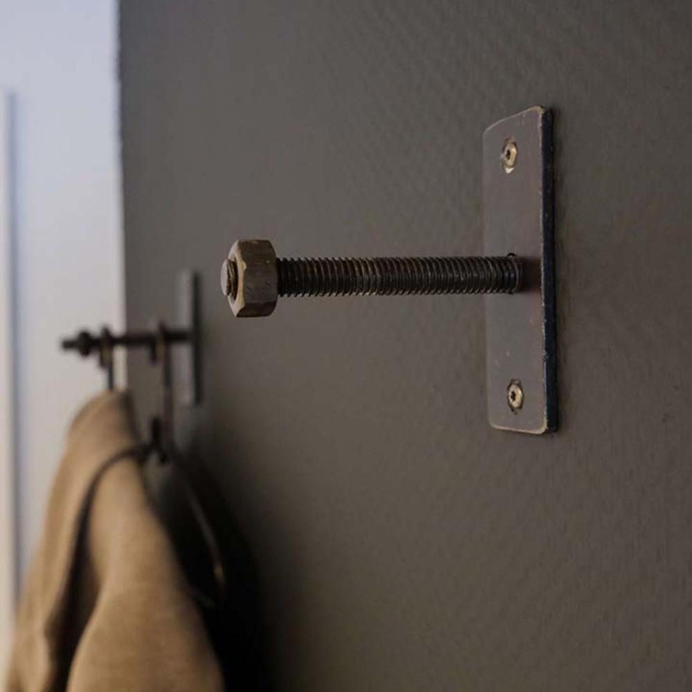 Haken aus Eisen. Mit seinem einfachen und industriellen Design ist dieser kleine seltsame Haken sowohl ein Blickfang als auch sehr funktional. Kann in allen Räumen des Hauses verwendet werden. In der Küche für Geschirrtücher und Küchenutensilien, im Badezimmer für Handtücher und Schmuck, im Wohnzimmer für Bilder und andere Dekorationen und in der Eingangshalle für Schals und Taschen. Ein einzigartiger Haken mit so vielen Möglichkeiten. Die kleine Eisenplatte ist mit zwei Löchern ausgestattet, damit sie sicher an der Wand montiert werden kann. Sie können ihn nach Ihrer Wahl sowohl vertikal als auch horizontal aufhängen.