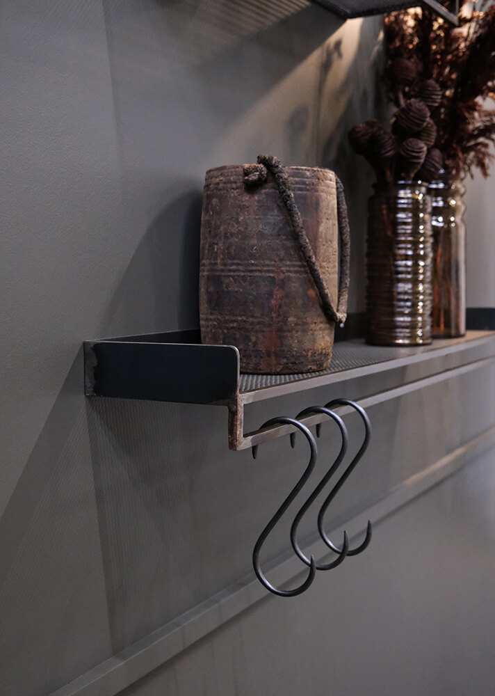 Einfacher, aber unverzichtbarer S-Haken aus schwarzlackiertem Eisen. Die stabile Konstruktion macht ihn ideal für praktische Aufbewahrung und dekorative Aufhängungen. Verwenden Sie ihn in der Garderobe, in der Küche oder in der Werkstatt – die Einsatzmöglichkeiten sind vielfältig. Erhältlich in den Größen Small und Large.