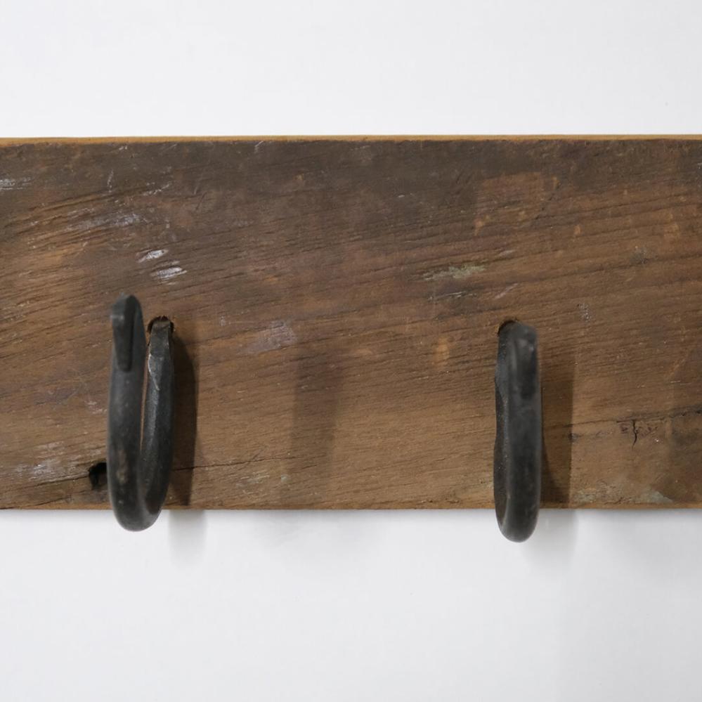 Wandgarderobe aus Altholz mit zwei Eisenhaken. Die Garderobe hat 2 Beschläge. Hängen Sie sie im Flur für Oberbekleidung oder Taschen, im Schlafzimmer für den Bademantel, in der Küche für Geschirrtücher oder im Badezimmer für Handtücher auf. Der Haken hat einen Ausdruck, der sehr gut zum nordischen Stil passt.