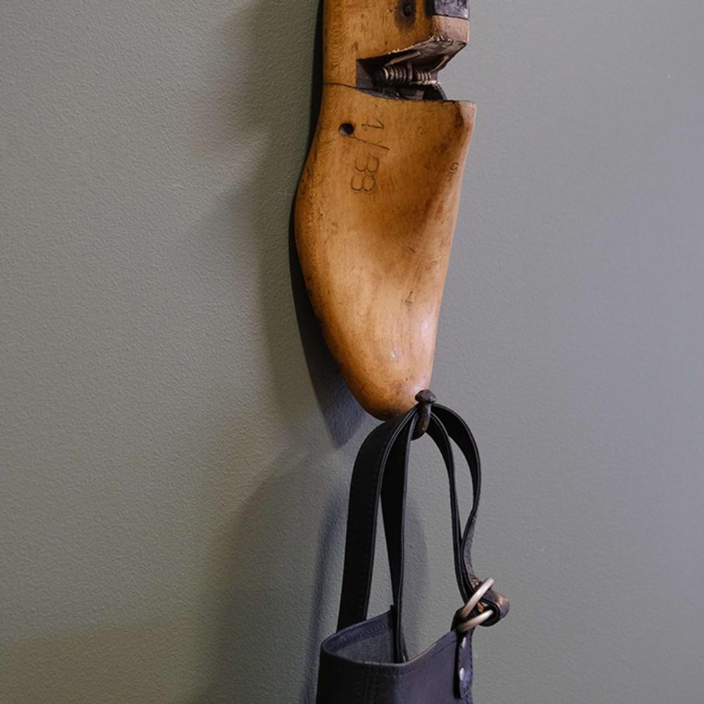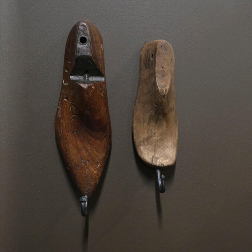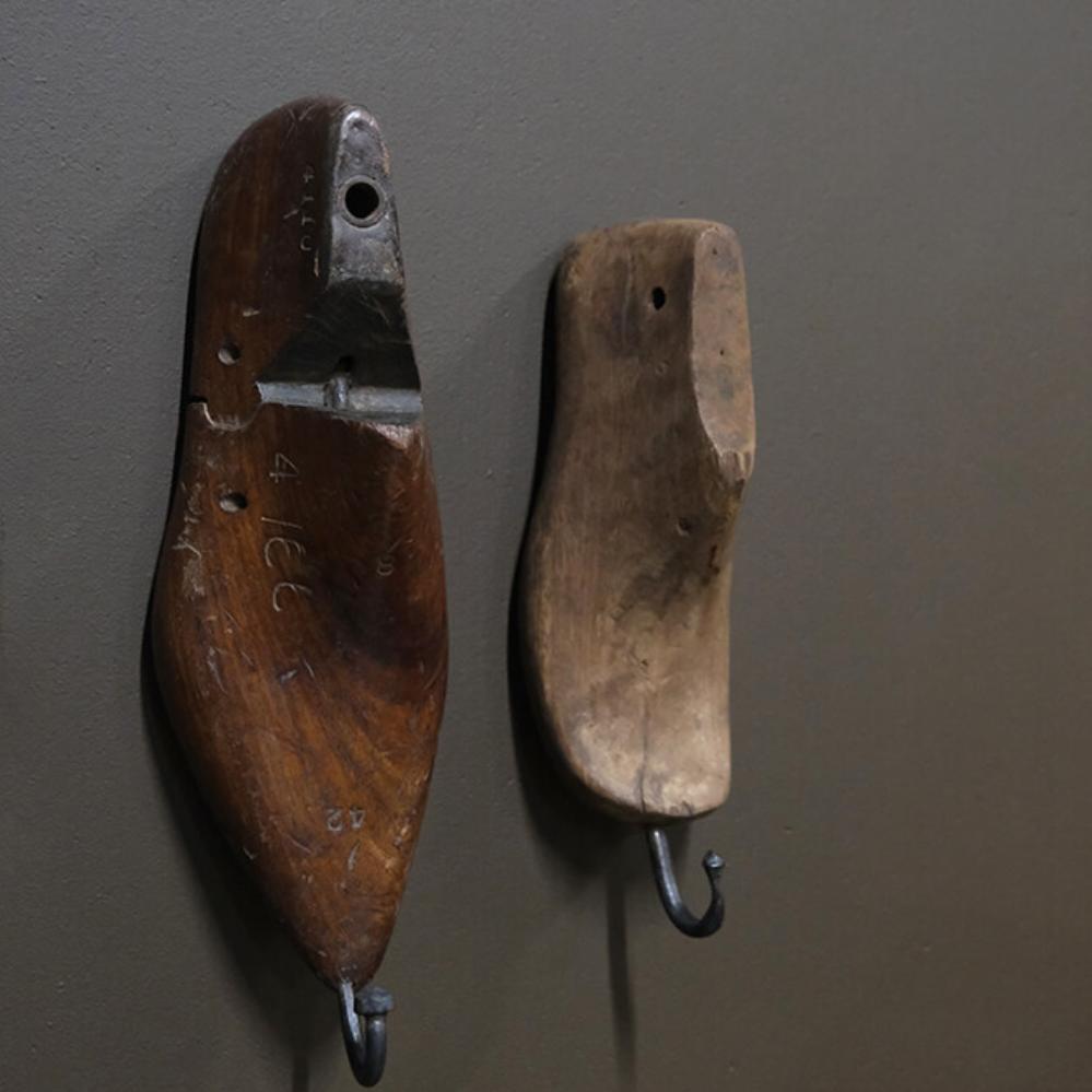 Alter einzigartige Holzschuhleisten mit 1 Eisenhaken. Der Haken eignet sich zum Aufhängen von Schals, Jacken und Accessoires. Diese alten Schuhleisten wurden früher bei der Herstellung von Schuhen verwendet. Heutzutage werden häufig Kunststoffleisten verwendet, da diese im Gegensatz zu Holz nicht durch Feuchtigkeit beeinflusst werden und daher ihre Form behalten. Die Garderobe ist die perfekte Wahl, wenn Sie ein Fan von natürlichen Materialien sind und ein natürliches, einzigartiges und rustikales Dekor wünschen.