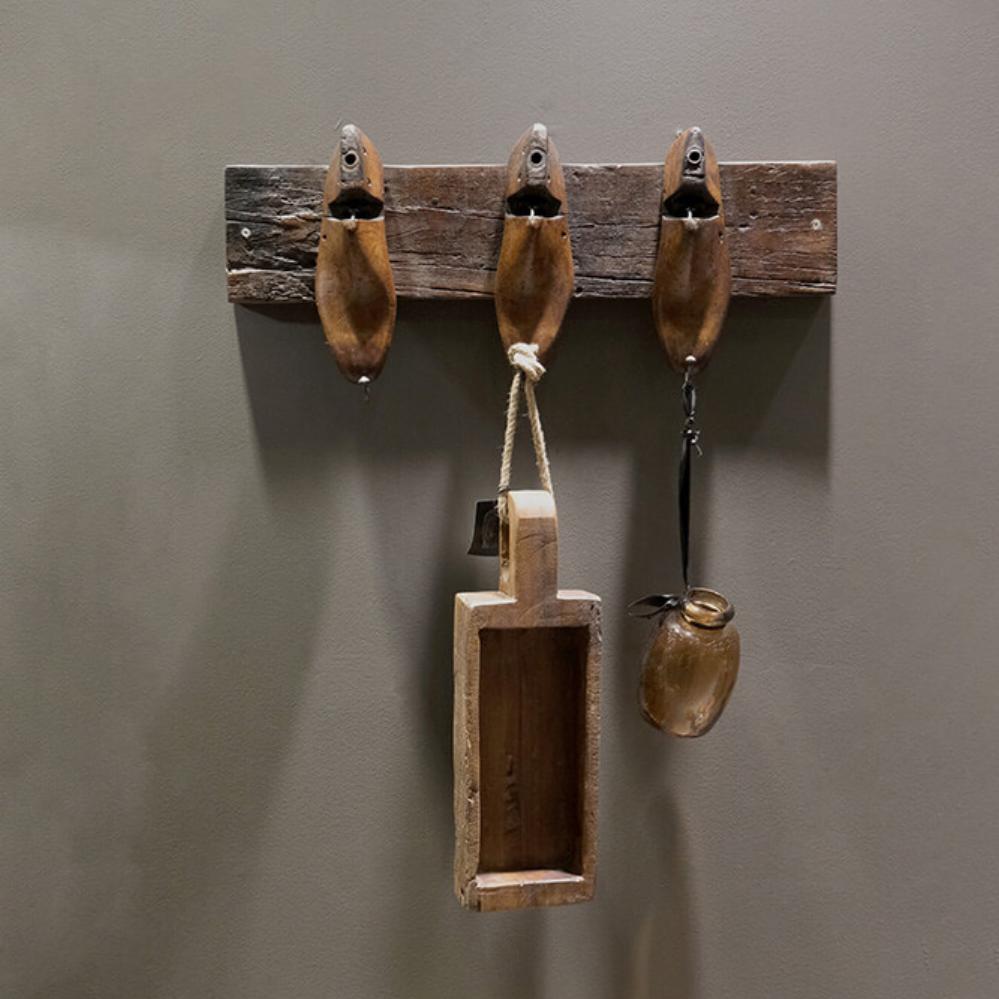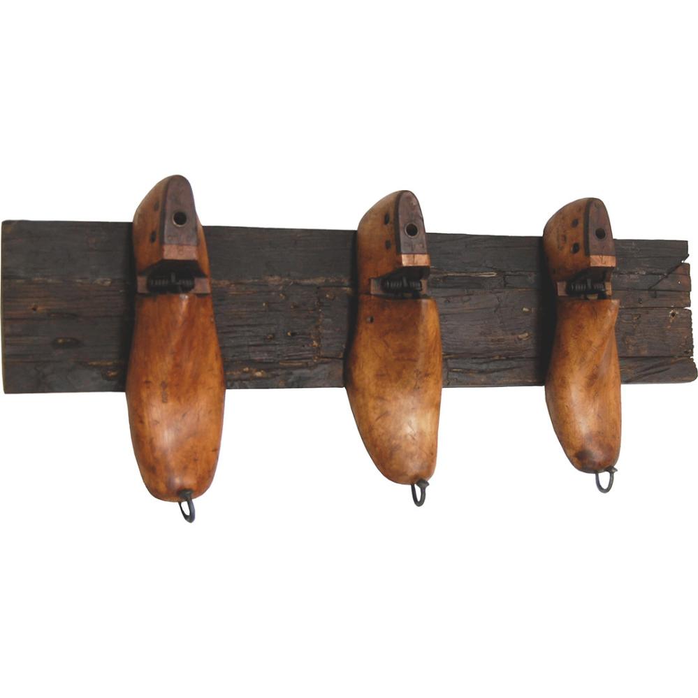 Für die Herstellung dieser Wandgarderobe wurden 3 originale Holzschuhleisten verwendet, die auf einer massiven Altholz Planke montiert sind. An der Spitze jeder Schuhleiste ist ein Haken angebracht, damit sie zum Aufhängen von Kleider, Accessoires oder Kleiderbügeln geeignet sind. Diese alten Schuhleisten wurden früher bei der Herstellung von Schuhen verwendet. Heutzutage werden häufig Kunststoffleisten verwendet, da diese im Gegensatz zu Holz nicht durch Feuchtigkeit beeinflusst werden und daher ihre Form behalten. Die Garderobe passt in vielen Räumen sowohl zu Hause als auch bei der Einrichtung Ihres Unternehmens. Ist die perfekte Wahl, wenn Sie ein Fan von natürlichen Materialien sind und ein natürliches, einzigartiges und rustikales Dekor wünschen.