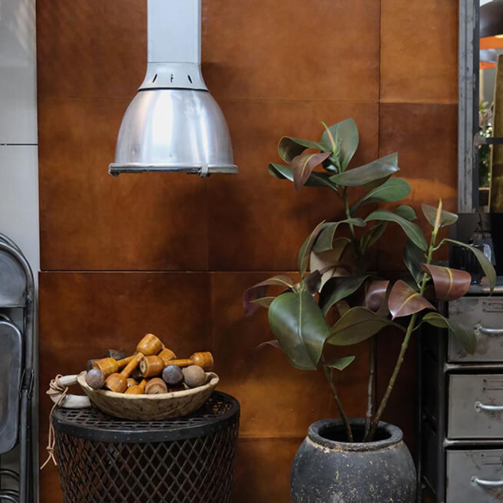 Diese rustikale Industrielampe ist ein echtes Fundstück für alle, die eine rohe und industrielle Einrichtung lieben. Sie ist aus Eisen gefertigt und überzeugt mit einer markanten Konstruktion und patinierten Details, die ihr viel Charakter verleihen. Mit ihrem robusten Design und dem breiten Schirm spendet die Lampe ein fokussiertes, kräftiges Licht – ideal über dem Esstisch, der Kücheninsel oder in einem Café, wo Sie ein urbanes Fabrikambiente schaffen möchten. Die schwere Kette unterstreicht den industriellen Look und sorgt zugleich für eine stabile Befestigung. Die Industrielampe kann als markanter Blickfang allein genutzt oder mit mehreren kombiniert werden, um eine konsequent industrielle Atmosphäre im Raum zu schaffen.