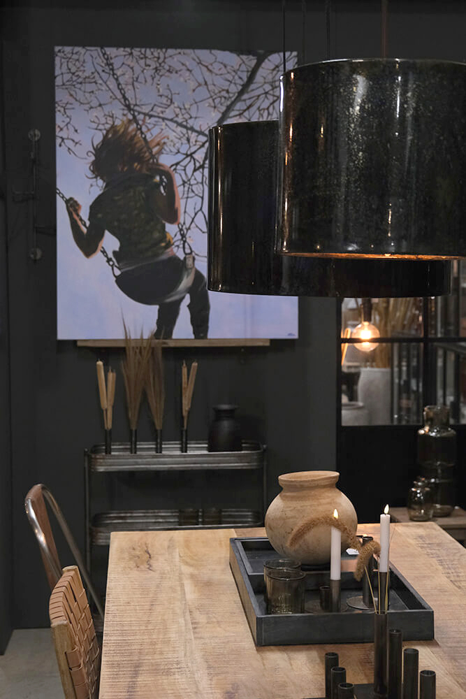 Diese große Jonah Deckenleuchte ist dafür gemacht, Eindruck zu hinterlassen. Die breite zylindrische Form aus Eisen in Kombination mit der dunkelblauen Marmorierung verleiht der Leuchte ein markantes und zugleich elegantes Erscheinungsbild, das der Einrichtung Tiefe verleiht. Dank ihrer großzügigen Größe eignet sie sich perfekt als Mittelpunkt über dem Esstisch, im Wohnzimmer oder in einem Café, in denen sie den Raum mit Licht und Atmosphäre füllt. Die dezent marmorierte Oberfläche sorgt für ein lebendiges Spiel im Metall und unterstreicht den einzigartigen Charakter der Lampe. Ein schwarzes Stoffkabel rundet das Design ab und schafft eine Balance zwischen rauem Industrie-Look und modernem Stil.