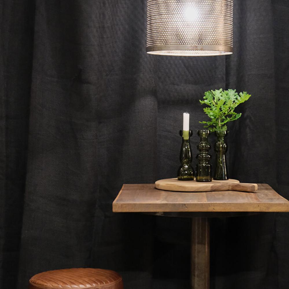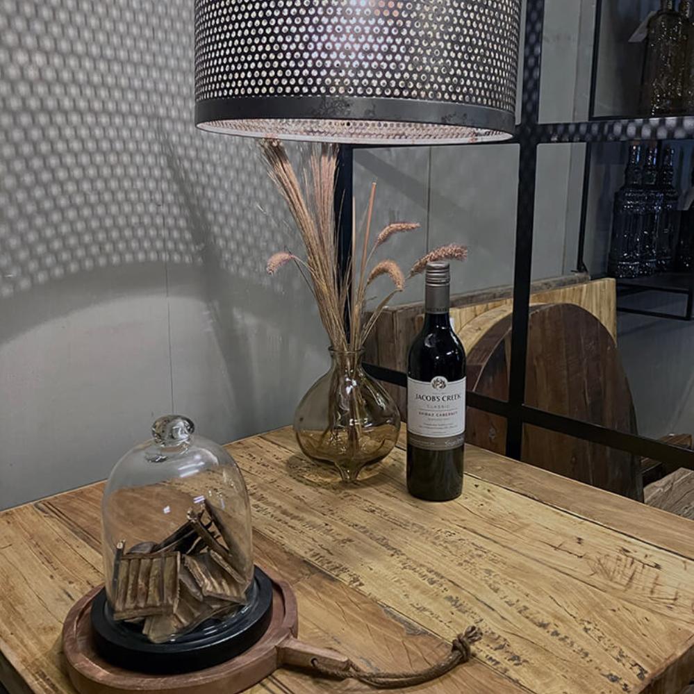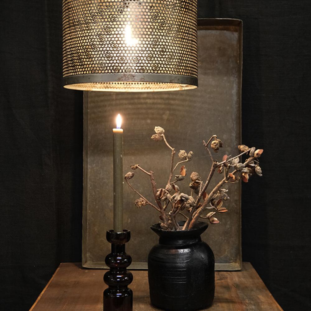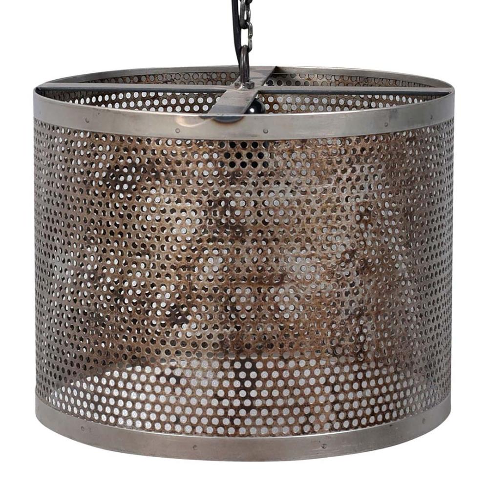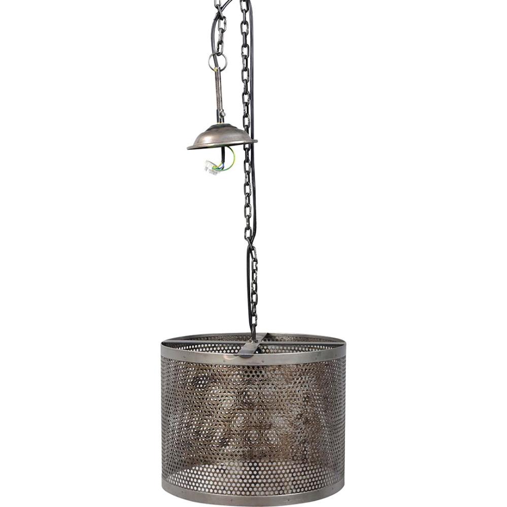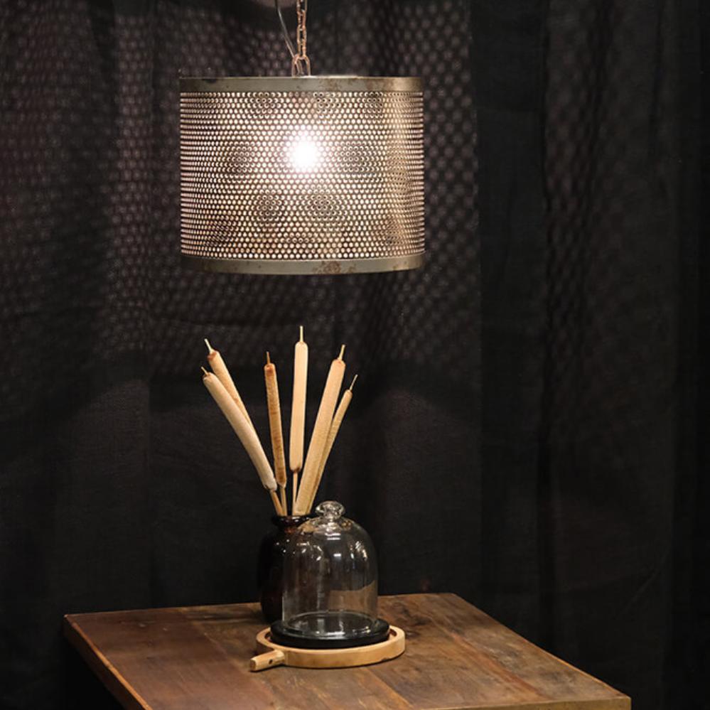 Kelly nimmt den meisten Leuten den Atem. Der patinierte und perforierte Schirm der rustikalen Eisenlampe verbreitet eine raue und industrielle Atmosphäre, egal welchen Raum sie beleuchtet. Am patinierten Lampenschirm und Baldachin ist eine Eisenkette befestigt, die der Leuchte einen besonders rustikalen Touch verleiht.