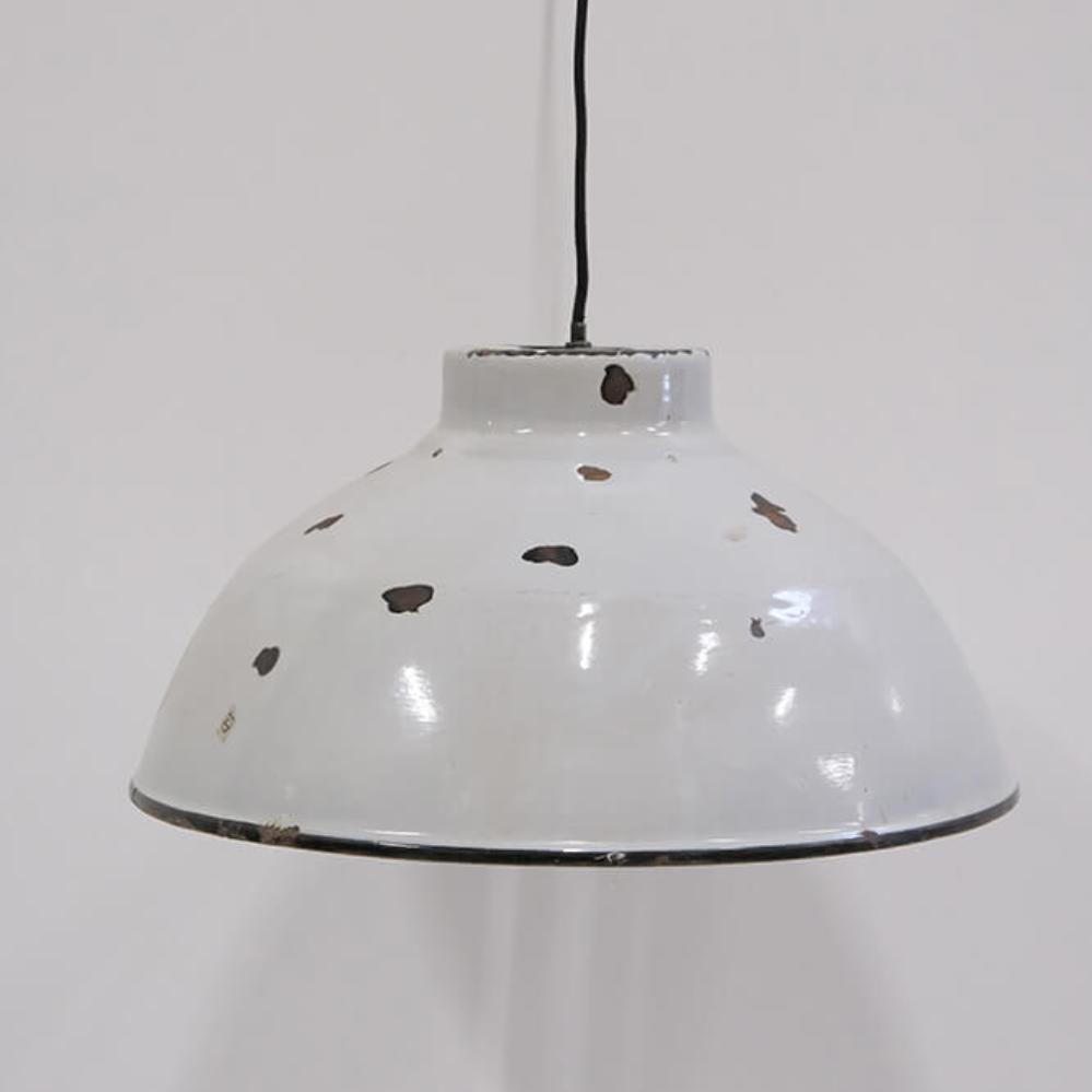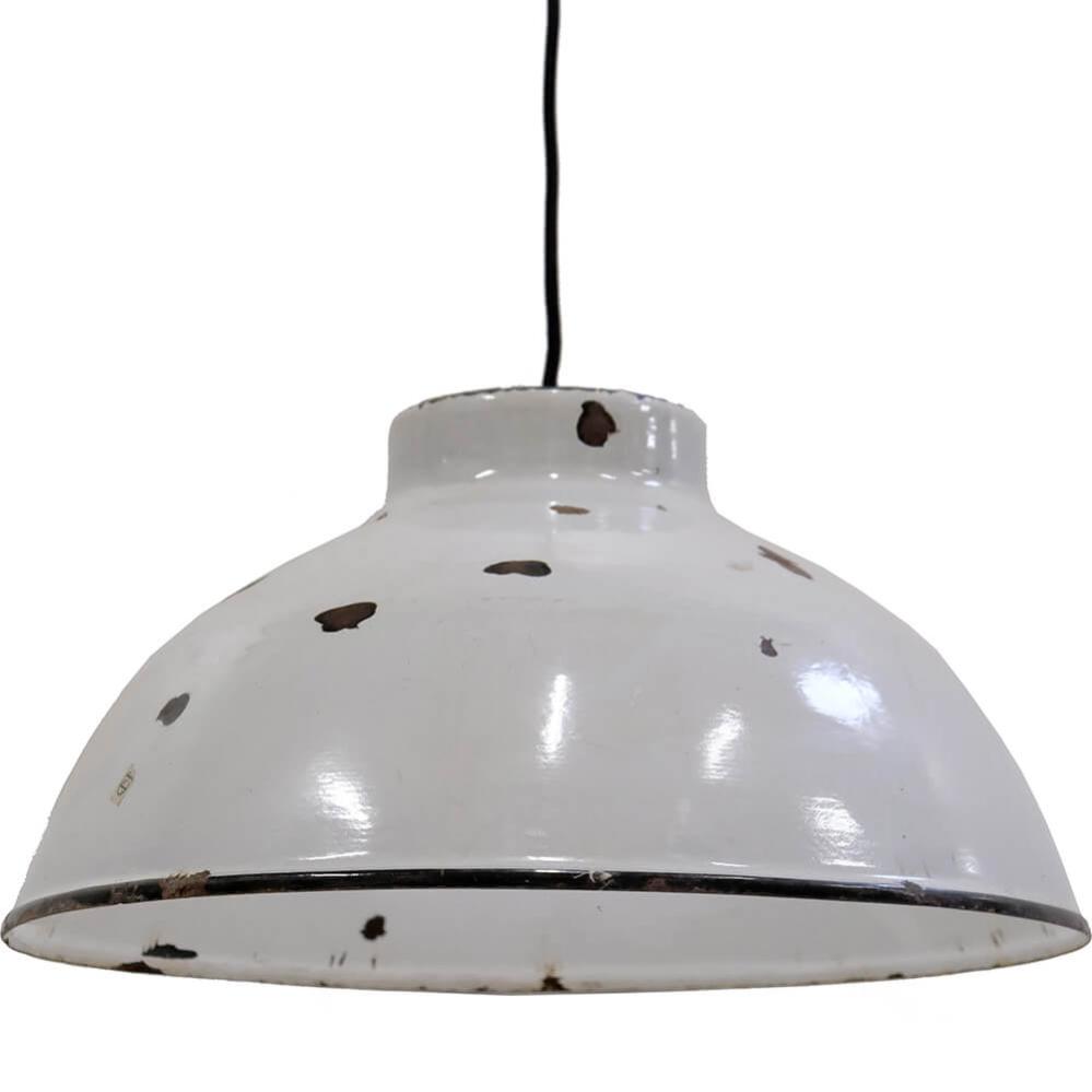 Diese große Deckenlampe mit heller Emaille ist ein fabelhaftes Beispiel für Industriedesign. Die Lampen strahlen einen rustikalen und authentischen look aus, und die Patina zeugt davon, dass sie eine Menge Geschichte mit sich bringen. Mit ihrer beeindruckenden Größe und robusten Ausdruck wird sie jedem Raum Charakter und Atmosphäre verleihen. Verleihen Sie Ihrem Zuhause einen industriellen Touch mit dieser Hängelampe.
